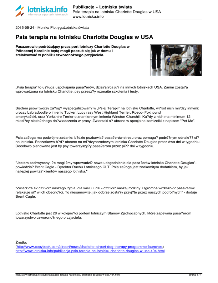 Publikacje » Lotniska świata Psia terapia na lotnisku Charlotte Douglas w USA www.lotniska.info 2015-05-24 - Monika PietrygaLotniska świata Psia terapia na lotnisku Charlotte Douglas w USA Pasażerowie podróżujący przez port lotniczy Charlotte Douglas w Północnej Karolinie będą mogli poczuć się jak w domu i zrelaksować w pobliżu czworonożnego przyjaciela. „Psia terapia” to us?uga uspokajania pasa?erów, dzia?aj?ca ju? na innych lotniskach USA. Zanim zosta?a wprowadzona na lotnisku Charlotte, psy przesz?y rozmaite szkolenia i testy. Siedem psów tworzy za?og? wyspecjalizowan? w „Psiej Terapii” na lotnisku Charlotte, w?ród nich mi?dzy innymi: uroczy Labradoodle o imieniu Tucker, Lucy rasy West Highland Terrier, Rosco- Foxhound ameryka?ski, oraz Yorkshire Terrier o znamiennym imieniu Winston Churchill. Ka?dy z nich ma minimum 12 miesi?cy niezb?dnego do?wiadczenia w pracy. Zwierzaki s? ubrane w specjalne kamizelki z napisem "Pet Me”. Psia za?oga ma podwójne zadanie: b?dzie pozbawia? pasa?erów stresu oraz pomaga? podró?nym odnale?? si? na lotnisku. Poczatkowo b?d? obecne na mi?dzynarodowym lotnisku Charlotte Douglas przez dwa dni w tygodniu. Docelowo planowane jest by psy towarzyszy?y pasa?erom przez pi?? dni w tygodniu. "Jestem zachwycony, ?e mogli?my wprowadzi? nowe udogodnienie dla pasa?erów lotniska Charlotte Douglas"powiedzia? Brent Cagle - Dyrektor Ruchu Lotniczego CLT. Psia za?oga jest znakomitym dodatkiem, by jak najlepiej powita? klientów naszego lotniska." "Zwierz?ta s? cz??ci? naszego ?ycia, dla wielu ludzi - cz??ci? naszej rodziny. Ogromna wi?kszo?? pasa?erów relaksuje si? w ich obecno?ci. To niesamowite, jak dobrze zosta?y przyj?te przez naszych podró?nych” - dodaje Brent Cagle. Lotnisko Charlotte jest 28 w kolejno?ci portem lotniczym Stanów Zjednoczonych, które zapewnia pasa?erom towarzystwo czworono?nego przyjaciela. Źródło: (http://www.copybook.com/airport/news/charlotte-airport-dog-therapy-programme-launches) http://www.lotniska.info/publikacja,psia-terapia-na-lotnisku-charlotte-douglas-w-usa,404.html http://www.lotniska.info/publikacja,psia-terapia-na-lotnisku-charlotte-douglas-w-usa,404.html Powered by TCPDF (www.tcpdf.org) strona 1 / 1