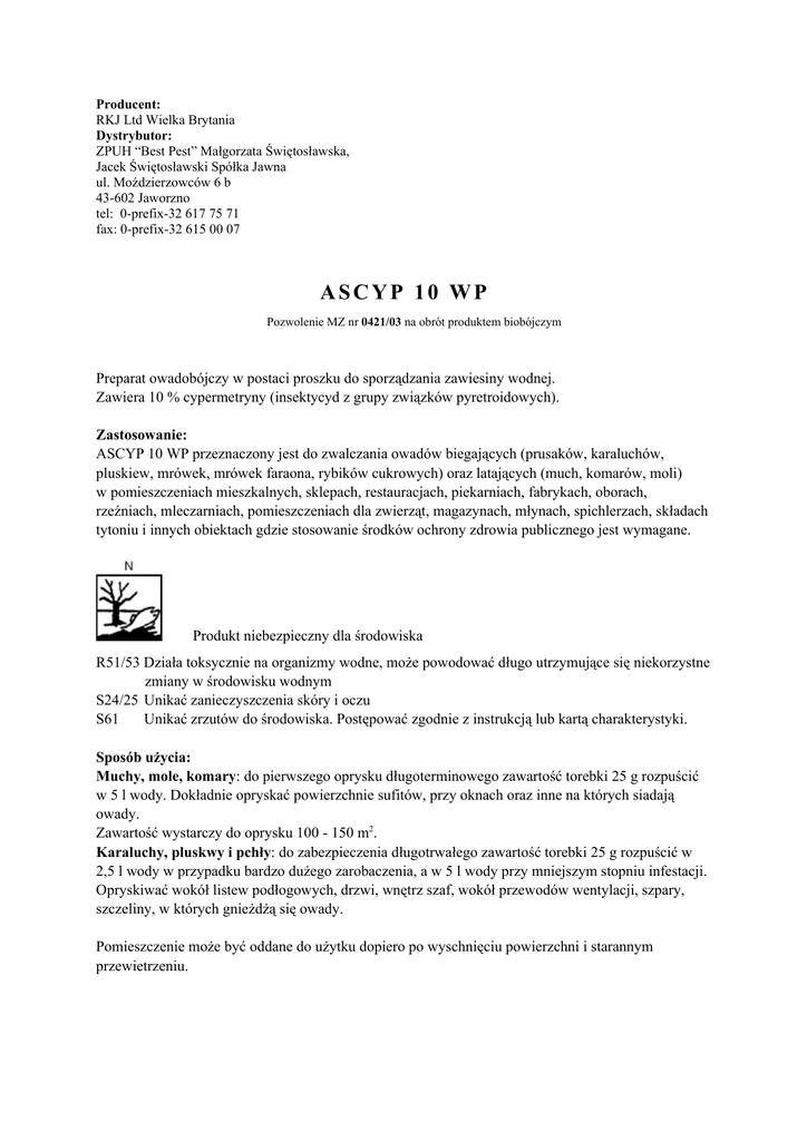 Producent: RKJ Ltd Wielka Brytania Dystrybutor: ZPUH “Best Pest” Małgorzata Świętosławska, Jacek Świętosławski Spółka Jawna ul. Moździerzowców 6 b 43-602 Jaworzno tel: 0-prefix-32 617 75 71 fax: 0-prefix-32 615 00 07 ASCYP 10 WP Pozwolenie MZ nr 0421/03 na obrót produktem biobójczym Preparat owadobójczy w postaci proszku do sporządzania zawiesiny wodnej. Zawiera 10 % cypermetryny (insektycyd z grupy związków pyretroidowych). Zastosowanie: ASCYP 10 WP przeznaczony jest do zwalczania owadów biegających (prusaków, karaluchów, pluskiew, mrówek, mrówek faraona, rybików cukrowych) oraz latających (much, komarów, moli) w pomieszczeniach mieszkalnych, sklepach, restauracjach, piekarniach, fabrykach, oborach, rzeźniach, mleczarniach, pomieszczeniach dla zwierząt, magazynach, młynach, spichlerzach, składach tytoniu i innych obiektach gdzie stosowanie środków ochrony zdrowia publicznego jest wymagane. Produkt niebezpieczny dla środowiska R51/53 Działa toksycznie na organizmy wodne, może powodować długo utrzymujące się niekorzystne zmiany w środowisku wodnym S24/25 Unikać zanieczyszczenia skóry i oczu S61 Unikać zrzutów do środowiska. Postępować zgodnie z instrukcją lub kartą charakterystyki. Sposób użycia: Muchy, mole, komary: do pierwszego oprysku długoterminowego zawartość torebki 25 g rozpuścić w 5 l wody. Dokładnie opryskać powierzchnie sufitów, przy oknach oraz inne na których siadają owady. Zawartość wystarczy do oprysku 100 - 150 m2. Karaluchy, pluskwy i pchły: do zabezpieczenia długotrwałego zawartość torebki 25 g rozpuścić w 2,5 l wody w przypadku bardzo dużego zarobaczenia, a w 5 l wody przy mniejszym stopniu infestacji. Opryskiwać wokół listew podłogowych, drzwi, wnętrz szaf, wokół przewodów wentylacji, szpary, szczeliny, w których gnieżdżą się owady. Pomieszczenie może być oddane do użytku dopiero po wyschnięciu powierzchni i starannym przewietrzeniu. Środki ostrożności: Przed opryskiwaniem należy usunąć z pomieszczenia ludzi, zwierzęta domowe i gospodarskie, rośliny. Chronić przed skażeniem produkty żywnościowe, pasze, napoje, najlepiej usunąć je z pomieszczenia lub przykryć papierem i schować do zamykanych szafek. Podczas oprysku nosić odzież ochronną, rękawice i ochrony oczu / twarzy. Nie opryskiwać łóżeczek ani zabawek dziecięcych. Nie opryskiwać urządzeń będących pod napięciem elektrycznym. Nie jeść, nie pić i nie palić w czasie przygotowywania cieczy opryskowej i podczas opryskiwania. Po pracy umyć ręce i twarz wodą i mydłem. Nie zanieczyszczać preparatem zbiorników i ujęć wodnych. Opróżnione opakowania po preparacie zwrócić do sprzedawcy (dystrybutora lub producenta), u którego preparat został zakupiony. Przechowywanie Preparat przechowywać z dala od dzieci, żywności, napojów i pasz dla zwierząt, w umiarkowanych temperaturach, szczelnie zamknięty, w suchym, wentylowanym pomieszczeniu. Pierwsza pomoc: Miejsce przypadkowego zetknięcia się preparatu ze skórą dokładnie umyć wodą z mydłem, oczy starannie przepłukać dużą ilością wody. W przypadku spożycia dokładnie wypłukać usta wodą (nie podawać do picia mleka, oleju ani alkoholu). Skontaktować się natychmiast z lekarzem, pokazać etykietę preparatu. Antidotum - brak, stosować leczenie objawowe. W zaistniałych sytuacjach, kiedy wymagana jest lub konieczna inna pomoc medyczna niż ujęta w ostrzeżeniach skontaktować się z najbliższym Ośrodkiem Toksykologicznym: Gdańsk - (0-58) 349 28 31, Kraków - (0-12) 683 11 34, Lublin - (0-81) 740 89 83, Łódź - (0-42) 657 99 00, Poznań - (0-61) 847 69 46, Sosnowiec - (0-32) 266 11 45 Rzeszów - (0-17) 853 45 17, Warszawa - (0-22) 619 66 54, Wrocław - (0-71) 343 30 08 Zawartość netto: Data produkcji: Data ważności: Numer serii: 25 g