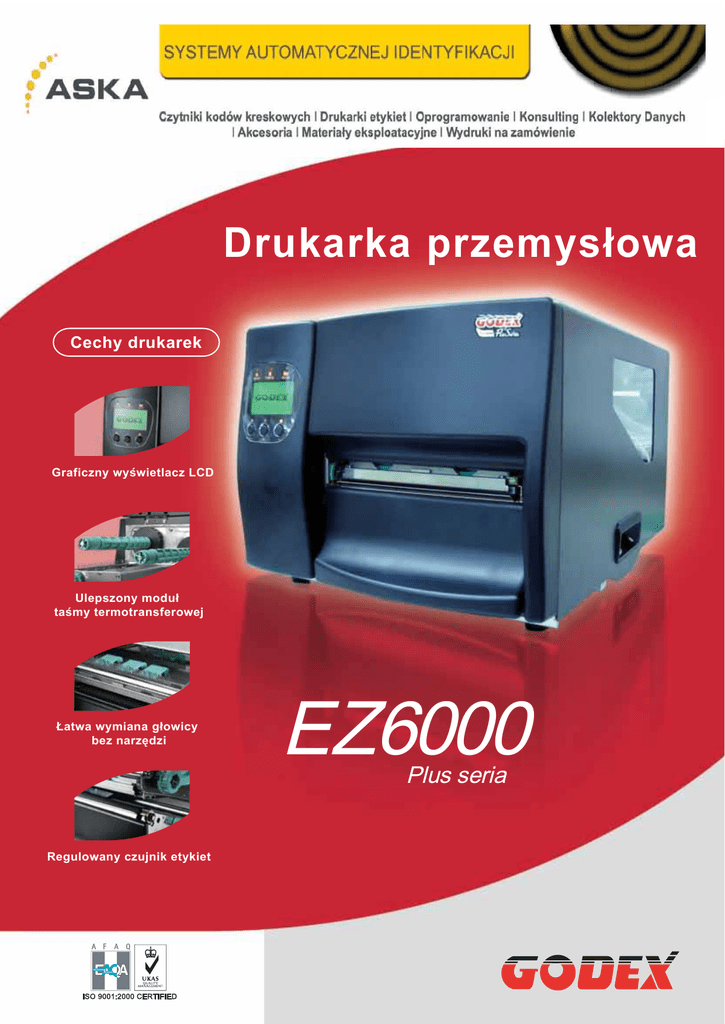 Drukarka przemysłowa Cechy drukarek Graficzny wyświetlacz LCD Ulepszony moduł taśmy termotransferowej Łatwa wymiana głowicy bez narzędzi EZ6000 Plus seria Regulowany czujnik etykiet EZ6000 Plus seria Model Tryb druku Rozdzieklczość Szybkość druku Szerokość druku Długość druku Pamięć Rodzaj czujnika etykiet Materiały Taśma termotransferowa Język programowania Oprogramowanie Wbudowane czcionki Ładowane czcionki Kody kreskowe Strony kodowe Grafika Porty komunikacyjne Panel sterowania Specyfikacja techniczna* EZ6200 Plus EZ6300 Plus Termotransfer / Termiczny bezpośredni 300 dpi (12 pkt/mm) 203 dpi (8 pkt/mm) 102 mm/s (4 IPS) 150 mm/s (6 IPS) 168 mm (6,61”) Min. 4 mm (0,16” )** ; Max. 1371 mm (54”) Min. 4 mm (0,16”)** ; Max. 3000 mm (118” ) 4MB Flash (2MB dla użytkownika) ; 16MB SDRAM Regulowany czujnik przepuszczalny i odblaskowy Papier ciąłgy, etykiety z przerwą, etykiety z czarnym znacznikiem, przywieszki z otworem Szerokość (Odrywanie): 50,8 mm (2”) Min. - 178 mm (7”) Max. Szerokość (Ucinanie): 165 mm (6,5”) Max. Szerokość (Ucinak Heavy Duty): 172 mm (6,8”) Max. Szerokość (Dyspenser / Zwijanie): 178 mm (7”) Max. Grubość: 0,06 mm (0,003”) Min. - 0,25 mm (0,01”) Max. Śr ednica rolki etykiet: Max. 203,2 mm (8”) z rdzeniem 76,2 mm(3”) / Max. 152,4 mm (6”) z rdzeniem 38,1 mm (1,5”) Śr ednica rdzenia: 38,1 mm (1,5”) - 76,2 mm (3“) Woskowa, woskowo-żywiczna i żywiczna Długość: 450 m (1471’) Szerokość: 60 mm (2,36”) Min. - 174 mm (6,85”) Max. Średnica rolki taśmy : 76 mm (2,99”) Średnica rdzenia : 25,4 mm (1”) Nawinięcie barwnika do wewnątrz i na zewnątrz EZPL Edytor etykiet: QLabel-IV (tylko EZPL) Sterownik i DLL: Windows 2000, XP i Vista Czcionki bitmapowe 6, 8, 10, 12, 14, 18, 24, 30, 16X26 i OCR A & B Czcionki bitmapowe obracalne 90°, 180°, 270°, pojedyncze znaki obracalne 90°, 180°, 270° Czcionki bitmapowe rozszerzalne 8 razy w pionie i poziomie Skalowalne czcionki obracalne 90°, 180°, 270° Czcionki bitmapowe obracalne: 90°, 180°, 270°, pojedyncze znaki obracalne 90°, 180°, 270° Czcionki azjatyckie obracalne 90°, 180°, 270°, rozszerzalne 8 razy w pionie i poziomie Skalowalne czcionki obracalne 90°, 180°, 270° Kody 1-D: Code 39, Code 93, Code 128 (subset A, B, C), UCC/EAN-128 K-Mart, UCC/EAN-128, UPC A / E (add on 2 & 5), I 2 of 5, I 2 of 5 z Shipping Bearer Bars, EAN 8 / 13 (add on 2 & 5), Codabar, Post NET, EAN 128, DUN 14, HIBC, MSI (1 Mod 10), Random Weight, Telepen, FIM, China Postal Code, RPS 128 i GS1 DataBar Kody 2-D: PDF417, Datamatrix code, MaxiCode, QR code i Micro QR code CODEPAGE 437, 850, 851, 852, 855, 857, 860, 861, 862, 863, 865, 866, 869, 737 WINDOWS 1250, 1251, 1252, 1253, 1254, 1255 Unicode (UTF8, UTF16) Ładowalne czcionki w formatach BMP i PCX, pozostałe obsługiwane są przez oprogramowanie Szeregowy RS-232 (DB-9) USB (domyślnie włączony) Gniazdo kart CF Karta sieciowa Ethernet 10/100Mbps (domyślnie wyłączona, blokuje port USB podczas używania) Podświetlany ekran LCD: 128 x 64 dots lub 4 linie x 16 znaków Trzy diody LED: Zasilanie, Koniec taśmy, Koniec etykiet Przyciski sterujące: FEED, PAUSE i CANCEL Zegar czasu rzeczywistego Standard 100-240VAC, 50-60Hz Zasilanie Praca: 5°C do 40°C (41°F do 104°F) Śr odowisko pracy Przechowywanie: -20°C do 50°C (-4°F do 122°F) Praca: 30-85%, bez kondensacji Wilgotność Przechowywanie: 10-90%, bez kondensacji Spełniane normy CE(EMC), FCC Class A, CB, cUL, CCC Długość: 516 mm (20,31”) Wymiary Wysokość: 285 mm (11,22”) Szerokość: 345 mm (13,58”) Waga 16,7Kg (36,8 lbs), bez materiałów Ucinak Wewnętrzny zwijak z dyspenserem etykiet Port Centronics / PS2 Interfejs aplikatora (1 wej, 3 wyj, zasilanie 500mA @ 5V) Opcje Karta WIFI 802,11b/g (domyślnie wyłączona, blokuje port USB podczas używania, podczas instalacji trzeba usunać kartę Ethernet) Zewnętrzny wieszak do rolki etykiet o średnicy 250 mm Zewnętrzny zwijak etykiet * Specyfikacje mogą ulec zmianie. Wszystkie znaki i nazwy handlowe są zastrzeżone. ** Minimalna wysokość etykiety może być zależna od typu etykiet, przerw pomiedzy etykietami, konstrukcji podkładu itp. Przedstawiciel w Polsce ASKA S.C. ul.Wędkarska 2A/B1 04-869 Warszawa ISO 9001:2000 Tel. (22) - 498 59 08/9 Fax.(22) - 617 70 20 E-Mail: [email protected] www.kodykreskowe.com