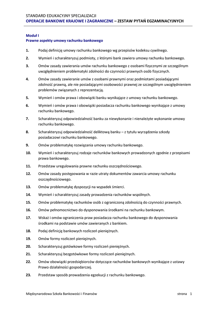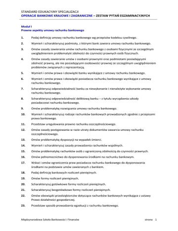 STANDARD EDUKACYJNY SPECJALIZACJI OPERACJE BANKOWE KRAJOWE I ZAGRANICZNE – ZESTAW PYTAŃ EGZAMINACYJNYCH Moduł I Prawne aspekty umowy rachunku bankowego 1. Podaj definicję umowy rachunku bankowego wg przepisów kodeksu cywilnego. 2. Wymień i scharakteryzuj podmioty, z którymi bank zawiera umowy rachunku bankowego. 3. Omów zasady zawierania umów rachunku bankowego z osobami fizycznymi ze szczególnym uwzględnieniem problematyki zdolności do czynności prawnych osób fizycznych. 4. Omów zasady zawieranie umów z osobami prawnymi oraz podmiotami posiadającymi zdolność prawną, ale nie posiadającymi osobowości prawnej ze szczególnym uwzględnieniem problemów związanych z reprezentacją. 5. Wymień i omów prawa i obowiązki banku wynikające z umowy rachunku bankowego. 6. Wymień i omów prawa i obowiązki posiadacza rachunku bankowego wynikające z umowy rachunku bankowego. 7. Scharakteryzuj odpowiedzialność banku za niewykonanie i nienależyte wykonanie umowy rachunku bankowego. 8. Scharakteryzuj odpowiedzialność deliktową banku – z tytułu wyrządzenia szkody posiadaczowi rachunku bankowego. 9. Omów problematykę rozwiązania umowy rachunku bankowego. 10. Wymień i scharakteryzuj rodzaje rachunków bankowych prowadzonych zgodnie z przepisami prawa bankowego. 11. Przedstaw uregulowania prawne rachunku oszczędnościowego. 12. Omów zasady postępowania w razie utraty dokumentów zawarcia umowy rachunku oszczędnościowego. 13. Omów problematykę dyspozycji na wypadek śmierci. 14. Wymień i scharakteryzuj zasady prowadzenia rachunków wspólnych. 15. Omów problematykę rachunków osób z ograniczoną zdolnością do czynności prawnych. 16. Omów pełnomocnictwo do dysponowania środkami na rachunku bankowym. 17. Wskaż i omów ograniczenia praw posiadacza rachunku bankowego do dysponowania środkami na podstawie umów zawieranych z bankiem. 18. Podaj definicję bankowych rozliczeń pieniężnych. 19. Omów formy rozliczeń pieniężnych. 20. Scharakteryzuj gotówkowe formy rozliczeń pieniężnych. 21. Scharakteryzuj bezgotówkowe formy rozliczeń pieniężnych. 22. Omów obowiązki przedsiębiorców dotyczące rachunków bankowych wynikające z ustawy Prawo działalności gospodarczej. 23. Przedstaw sposób prowadzenia egzekucji z rachunku bankowego. Międzynarodowa Szkoła Bankowości i Finansów strona 1 STANDARD EDUKACYJNY SPECJALIZACJI OPERACJE BANKOWE KRAJOWE I ZAGRANICZNE – ZESTAW PYTAŃ EGZAMINACYJNYCH 24. Omów obowiązki banku wynikające z zajęcia rachunku bankowego. 25. Przedstaw problematykę zwolnienia z egzekucji dotyczące rachunków oszczędnościowych i rachunków przedsiębiorców. 26. Omów obowiązki banku w przypadku zbiegu egzekucji. 27. Podaj i omów ogólne zasady dotyczące tajemnicy bankowej. 28. Przedstaw obowiązki banku w zakresie udzielania informacji objętych tajemnicą bankową. 29. Omów uprawnienia banku w zakresie wydawania regulaminów bankowych. 30. Podaj zasady obowiązywania postanowień regulaminów w stosunku do posiadaczy rachunków bankowych. Moduł II Krajowe rozliczenia pieniężne 31. Przedstaw uregulowania dotyczące rozliczeń pieniężnych zawarte w ustawie Prawo działalności gospodarczej. 32. Wymień i krótko scharakteryzuj formy krajowych rozliczeń pieniężnych 33. Zdefiniuj pojęcie czeku i omów jego elementy. 34. Omów przebieg rozliczenia za pomocą polecenia przelewu. 35. Omów przebieg rozliczenia za pomocą polecenia zapłaty. 36. Omów strukturę organizacyjną KIR S.A. oraz funkcje jej poszczególnych elementów. 37. Wskaż podobieństwa i różnice pomiędzy czekiem a kartą płatniczą. 38. Scharakteryzuj funkcjonowanie systemu SYBIR. 39. Scharakteryzuj funkcjonowanie systemu ELIXIR. 40. Omów istniejące obecnie formy rozrachunków międzyoddziałowych. 41. Omów istniejące obecnie formy rozrachunków międzybankowych. 42. Omów ograniczenia w stosowaniu polecenia zapłaty. 43. Scharakteryzuj podobieństwa i różnice między czekiem a wekslem. 44. Przedstaw warunki niezbędne do prowadzenia rozliczeń za pomocą polecenia zapłaty. 45. Zdefiniuj polecenie przelewu. 46. Zdefiniuj polecenie zapłaty. 47. Omów możliwości odwołania polecenia zapłaty. 48. Omów możliwości odwołania polecenia przelewu. 49. Wskaż podobieństwa i różnice między poleceniem przelewu a poleceniem zapłaty. Międzynarodowa Szkoła Bankowości i Finansów strona 2 STANDARD EDUKACYJNY SPECJALIZACJI OPERACJE BANKOWE KRAJOWE I ZAGRANICZNE – ZESTAW PYTAŃ EGZAMINACYJNYCH Moduł III Czek w obrocie krajowym i zagranicznym 50. Proszę wymienić wszystkie elementy ustawowe czeku. 51. Proszę podać, gdzie czek jest płatny w przypadku nieoznaczenia miejsca jego płatności. 52. Proszę podać, w jaki sposób może być oznaczony remitent na czeku. 53. Proszę wymienić trzy klauzule, które prawo czekowe nakazuje uznać za nienapisane. 54. Proszę podać, jakie muszą być spełnione warunki, aby pełnomocnik mógł wystawić czek. 55. Proszę opisać, kiedy czek nie może być indosowany oraz przypadki, w których indos jest bez znaczenia prawnego. 56. Proszę omówić skutki indosu na trasata oraz skutki indosu dokonanego przez trasata. 57. Proszę podać rodzaje indosów oraz opisać, gdzie może być umieszczony indos. Określić jaki indos musi być umieszczony na czeku składanym do skupu, a jakie indosy na czeku składanym do inkasa. 58. Proszę opisać zasady potwierdzania czeku in blanco i zupełnego oraz skutki potwierdzenia. 59. Jakie są skutki odwołania czeku oraz nieodwołania (w przypadku upływu terminu do przedstawienia)? 60. Proszę określić skutki śmierci wystawcy czeku, remitenta oraz indosanta. 61. Proszę omówić następujące zagadnienia: zapłata częściowa. Obowiązki trasata i posiadacza czeku. 62. Proszę podać, jakie terminy przedstawienia czeku do zapłaty przewiduje polskie prawo czekowe. Od jakiego dnia oblicza się te terminy? 63. Jakie są obowiązki trasata płacącego 