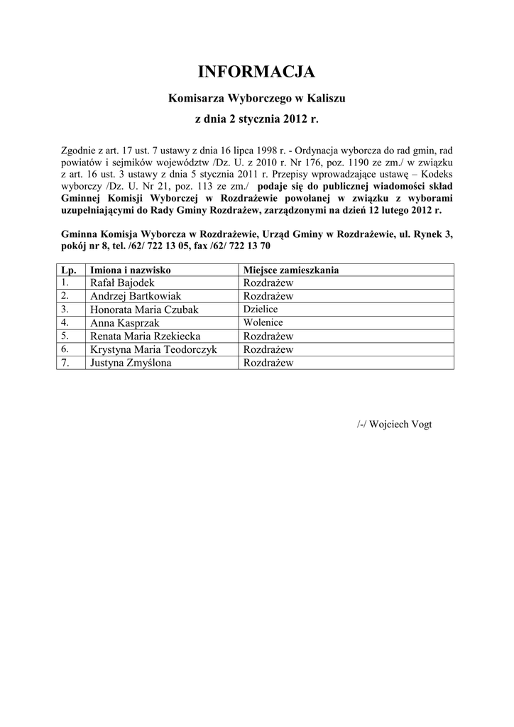 INFORMACJA Komisarza Wyborczego w Kaliszu z dnia 2 stycznia 2012 r. Zgodnie z art. 17 ust. 7 ustawy z dnia 16 lipca 1998 r. - Ordynacja wyborcza do rad gmin, rad powiatów i sejmików województw /Dz. U. z 2010 r. Nr 176, poz. 1190 ze zm./ w związku z art. 16 ust. 3 ustawy z dnia 5 stycznia 2011 r. Przepisy wprowadzające ustawę – Kodeks wyborczy /Dz. U. Nr 21, poz. 113 ze zm./ podaje się do publicznej wiadomości skład Gminnej Komisji Wyborczej w RozdraŜewie powołanej w związku z wyborami uzupełniającymi do Rady Gminy RozdraŜew, zarządzonymi na dzień 12 lutego 2012 r. Gminna Komisja Wyborcza w RozdraŜewie, Urząd Gminy w RozdraŜewie, ul. Rynek 3, pokój nr 8, tel. /62/ 722 13 05, fax /62/ 722 13 70 Lp. 1. 2. 3. 4. 5. 6. 7. Imiona i nazwisko Miejsce zamieszkania Rafał Bajodek Andrzej Bartkowiak Honorata Maria Czubak Anna Kasprzak Renata Maria Rzekiecka Krystyna Maria Teodorczyk Justyna Zmyślona RozdraŜew RozdraŜew Dzielice Wolenice RozdraŜew RozdraŜew RozdraŜew /-/ Wojciech Vogt