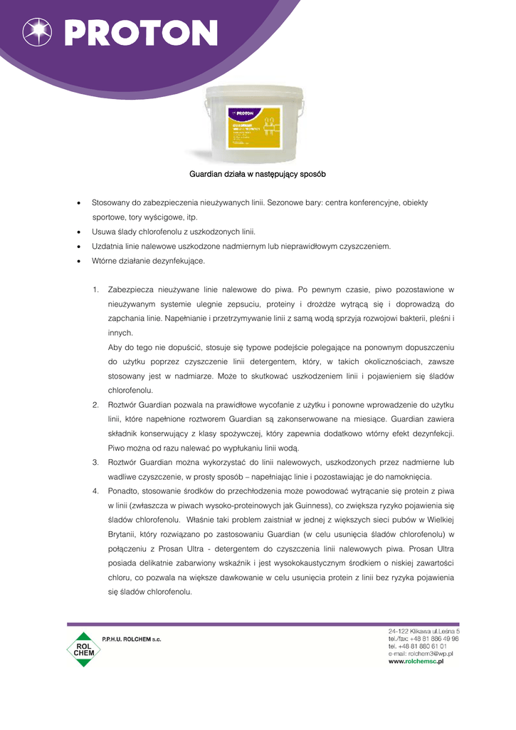 Guardian działa w następujący sposób Stosowany do zabezpieczenia nieużywanych linii. Sezonowe bary: centra konferencyjne, obiekty sportowe, tory wyścigowe, itp. Usuwa ślady chlorofenolu z uszkodzonych linii. Uzdatnia linie nalewowe uszkodzone nadmiernym lub nieprawidłowym czyszczeniem. Wtórne działanie dezynfekujące. 1. Zabezpiecza nieużywane linie nalewowe do piwa. Po pewnym czasie, piwo pozostawione w nieużywanym systemie ulegnie zepsuciu, proteiny i drożdże wytrącą się i doprowadzą do zapchania linie. Napełnianie i przetrzymywanie linii z samą wodą sprzyja rozwojowi bakterii, pleśni i innych. Aby do tego nie dopuścić, stosuje się typowe podejście polegające na ponownym dopuszczeniu do użytku poprzez czyszczenie linii detergentem, który, w takich okolicznościach, zawsze stosowany jest w nadmiarze. Może to skutkować uszkodzeniem linii i pojawieniem się śladów chlorofenolu. 2. Roztwór Guardian pozwala na prawidłowe wycofanie z użytku i ponowne wprowadzenie do użytku linii, które napełnione roztworem Guardian są zakonserwowane na miesiące. Guardian zawiera składnik konserwujący z klasy spożywczej, który zapewnia dodatkowo wtórny efekt dezynfekcji. Piwo można od razu nalewać po wypłukaniu linii wodą. 3. Roztwór Guardian można wykorzystać do linii nalewowych, uszkodzonych przez nadmierne lub wadliwe czyszczenie, w prosty sposób – napełniając linie i pozostawiając je do namoknięcia. 4. Ponadto, stosowanie środków do przechłodzenia może powodować wytrącanie się protein z piwa w linii (zwłaszcza w piwach wysoko-proteinowych jak Guinness), co zwiększa ryzyko pojawienia się śladów chlorofenolu. Właśnie taki problem zaistniał w jednej z większych sieci pubów w Wielkiej Brytanii, który rozwiązano po zastosowaniu Guardian (w celu usunięcia śladów chlorofenolu) w połączeniu z Prosan Ultra - detergentem do czyszczenia linii nalewowych piwa. Prosan Ultra posiada delikatnie zabarwiony wskaźnik i jest wysokokaustycznym środkiem o niskiej zawartości chloru, co pozwala na większe dawkowanie w celu usunięcia protein z linii bez ryzyka pojawienia się śladów chlorofenolu.