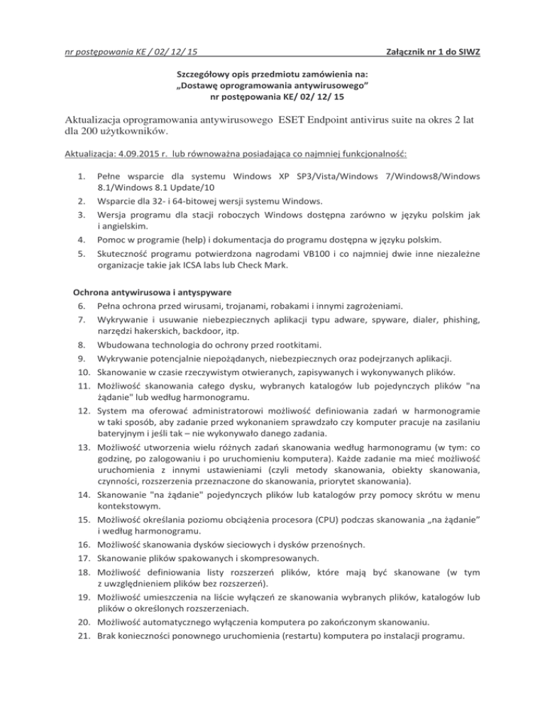 !"# $%# %# & Aktualizacja oprogramowania antywirusowego ESET Endpoint antivirus suite na okres 2 lat dla 200 u ytkowników. ! * $ % . +' ' ' 2 $ ) 2 & . / * 0 1 0 ' "# ' ( 1 $ % 3 - '& & 4 3 . ' '& & ) : "# < )& & & 3 ' 53 -+' .+' 89) 93 ; 3; 2 ' 6 2 3 +' + 2 2 ($ )$*+, "# ; 3 2 : 4 2 ,7 ; & 3 4 & % 23 ! # ; & " > 4& 2 & ; & ; ; 3 3 2; & & 3; & & %2 & 2 4& & 3 & 3; ; & & 3 & & & & & % 2 * : "# & 3 = 2 4; 2 3 3 & 5 & & " ; ) < < & & 3 & : "# " % 23 2 1 : "# & & 3 & - ) & 3 . : "# ! & = 24 =6 : "# " &% = " & 3 3 : "# & 2 &% 7 " 2 3 5 & & 3 2 "# ! % & 3 & & 3 & & 3 & = 3 2 & %23 2 5 # 6? & ; < ; & 2 & "# ; & 6 & & 59$/ 6 @ A " & 3 & 3 ; &# & = 6 & 3 5 ; 2 & 2 & / & # "# & 2 * ' & ! 2 & $ 2 &% 3 & 3 &% 3 & & & ! % 3 &# ! & & & 2 # ! & 2 3 : "# & ! 5 2 ' : * * : & 2 & & 2 : )B & & 6; 5 & " "# " 0 ) & * 5! :) B 4 & %2 EF : . ) & 7 & "# * 3 & 2 CD ; ' : " & ;B & CD 2 & 3 ;' $B $* 2 & 3 ' : 8: $ < 2 < 5 2 2 6 $B $* 8: $ & & !2 2 & 3 G HH$ & " & 3 " % ! ! & 3 " & 3 I &" 2 2 ** : &# ; B & 3 & " & 4 & &! 2 - ) & $ & & EF 2 6 % &6 2 1 ' & 3 0 ! & 3 $ 2 % & & 3 & & 3 E 4 & 3 & # & & & 2 % & ! & & & 3 2 & 3 & & 2 " !2 * $ 2 # G HH$);$B $*);8: $) *1 $ 2 # 4 & 3 3 *- : "# 2% & & & & *. # % * $ 2 # ! $ & " 2 "# 3 2 ! &! "# & & 3 % & !2 & 2 ! H9$; 2 ! & 3 4 2 4 && 3 & % 2 # & &# & "# &! 3 G HH$) ' 2 3 3 2 &! %& 3 # / & 3 & &! 2 & ' & 2 & 4 4 * ' 3 : 3 & 4 J & 1 : 2% - J 2 . : & & & 53 & & 6 & 2 3 & & & " "# & 2 & & 6 6/ & & &% & & & &% 2 & & # "# & &% & ; & 2 2 & & = &# % "# 4 2 &% : "# & : % & 3; 3 %& 3 & & 2 & & 4 & &% & 3 " "# # ; & 2 G % $ 2 & & & 3 # 2 & 2 2 2 ; & % & & 3 & 3 2 3 % !2 & 0 & 2 4 & & & "# & & 2 & 2 # + & %# & 2 2 "# " 2 & & & %& = 5 & && 3 2 5 & 2 2 = ; = &# & &% & & !2 & 2 & 2 8 " > & & & 3 & & 6: > & 5 # 4 & ; ; &% & & & % 2 3 % ;2 & 4; $ & & # 3 % !2 "# # & " * $ 2 4 ; & % 1 )& & - $ 2 % & & 3 # ! &# & & & & & 3 ; / )7; # & & 4 & 2 ! & & & 3 # 3 & &2 & 3 & %& & 8 %& & & = 2 ; & 2 & $ = & 3; 4 &2 ; ; &# 2 & 3 "# %& & 9J ; J ,J & ! 4 & 3; ; "# # & # & & 3 K & 3 && : & & 4 & & & 2 2 $ )& > & 3 "# ! # ! 4 2 / )7 & 4 / )7 4 & 3 " & & 3 4 ; / )7; E$H+9B : ; = # # & 3 & 3; 4 = 7 3; " & 3 . K " & ; # "# 2 %& ! 1 $ 2 & % $ 2 ; 4 2 %& & # #! " % % 2 • "# 2 2 4 11 H L % 1- / & - - = 4 ; % % ; & 3 = 4 2 % " & 3 &" % & 3 # & % "# % 4 &# & & & " & 2 %& & & & & & & & & & & 2 % & %2 4 & & & 3 2 % & 2 % & & 3 " & 2 & & % & 2 " &; " 2 2 "# & & !2 & # & & & & & ; 4 & ; 2 % 3 2 & 2 %& ; & 4; H& & 2 %& 2 2 2 & 3 &> ; & 4 & " & " & & % &# 4 & 2 % & 3 % G 8$) 2 4 & ; & & &2 " 4 & & % &% 4 & % G 8$) ; ; & $ 2 # 2 % 3 1. B 2 1 $ 2 % 2 " & 2 # & 2 2 % 3 • % %" " 1* / & " & 1 $ 2 5G 8$)6 1 : %G 8$) • & & ; # • # & ; & & = = 2 ' • L 2 & 3 "# # 4 = 1 & 3 % & & $ 2 1 & 2 % & 2 "# & # ; # &# & 3 & 3 $J K; $ 2 &# & & ; % %2 & & 3; ! & % 3 K 2 2 ! 2 ; 3 = & 4 3 3M , 3 ! & # & & D 4; & & & &2 4 & & 3 ; & %& & 3 & 3 ! 2 2 ; 3 & # 2 2 - $ 2 & 3 &! -* & 8 - : "# 3 - : "# ! #! 2 ; . . & . 6? & 2 " & 3 & ! &# % ' 3 %2 = -. $ 2 $ 2 & $ 2 % ; 3 & 3 2 & 4 3 ! & & 5 & & L = & 2 & 5 6 2 & 3 & 4 ; ; & & ; &3 & & ; 3 2 98)9B N 9 "#; & & & % 2 #! & & & & % = & 3 2 = # "# !2 4 2 ; ; %& "# 2 2 & 6 & & 4 3 .* / & 2 % % & " & & . $ 2 &# & & = & 3 2 =; & & ; % 8 & 3 =; & 3 2 2 . ' 3 2 " 4& & 2 2 .1 $ 2 # "# 2 & 2 & & 3 .- $ 2 # "# & & 2 "# & 2 .. : "# ; 2 B 3 2 4; % & & 3 &2 & &2 3 2 2 3 & 5 &# " 2 2% "# "# #! #! 2 &# & " & & -1 $ 2 -- $ 2 - 4; ; 2 # &" # & & & 2 % & & ! & 2 ; %2 3 2 2 & ; & ! ; !! % & & ' ' * & : *; )7) * O ; )7) : $ ) F ;' $ % 3 '& & 4 3 3; ' 3 2 ) & !' ) F .; )7) ;: : $ ) F ; ; & 3 ; 3 & & & 3; *; ! : .; $ & 2 & .O ; ) F ; & ; ;: ; D & & 3 & & & 3 O ;)7) ! ; 3 3 2; 1 : - "# < "# : %2 % 23 ; & < & & ) )& )& ; & & 3 & 3 &# . & = 3 & < & & @ & & & 3 # "# % 23 A # & 3 < # "# 2 ? ; & 6 & " 59$/ 6 2 "# & 3 & " & & & 3 & 2 & & 3 & & 3 & ! & 3 ; # ! & " & 3 ; 2 2 3 & ! & & &# =6 &% = 3 "# & 3 1 $ 2 " & 3 = " " % 2 2 3 & 3 ! & & . $ 2 5G 8$)6 $ 2 # &# 3 & & ! $ 2 & K # # ! # & & 3 & 4 #! " % 1 ' & 2 & - )& &# . I J & 3 "# 2 2 4 & 3 " N ) && # & & & ; & 3 " 4 # & & 3 & 3K ' ; & % % = 4 ; % 2 % ; & & & 2 & 2 " & 3 % 4 % = 2 2 % % & 3 & 2 # % & 3 & 4 & #! = % & & 3; %& 9J +J ,J & & 3 & 4 "#; ! 4 2 % & % 4 ; # 4 2 "#; & = * & "# " % 4 * * & %2 3 5 & ; & 2 & " ; & / & & : "# * ) : "# 5 24 : "# 2 2 " & 3 &" # & % " " & 3 & & & # %2 & & 3 %2 & 3 &% = & 3 & & 3 &% = & 2 &% &# & # "# 2 & 3 # & & & & & %2 &% = 3 & 3 & & * ' & % > ** 7 " & * 2 & : &% & &2 % &3 & & & 2 & &% "# & & & 4 : 0 2% '& &# & 6 # "# & % 9E85 6 ! & 3 $ &! %& 3 & & > & & 6 2 & & & 2 5 3 & & & # 4 > & & 53 & 3 & & " "# & *. * : 3 5 & & !2 & 6 6/ & & &% & & "# & &% & ; 2 2 &% 2 = & 3 " "# ; & 2 = &# "# 4 2 ' & 5 & & & 3 # 6: & & & & "# & & 3 & & & 3 &# ; ! ! # ! &% & % 2 & 3 & 2 2 ; + = 5 & && 3 2 5 & 2 2 " = ; 2 = 4 & &% & & 2 2 2 & %# & & & & & & 2 & % &% 2 2 & & & & * : & 3 2 & # & & &# & J = 2 &6 & *- : 3 = & "# *1 ' 3 & &% 2 )& & * 4 & 3 2 & 3 2 # & & % & + 0 8 ! 2 &" 1 8 & ! - : . : ! 2 ;2 & "# & & & "# 2 G % # & % 4 & "# & & & & 2 & 2 %& ! & & 3 % ; !2 4 2 & ' !2 & 2 ! 2 ! 2 ; & & & & 2 &% 3 % 2 2 % 2 ; 4; ;2 & & & # 3 % !2 2 2 & &; &# )& )& & & & 2 & & & &# % 2 # & "# " 3 "# ! 2 98)9B N 9 & 3 > ! # & & & & 3 )& ; & & & 3 4 # ! % & & & & & && & 3 ; ; 4 # & * $ 9J ;J ,J & 4 / )7; # & & & 3 4 &2 & & 3 2 ! & # & & & & &# ; ; %2 & & 3; 3 % 3 2 2 2 ; 3 = & & ! & 3 3 &! & ; & 4 8 & & & & )& % )& & 1 $ 2 - )& . K )& % 1 1 / )7; & 1 B %2 1* : "# 3 5 1 J 2 5 1 & 2 3 2 ; & 4 & " & ! & #! ; & 2 ' & 3 & ) ) * ; " & 3 &2 %& & 3 & 3 4 ; & & # 2 2 %2 & 3 2 2 ; " = 9J ;J ,J 4 5 5 &# 6 & # & 2 D& 2 4; 3 ! 6 $ & % 4 " ; G& & & 0, ; & & ; &" & & ! ! 4 ; & & 6 2 & & &3 ; 2 2 % 3 ! 2 & 3 2 =; & 3 2 " 2 * # & = 2 - # & & ; & & ! # # &# ! ! 2 % G HH$ G HH$6 " = & 4 8 & & & 5 & 2 & "# & & 3 2 4; ; 2 ; %& & / )7 & 4 / )7 & 2 2 &2 & 4 = / )7 ! 4; & & & & & # "# & % ! $ 2 4 9J +J ,J & & &; & 11 11. $ 1 J %& & 8 %& & & & &; & # # 3 6? & & )& & & 4& 2 & & 2 + & & *; .; & : # "# 2 & & ) & & )P E : &)P E ! 3E # D "# & 3 ' & ! 2 B , 5B # ) F , 4 6 & & 3:) ) : ) )P E : &)P E & & &