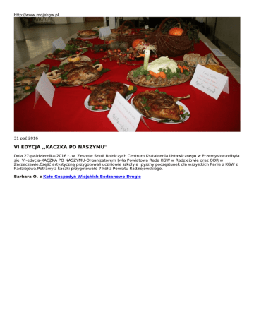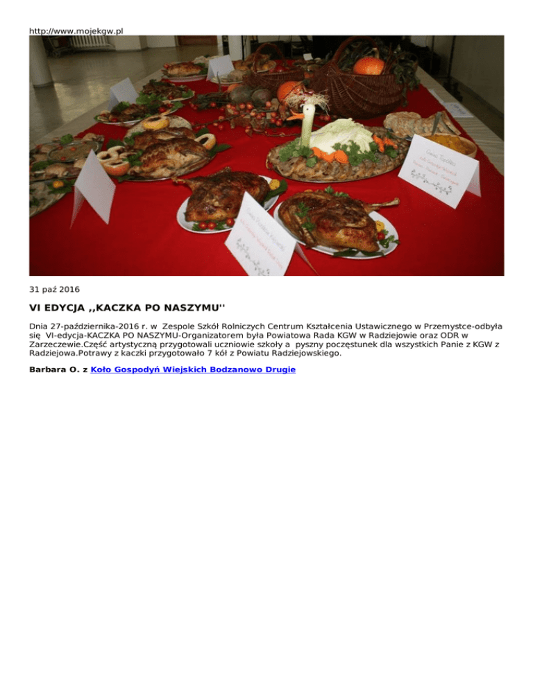 http://www.mojekgw.pl 31 paź 2016 VI EDYCJA ,,KACZKA PO NASZYMU'' Dnia 27-października-2016 r. w Zespole Szkół Rolniczych Centrum Kształcenia Ustawicznego w Przemystce-odbyła się VI-edycja-KACZKA PO NASZYMU-Organizatorem była Powiatowa Rada KGW w Radziejowie oraz ODR w Zarzeczewie.Część artystyczną przygotowali uczniowie szkoły a pyszny poczęstunek dla wszystkich Panie z KGW z Radziejowa.Potrawy z kaczki przygotowało 7 kół z Powiatu Radziejowskiego. Barbara O. z Koło Gospodyń Wiejskich Bodzanowo Drugie