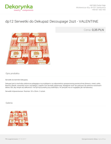 INFOBIS Rafał Głąb Mickiewicza 42a, 43-331 Dankowice +48 601 662 442 dp12 Serwetki do Dekupaż Decoupage 2szt - VALENTINE Cena: 0,35 PLN Opis produktu Serwetki do techniki Dekupażu. Dekupaż jest to technika zdobnicza polegająca na przyklejaniu na odpowiednio spreparowaną powierzchnię (drewno, metal, szkło, tkanina, plastik, ceramika) wzoru wyciętego z papieru lub serwetki papierowej. Następnie wzór ten pokrywa się wieloma warstwami lakieru tak, aby wtopił się całkowicie i nie był wyczuwalny przy dotknięciu. W zamyśle ma on wyglądać jak namalowany. Serwetki trójwarstwowe. Rozmiar: 33 x 33cm. 2 sztuki. Galeria Plik wygenerowano: 07-03-2017 Oprogramowanie sklepu: AptusShop INFOBIS Rafał Głąb Mickiewicza 42a, 43-331 Dankowice +48 601 662 442 Plik wygenerowano: 07-03-2017 Powered by TCPDF (www.tcpdf.org) Oprogramowanie sklepu: AptusShop