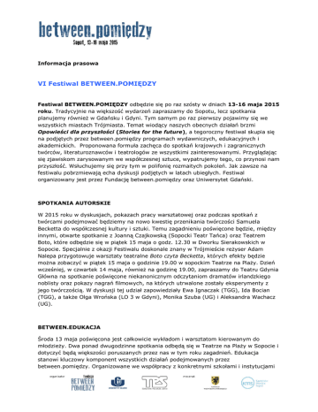 Informacja prasowa VI Festiwal BETWEEN.POMIĘDZY Festiwal BETWEEN.POMIĘDZY odbędzie się po raz szósty w dniach 13-16 maja 2015 roku. Tradycyjnie na większość wydarzeń zapraszamy do Sopotu, lecz spotkania planujemy również w Gdańsku i Gdyni. Tym samym po raz pierwszy pojawimy się we wszystkich miastach Trójmiasta. Temat wiodący naszych obecnych działań brzmi Opowieści dla przyszłości (Stories for the future), a tegoroczny festiwal skupia się na podjętych przez between.pomiędzy programach wydawniczych, edukacyjnych i akademickich. Proponowana formuła zachęca do spotkań krajowych i zagranicznych twórców, literaturoznawców i teatrologów ze wszystkimi zainteresowanymi. Przyglądając się zjawiskom zarysowanym we współczesnej sztuce, wypatrujemy tego, co przynosi nam przyszłość. Wsłuchujemy się przy tym w polifonię rozmaitych pokoleń. Jak zawsze na festiwalu pobrzmiewają echa dyskusji podjętych w latach ubiegłych. Festiwal organizowany jest przez Fundację between.pomiędzy oraz Uniwersytet Gdański. SPOTKANIA AUTORSKIE W 2015 roku w dyskusjach, pokazach pracy warsztatowej oraz podczas spotkań z twórcami podejmować będziemy na nowo kwestię przenikania twórczości Samuela Becketta do współczesnej kultury i sztuki. Temu zagadnieniu poświęcone będzie, między innymi, otwarte spotkanie z Joanną Czajkowską (Sopocki Teatr Tańca) oraz Teatrem Boto, które odbędzie się w piątek 15 maja o godz. 12.30 w Dworku Sierakowskich w Sopocie. Specjalnie z okazji Festiwalu doskonale znany w Trójmieście reżyser Adam Nalepa przygotowuje warsztaty teatralne Boto czyta Becketta, których efekty będzie można zobaczyć w piątek 15 maja o godzinie 19.00 w sopockim Teatrze na Plaży. Dzień wcześniej, w czwartek 14 maja, również na godzinę 19.00, zapraszamy do Teatru Gdynia Główna na spotkanie poświęcone niekanonicznym odczytaniom dramatów irlandzkiego noblisty oraz pokazy nagrań filmowych, na których utrwalone zostały eksperymenty z jego twórczością. W dyskusji tej udział zapowiedziały Ewa Ignaczak (TGG), Ida Bocian (TGG), a także Olga Wrońska (LO 3 w Gdyni), Monika Szuba (UG) i Aleksandra Wachacz (UG). BETWEEN.EDUKACJA Środa 13 maja poświęcona jest całkowicie wykładom i warsztatom kierowanym do młodzieży. Dwa ponad dwugodzinne spotkania odbędą się w Teatrze na Plaży w Sopocie i dotyczyć będą większości poruszanych przez nas w tym roku zagadnień. Edukacja stanowi kluczowy komponent wszystkich działań podejmowanych przez between.pomiędzy. Organizowane we współpracy z konkretnymi szkołami i instytucjami kultury warsztaty, wykłady i spotkania autorskie kierowane są przede wszystkim do gimnazjalistów, licealistów, choć uczestniczą w nich również uczniowie szkół podstawowych. Spotkania odbywają się w ciągu całego roku, a podczas festiwalu proponowane są specjalne sesje dla uczniów. Prowadzone w języku angielskim zajęcia mają na celu ożywienie uczestnictwa w kulturze oraz rozwinięcie zdolności zróżnicowanego odbioru sztuki wśród młodzieży. Szczególny nacisk kładziemy na poszerzenie wiedzy o współczesnej literaturze i teatrze oraz promocję czytelnictwa. Na spotkania te obowiązują zapisy ([email protected]). BETWEEN.WYDAWNICTWA Tegoroczny festiwal zwieńczony będzie wyjątkowym wydarzeniem, a mianowicie prezentacją najświeższych wydawnictw powiązanych z festiwalem. W sobotę 16 maja o godzinie 18.00 w Dworku Sierakowskich w Sopocie przedstawiony zostanie anglojęzyczny Almanach, w którym publikujemy wiersze, tłumaczenia, narracje, wywiady, wspomnienia oraz eseje autorów tej rangi, co Stefan Chwin, Antoni Libera, Edward Balcerzan, Andrzej Zgorzelski, Bogusław Żyłko, Olga Kubińska, Tadeusz Dąbrowski, Włodzimierz Pawluczuk, Piotr Tomaszuk, SE Gontarski, Derek Attridge, David Constantine, Alan Riach, a także poetów z całego świata. Tego samego wieczoru odbędzie się prezentacja współczesnej poezji tłumaczonej przez Monikę Szubę oraz Davida Malcolma, a także dyskusja wokół twórczości TS Eliota z udziałem Jean Ward oraz Marii Fengler. Będzie to również okazja, by wysłuchać nagrań utworów Eliota zachowanych w archiwum Teatru Polskiego Radia. Tych z Państwa, którzy uznają, że warto wspierać działania podejmowane przez BETWEEN.POMIĘDZY, gorąco zachęcamy do nabycia podczas spotkania szeregu wydawnictw powiązanych z festiwalem. BETWEEN.ELIOT Wspólnie z Teatrem Polskiego Radia oraz Wydawnictwem Uniwersytetu Gdańskiego przygotowujemy spotkania na temat twórczości Thomasa Stearnsa Eliota, noblisty z 1948 roku. Spotkania te związane są z przygotowywaną w ramach serii wydawniczej between.pomiędzy książką Między słowem i rzeczy-wistością. Poezja Eliota wobec cielesności i W/wcielenia. Szczególnie ciekawie zapowiada się rozmowa z oboma redaktorkami tej monografii – prof. Jean Ward i dr Marią Fengler – o najsłynniejszym utworze Eliota, czyli Ziemi jałowej (The Waste Land), która odbędzie się w sobotę 16 maja po godz. 18.00 w Dworku Sierakowskich w Sopocie. BETWEEN.BECKETT W ramach festiwalu organizowane jest również seminarium naukowe poświęcone twórczości Samuela Becketta. Trzydniowe obrady skupione będą wokół tematu „Beckett w XXI wieku. Rozpoznanie” i mają określić kierunek przyszłych działań związanej z festiwalem grupy literaturoznawców i teatrologów z całego kraju. Badacze zapraszają wszystkich zainteresowanych do Dworku Sierakowskich w Sopocie na rozmowę o Ostatniej taśmie Krappa (czwartek 15 maja, godz. 15.00). Osobnym elementem będzie dyskusja wokół ech twórczości Becketta w teatrze Petera Brooka, z gościnnym udziałem wybitnego amerykańskiego uczonego, profesora Stanleya Gontarskiego (Florida State University), w którego wykładzie będzie można uczestniczyć w sobotę 16 maja o godzinie 13.15 na Wydziale Filologicznym Uniwersytetu Gdańskiego (ul. Wita Stwosza 55, Gdańsk). MOLOLO Fest