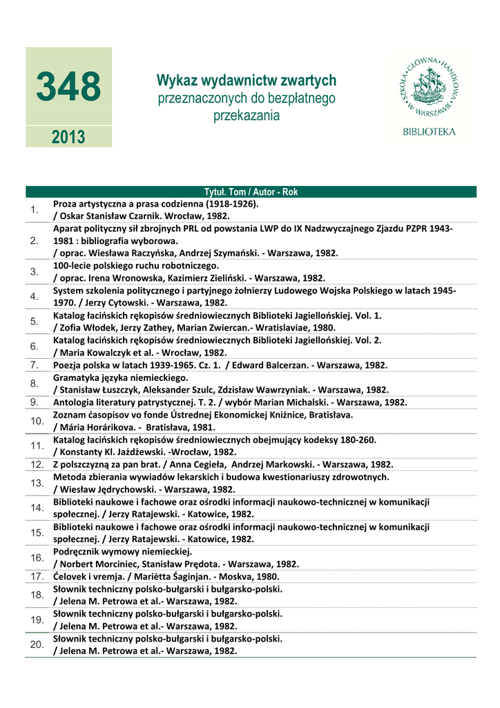 348 Wykaz wydawnictw zwartych przeznaczonych do bezpłatnego przekazania 2013 1. 2. 3. 4. 5. 6. 7. 8. 9. 10. 11. 12. 13. 14. 15. 16. 17. 18. 19. 20. Tytuł. Tom / Autor - Rok Proza artystyczna a prasa codzienna (1918‐1926). / Oskar Stanisław Czarnik. Wrocław, 1982. Aparat polityczny sił zbrojnych PRL od powstania LWP do IX Nadzwyczajnego Zjazdu PZPR 1943‐ 1981 : bibliografia wyborowa. / oprac. Wiesława Raczyńska, Andrzej Szymański. ‐ Warszawa, 1982. 100‐lecie polskiego ruchu robotniczego. / oprac. Irena Wronowska, Kazimierz Zieliński. ‐ Warszawa, 1982. System szkolenia politycznego i partyjnego żołnierzy Ludowego Wojska Polskiego w latach 1945‐ 1970. / Jerzy Cytowski. ‐ Warszawa, 1982. Katalog łacińskich rękopisów średniowiecznych Biblioteki Jagiellońskiej. Vol. 1. / Zofia Włodek, Jerzy Zathey, Marian Zwiercan.‐ Wratislaviae, 1980. Katalog łacińskich rękopisów średniowiecznych Biblioteki Jagiellońskiej. Vol. 2. / Maria Kowalczyk et al. ‐ Wrocław, 1982. Poezja polska w latach 1939‐1965. Cz. 1. / Edward Balcerzan. ‐ Warszawa, 1982. Gramatyka języka niemieckiego. / Stanisław Łuszczyk, Aleksander Szulc, Zdzisław Wawrzyniak. ‐ Warszawa, 1982. Antologia literatury patrystycznej. T. 2. / wybór Marian Michalski. ‐ Warszawa, 1982. Zoznam ćasopisov vo fonde Ústrednej Ekonomickej Kniżnice, Bratisłava. / Mária Horárikova. ‐ Bratisłava, 1981. Katalog łacińskich rękopisów średniowiecznych obejmujący kodeksy 180‐260. / Konstanty Kl. Jażdżewski. ‐Wrocław, 1982. Z polszczyzną za pan brat. / Anna Cegieła, Andrzej Markowski. ‐ Warszawa, 1982. Metoda zbierania wywiadów lekarskich i budowa kwestionariuszy zdrowotnych. / Wiesław Jędrychowski. ‐ Warszawa, 1982. Biblioteki naukowe i fachowe oraz ośrodki informacji naukowo‐technicznej w komunikacji społecznej. / Jerzy Ratajewski. ‐ Katowice, 1982. Biblioteki naukowe i fachowe oraz ośrodki informacji naukowo‐technicznej w komunikacji społecznej. / Jerzy Ratajewski. ‐ Katowice, 1982. Podręcznik wymowy niemieckiej. / Norbert Morciniec, Stanisław Prędota. ‐ Warszawa, 1982. Ćelovek i vremja. / Mariėtta Śaginjan. ‐ Moskva, 1980. Słownik techniczny polsko‐bułgarski i bułgarsko‐polski. / Jelena M. Petrowa et al.‐ Warszawa, 1982. Słownik techniczny polsko‐bułgarski i bułgarsko‐polski. / Jelena M. Petrowa et al.‐ Warszawa, 1982. Słownik techniczny polsko‐bułgarski i bułgarsko‐polski. / Jelena M. Petrowa et al.‐ Warszawa, 1982.