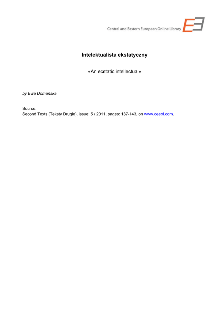 Intelektualista ekstatyczny «An ecstatic intellectual» by Ewa Domańska Source: Second Texts (Teksty Drugie), issue: 5 / 2011, pages: 137143, on www.ceeol.com. Distributed by CEEOL Domańska Roztrząsania i rozbiory Intelektualista ekstatyczny Intelektualista ekstatyczny 1 J. Leociak Doświadczenia graniczne. Studia o dwudziestowiecznych formach reprezentacji, Wyd. IBL PAN–Fundacja Akademia Humanistyczna, Warszawa 2009. Cytaty lokalizuję w tekście. 137 Jacek Leociak jest intelektualistą ekstatycznym w sensie naruszania i wychodzenia poza zarówno konwencjonalne tematy badawcze, jak i tradycyjnie pojmowaną postawę badawczą. Wobec takiej odwagi poznania i tworzenia wiedzy przekraczającej tabu, posiada on wszelkie cechy badacza, który poprzez zakłócanie zastanych zasad, wytrąca badaczy z ustalonych schematów myślenia i wprawia rozważania humanistyczne w ruch. Tym samym pokazuje i otwiera pola problemowe oraz możliwości interpretacji przedtem nieznane czy marginalizowane. Ponadto, niewielu jest w Polsce intelektualistów, którzy z takim zaangażowaniem, a jednocześnie tak przestrzegając zasad profesjonalności badań i pilnując etycznego podejścia, starają się naprawić to, co w naszej przeszłości, jeżeli chodzi o stosunki polsko-żydowskie oraz ich doświadczanie i opisywanie, negatywne: zapomnienie i wyparcie z pamięci, wykluczenie, przemoc, niechęć, a nawet nienawiść, wyobcowanie, niezrozumienie. W tym sensie można powiedzieć, że Leociak reprezentuje humanistykę ratowniczą, a jego działalność ma sens terapeutyczny, ale i pozbawiony moralizatorskiego tonu i osądzającej postawy. Książka Jacka Leociaka Doświadczenia graniczne. Studia o dwudziestowiecznych formach reprezentacji1 jest świadectwem zaznaczonej wyżej intelektualnej postawy ékstasis. Już na samym wstępie autor deklaruje, że w książce tej „chodzi o przełamanie stereotypowego myślenia, że makabra jest jedynie czymś strasznym i odstręczającym; że paraliżujący nas lęk przed śmiercią tylko obezwładnia; że to, co w życiu okropne i raniące, jest tylko destrukcją” (s. 5). Leociaka interesują doświadczenia graniczne, które niosą w sobie potencjał gwałtu i przemocy, stawiając 138 Roztrząsania i rozbiory pod znakiem zapytania zarówno cywilizacyjny ład (s. 16), jak i samo człowieczeństwo. Nie chodzi mu jednak o doświadczenia związane z rytuałami przejścia, ale o sytuacje niespodziewane (s. 31), które uderzając w człowieka czy grupę ludzką, odzierając z ochronnych warstw kultury, łamią tabu i uwidaczniają pracę instynktu przeżycia. Oś książki tworzy się wokół pytania autora, jak takie wydarzenia można przedstawić? Leociak wyraźnie zatem deklaruje, że chodzi mu o różne formy reprezentacji doświadczeń granicznych, ich przedstawienia w formie zapisu, obrazu czy wizerunku (s. 11), stając na stanowisku, że takie przedstawienia są możliwe. Tym samym przeciwstawia się poglądom o niemożności reprezentacji Holokaustu, który stanowi dla niego główne pole badawcze. Pisze: „Stawiam hipotezę, że badania różnych form reprezentacji doświadczeń granicznych wskazuje, iż koncepcja fundamentalnej niewyrażalności – szczególnie doświadczenia Holokaustu – nie znajduje potwierdzenia na gruncie ani empirycznym, ani analitycznym” (s. 7). Książka ta świadczy, że Leociak nadal porusza się w „paradygmacie interpretatywno-tekstualistycznym”, choć w wielu miejscach widać próby jego przekroczenia. Z jednej bowiem strony autor odchodzi od strategii charakterystycznej na przykład dla pisarstwa Giorgio Agambena, który nie pisze o konkretnych osobach, ale o figuracjach (czy paradygmatach) podmiotowości, a doświadczenie zmienia na refleksję filozoficzną. Leociak deklaruje, że „walczy z pokusą takiej tekstualizacji doświadczenia, która pozbawia je odniesień do rzeczywistości realnej”, stale jednak przypomina, że bada „reprezentacje doświadczenia, a nie samo doświadczenie” (s. 7). Czasami widać jednak jego próby wyjścia ku konkretnej materii. Na przykład pisząc o projekcie hermeneutyki pustego miejsca-po-getcie, Leociak deklaruje, że z jednej strony chodzi o hermeneutykę miejsca, a nie świadectw pisanych, lecz zaraz dodaje, że chodzi też o doświadczenie topografii, ale właśnie jako tekstu (s. 120). Widać zatem, że autor czuje ograniczenia podejścia tekstualistycznego, jednak nie ma być może pomysłu, albo narzędzi, by poza nie wyjść. W jednym z najciekawszych, jak sądzę, rozdziałów książki: Uszkodzone fotografie (z) Zagłady, Leociak wykorzystuje podejście, które nasuwa skojarzenia z książką Georgesa Didi-Hubermana Obrazy mimo wszystko. We fragmencie tym ujawnia się tęsknota za konkretem, materią, bowiem zdjęcia analizowane są właśnie w aspekcie ich materialności, mechanicznych i chemicznych uszkodzeń, a nie tylko w aspekcie tego, co przedstawiają. Zaraz jednak autor, jakby bojąc się wejść w ową materialność głębiej, pisze o omawianej w badaniach nad fotografią estetyce błędu oraz o metaforycznym sensie uszkodzeń (uszkodzenie jako metonimia Zagłady, s. 245). Rzecz jasna, powyższe uwagi nie są zarzutami, bowiem temat książki jest jasny, tzn. są nimi różne formy reprezentacji, jednak ciekawe są symptomy wychodzenia poza takie ujęcie i aura „kryzysu reprezentacji”, która ją otacza. Najwięcej problemów przysparza autorowi konceptualizacja kategorii organizującej narrację książki, jaką jest doświadczenie. Leociak podpiera się autorytetami, by wytłumaczyć towarzyszącą temu wyzwaniu bezradność intelektualną, która rzecz jasna nie jest tylko problemem autora. Jak wiadomo, literatura na temat Domańska Intelektualista ekstatyczny doświadczenia jest bardzo bogata, ale jak się wydaje, nawet jej całkowite opanowanie nie ułatwiłoby zadania. Dlatego też, zamiast dość powierzchownych odniesień do różnych tradycji i bad