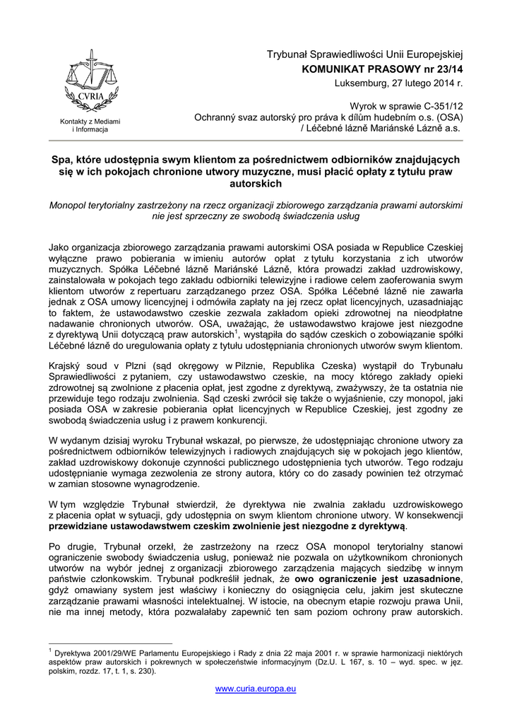Trybunał Sprawiedliwości Unii Europejskiej KOMUNIKAT PRASOWY nr 23/14 Luksemburg, 27 lutego 2014 r. Kontakty z Mediami i Informacja Wyrok w sprawie C-351/12 Ochranný svaz autorský pro práva k dílům hudebním o.s. (OSA) / Léčebné lázně Mariánské Lázně a.s. Spa, które udostępnia swym klientom za pośrednictwem odbiorników znajdujących się w ich pokojach chronione utwory muzyczne, musi płacić opłaty z tytułu praw autorskich Monopol terytorialny zastrzeżony na rzecz organizacji zbiorowego zarządzania prawami autorskimi nie jest sprzeczny ze swobodą świadczenia usług Jako organizacja zbiorowego zarządzania prawami autorskimi OSA posiada w Republice Czeskiej wyłączne prawo pobierania w imieniu autorów opłat z tytułu korzystania z ich utworów muzycznych. Spółka Léčebné lázně Mariánské Lázně, która prowadzi zakład uzdrowiskowy, zainstalowała w pokojach tego zakładu odbiorniki telewizyjne i radiowe celem zaoferowania swym klientom utworów z repertuaru zarządzanego przez OSA. Spółka Léčebné lázně nie zawarła jednak z OSA umowy licencyjnej i odmówiła zapłaty na jej rzecz opłat licencyjnych, uzasadniając to faktem, że ustawodawstwo czeskie zezwala zakładom opieki zdrowotnej na nieodpłatne nadawanie chronionych utworów. OSA, uważając, że ustawodawstwo krajowe jest niezgodne z dyrektywą Unii dotyczącą praw autorskich1, wystąpiła do sądów czeskich o zobowiązanie spółki Léčebné lázně do uregulowania opłaty z tytułu udostępniania chronionych utworów swym klientom. Krajský soud v Plzni (sąd okręgowy w Pilznie, Republika Czeska) wystąpił do Trybunału Sprawiedliwości z pytaniem, czy ustawodawstwo czeskie, na mocy którego zakłady opieki zdrowotnej są zwolnione z płacenia opłat, jest zgodne z dyrektywą, zważywszy, że ta ostatnia nie przewiduje tego rodzaju zwolnienia. Sąd czeski zwrócił się także o wyjaśnienie, czy monopol, jaki posiada OSA w zakresie pobierania opłat licencyjnych w Republice Czeskiej, jest zgodny ze swobodą świadczenia usług i z prawem konkurencji. W wydanym dzisiaj wyroku Trybunał wskazał, po pierwsze, że udostępniając chronione utwory za pośrednictwem odbiorników telewizyjnych i radiowych znajdujących się w pokojach jego klientów, zakład uzdrowiskowy dokonuje czynności publicznego udostępnienia tych utworów. Tego rodzaju udostępnianie wymaga zezwolenia ze strony autora, który co do zasady powinien też otrzymać w zamian stosowne wynagrodzenie. W tym względzie Trybunał stwierdził, że dyrektywa nie zwalnia zakładu uzdrowiskowego z płacenia opłat w sytuacji, gdy udostępnia on swym klientom chronione utwory. W konsekwencji przewidziane ustawodawstwem czeskim zwolnienie jest niezgodne z dyrektywą. Po drugie, Trybunał orzekł, że zastrzeżony na rzecz OSA monopol terytorialny stanowi ograniczenie swobody świadczenia usług, ponieważ nie pozwala on użytkownikom chronionych utworów na wybór jednej z organizacji zbiorowego zarządzenia mających siedzibę w innym państwie członkowskim. Trybunał podkreślił jednak, że owo ograniczenie jest uzasadnione, gdyż omawiany system jest właściwy i konieczny do osiągnięcia celu, jakim jest skuteczne zarządzanie prawami własności intelektualnej. W istocie, na obecnym etapie rozwoju prawa Unii, nie ma innej metody, która pozwalałaby zapewnić ten sam poziom ochrony praw autorskich. 1 Dyrektywa 2001/29/WE Parlamentu Europejskiego i Rady z dnia 22 maja 2001 r. w sprawie harmonizacji niektórych aspektów praw autorskich i pokrewnych w społeczeństwie informacyjnym (Dz.U. L 167, s. 10 – wyd. spec. w jęz. polskim, rozdz. 17, t. 1, s. 230). www.curia.europa.eu Trybunał wywiódł z tego, że przyznany OSA przez ustawodawstwo czeskie monopol nie narusza swobody świadczenia usług. Trybunał zauważył jednakże, że stosowanie przez krajową organizację zbiorowego zarządzania prawami autorskimi stawek cenowych znacząco wyższych od tych obowiązujących w innych państwach członkowskich lub stawek wygórowanych, które nie pozostają w rozsądnym związku z wartością ekonomiczną wykonanego świadczenia, może wskazywać na istnienie nadużycia pozycji dominującej. Ustalenie, czy doszło do niego w niniejszej sprawie, należy jednak do sądu czeskiego. UWAGA: Odesłanie prejudycjalne pozwala sądom państw członkowskich, w ramach rozpatrywanego przez nie sporu, zwrócić się do Trybunału z pytaniem o wykładnię prawa Unii lub o ocenę ważności aktu Unii. Trybunał nie rozpoznaje sporu krajowego. Do sądu krajowego należy rozstrzygnięcie sprawy zgodnie z orzeczeniem Trybunału. Orzeczenie to wiąże w ten sam sposób inne sądy krajowe, które spotkają się z podobnym problemem. Dokument nieoficjalny, sporządzony na użytek mediów, który nie wiąże Trybunału Sprawiedliwości. Pełny tekst wyroku znajduje się na stronie internetowej CURIA w dniu ogłoszenia Osoba odpowiedzialna za kontakty z mediami: Ireneusz Kolowca (+352) 4303 2793 www.curia.europa.eu