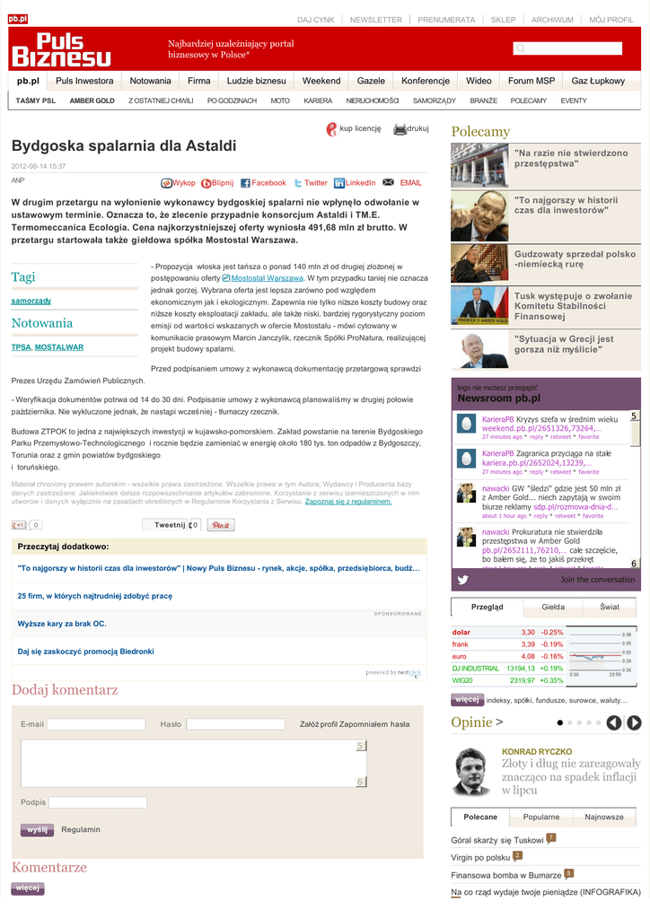 DAJ CYNK NEWSLETTER PRENUMERATA SKLEP MÓJ PROFIL ARCHIWUM Najbardziej uzależniający portal biznesowy w Polsce* pb.pl Puls Inwestora TAŚMY PSL AMBER GOLD Notowania Firma Z OSTATNIEJ CHWILI Ludzie biznesu PO GODZINACH MOTO Weekend KARIERA Gazele Konferencje NIERUCHOMOŚCI Wideo SAMORZĄDY kup licencję drukuj BRANŻE POLECAMY "Na razie nie stwierdzono przestępstwa" 2012-08-14 15:37 Wykop Blipnij Facebook Twitter LinkedIn EMAIL "To najgorszy w historii czas dla inwestorów" W drugim przetargu na wyłonienie wykonawcy bydgoskiej spalarni nie wpłynęło odwołanie w ustawowym terminie. Oznacza to, że zlecenie przypadnie konsorcjum Astaldi i TM.E. Termomeccanica Ecologia. Cena najkorzystniejszej oferty wyniosła 491,68 mln zł brutto. W przetargu startowała także giełdowa spółka Mostostal Warszawa. Gudzowaty sprzedał polsko -niemiecką rurę - Propozycja włoska jest tańsza o ponad 140 mln zł od drugiej złożonej w Tagi EVENTY Polecamy Bydgoska spalarnia dla Astaldi ANP Gaz Łupkowy Forum MSP postępowaniu oferty Mostostal Warszawa. W tym przypadku taniej nie oznacza jednak gorzej. Wybrana oferta jest lepsza zarówno pod względem samorządy Tusk występuje o zwołanie Komitetu Stabilności Finansowej ekonomicznym jak i ekologicznym. Zapewnia nie tylko niższe koszty budowy oraz niższe koszty eksploatacji zakładu, ale także niski, bardziej rygorystyczny poziom Notowania emisji od wartości wskazanych w ofercie Mostostalu - mówi cytowany w komunikacie prasowym Marcin Janczylik, rzecznik Spółki ProNatura, realizującej TPSA, MOSTALWAR "Sytuacja w Grecji jest gorsza niż myślicie" projekt budowy spalarni. Przed podpisaniem umowy z wykonawcą dokumentację przetargową sprawdzi Prezes Urzędu Zamówień Publicznych. tego nie możesz przegapić - Weryfikacja dokumentów potrwa od 14 do 30 dni. Podpisanie umowy z wykonawcą planowaliśmy w drugiej połowie Newsroom pb.pl października. Nie wykluczone jednak, że nastąpi wcześniej - tłumaczy rzecznik. KarieraPB Kryzys szefa w średnim wieku weekend.pb.pl/2651326,73264,… Budowa ZTPOK to jedna z największych inwestycji w kujawsko-pomorskiem. Zakład powstanie na terenie Bydgoskiego Parku Przemysłowo-Technologicznego i rocznie będzie zamieniać w energię około 180 tys. ton odpadów z Bydgoszczy, 5 27 minutes ago * reply * retweet * favorite KarieraPB Zagranica przyciąga na stałe kariera.pb.pl/2652024,13239,… Torunia oraz z gmin powiatów bydgoskiego i toruńskiego. 27 minutes ago * reply * retweet * favorite Materiał chroniony prawem autorskim - wszelkie prawa zastrzeżone. Wszelkie prawa w tym Autora, Wydawcy i Producenta bazy danych zastrzeżone. Jakiekolwiek dalsze rozpowszechnianie artykułów zabronione. Korzystanie z serwisu izamieszczonych w nim utworów i danych wyłącznie na zasadach określonych w Regulaminie Korzystania z Serwisu. Zapoznaj się z regulaminem. nawacki GW "śledzi" gdzie jest 50 mln zł z Amber Gold... niech zapytają w swoim biurze reklamy sdp.pl/rozmowa-dnia-d… about 1 hour ago * reply * retweet * favorite Tweetnij 0 0 Przeczytaj dodatkowo: nawacki Prokuratura nie stwierdziła przestępstwa w Amber Gold pb.pl/2652111,76210,… całe szczęście, bo bałem się, że to jakiś przekręt "To najgorszy w historii czas dla inwestorów" | Nowy Puls Biznesu - rynek, akcje, spółka, przedsiębiorca, budż… about 1 hour ago * reply * retweet * favorite 6 Join the conversation 25 firm, w których najtrudniej zdobyć pracę Przegląd Świat Giełda SPONSOROWANE Wyższe kary za brak OC. Daj się zaskoczyć promocją Biedronki dolar 3,30 -0.25% frank 3,39 -0.19% euro 4,08 -0.16% DJ INDUSTRIAL 13194,13 +0.19% WIG20 Dodaj komentarz E-mail więcej Hasło Załóż profil Zapomniałem hasła 2319,97 +0.35% indeksy, spółki, fundusze, surowce, waluty… ••••• Opinie > 5 KONRAD RYCZKO Złoty i dług nie zareagowały znacząco na spadek inflacji w lipcu 6 Podpis Polecane wyślij Popularne Góral skarży się Tuskowi Komentarze więcej Najnowsze Regulamin Virgin po polsku 7 2 Finansowa bomba w Bumarze 5 Na co rząd wydaje twoje pieniądze (INFOGRAFIKA) 7 Wiadomości dnia na www.pb.pl "Na razie nie stwierdzono przestępstwa" "To najgorszy w historii czas dla inwestorów" Tak będzie się wyludniać Polska 5 Świat A.D. 2050 (WYKRES DNIA) 5 Strefa Premium Dziś kibic, jutro sportowiec Recordati przejmuje Farmę-Projekt Szklany sufit przeszkadza firmom Belvedere zawarło ugodę z wierzycielami więcej Pełny dostęp dla prenumeratorów KUPUJĘ Puls Inwestora KGHM ruszy po miliardy długu Osiem oznak słabości spółki LPP zabłyśnie, PBG (nie) rozczaruje Mostostal Export na krawędzi upadku Kulczyk ekspresem buduje zieloną grupę więcej Dostęp w ramach Pakietu Inwestor KUPUJĘ WIDEO > To się nadaje do prasy Forum > 3 "Zaniechań instytucji państwowych, które to doprowadziły do zawierania umów przez konsumentów z tym przedsiębiorstwem" - ale bzdura! Do... 2 Nie do konca... Jak padnie EUR to marka na dzien dobry bedzie w granicach 6 PLN lub DM/USD w granicach 2 co w krotkim okresie wylozy eksport... 3 Takie mydlenie oczu glupotami... Jak wspomniano w artykule dzieki temu chca poprawic pozycje w rankingu :D Przeciez te rankingi nie sa robione przez... Więcej Polecamy WEEKEND > Biznesmen na słodko MOTO > Włosi rezygnują z Ferrari KARIERA > Zagranica przyciąga na stałe Sekcje PULS INWESTORA > FIRMA > KARIERA > Białek: Zieloną wyspą jesteśmy od 20 lat Minister Gowin ułatwi zakładanie firm Zagranica przyciąga na stałe LPP zabłyśnie, PBG (nie) rozczaruje Dobry biznes broni się sam Mniej pełnopłatnych zwolnień Mostostal Export na krawędzi upadku Luksus w abonamencie walczy o kasę Polaków Pomoc domowa ucieknie z szarej strefy Jaki szef, taka efektywność NIERUCHOMOŚCI > Port Praski z przeszkodami TELEINFORMATYKA > Virgin wjedzie do Polski na Lwie Przesadź firmę na skuter To musisz wiedzieć przed sesją na GPW Oferty Pulsu Biznesu Serwisy PULS INWESTORA > NOTOWANIA > 