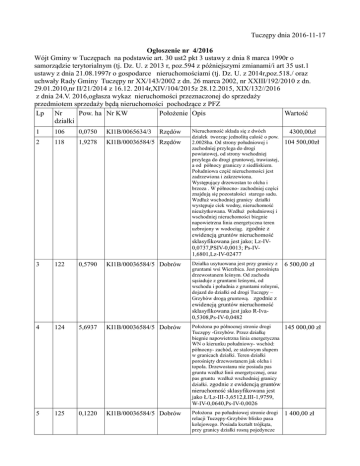 Tuczępy dnia 2016-11-17 Ogłoszenie nr 4/2016 Wójt Gminy w Tuczępach na podstawie art. 30 ust2 pkt 3 ustawy z dnia 8 marca 1990r o samorządzie terytorialnym (tj. Dz. U. z 2013 r, poz.594 z późniejszymi zmianami/i art 35 ust.1 ustawy z dnia 21.08.1997r o gospodarce nieruchomościami (tj. Dz. U. z 2014r,poz.518./ oraz uchwały Rady Gminy Tuczępy nr XX/143/2002 z dn. 26 marca 2002, nr XXIII/192/2010 z dn. 29.01.2010,nr II/21/2014 z 16.12. 2014r,XIV/104/2015z 28.12.2015, XIX/132//2016 z dnia 24.V. 2016,ogłasza wykaz nieruchomości przeznaczonej do sprzedaży przedmiotem sprzedaży będą nieruchomości pochodzące z PFZ Lp Nr Pow. ha Nr KW Położenie Opis Wartość działki Rzędów 1 106 0,0750 KI1B/0065634/3 2 118 1,9278 KI1B/00036584/5 Rzędów Nieruchomość składa się z dwóch działek tworząc jednolitą całość o pow. 2.0028ha. Od strony południowej i zachodniej przylega do drogi powiatowej, od strony wschodniej przylega do drogi gruntowej, trawiastej, a od północy graniczy z siedliskiem. Południowa część nieruchomości jest zadrzewiona i zakrzewiona. Występujący drzewostan to olcha i brzoza . W północno- zachodniej części znajdują się pozostałości starego sadu. Wzdłuż wschodniej granicy działki występuje ciek wodny, nieruchomość nieużytkowana. Wzdłuż południowej i wschodniej nieruchomości biegnie napowietrzna linia energetyczna teren uzbrojony w wodociąg. zgodnie z 4300,00zł 104 500,00zł ewidencją gruntów nieruchomość sklasyfikowana jest jako; Lz-IV0,0737,PSIV-0,0013; Ps-IV1,6801,Lz-IV-02477 3 122 0,5790 KI1B/00036584/5 Dobrów Działka usytuowana jest przy granicy z gruntami wsi Wierzbica. Jest porośnięta drzewostanem leśnym. Od zachodu sąsiaduje z gruntami leśnymi, od wschodu i południa z gruntami rolnymi, dojazd do działki od drogi Tuczępy – Grzybów drogą gruntową. zgodnie z 6 500,00 zł ewidencją gruntów nieruchomość sklasyfikowana jest jako R-Iva0,5308,Ps-IV-0,0482 4 124 5,6937 KI1B/00036584/5 Dobrów Położona po północnej stronie drogi Tuczępy -Grzybów. Przez działkę biegnie napowietrzna linia energetyczna WN o kierunku południowy- wschód: północny- zachód, ze stalowym słupem w granicach działki. Teren działki porośnięty drzewostanem jak olcha i topola. Drzewostanu nie posiada pas gruntu wzdłuż linii energetycznej, oraz pas gruntu wzdłuż wschodniej granicy działki. zgodnie z ewidencją gruntów 145 000,00 zł nieruchomość sklasyfikowana jest jako Ł/Lz-III-3,6512,ŁIII-1,9759, W-IV-0,0640,Ps-IV-0,0026 5 125 0,1220 KI1B/00036584/5 Dobrów Położona po południowej stronie drogi relacji Tuczępy-Grzybów blisko pasa kolejowego. Posiada kształt trójkąta, przy granicy działki rosną pojedyncze 1 400,00 zł brzozy . Przez teren biegnie napowietrzna linia energetyczna ŚN z podwójnym słupem betonowym. zgodnie z ewidencją gruntów nieruchomość sklasyfikowana jest jako Lz- 0,1050,W-0,0170 6 136 6,4484 KI1B/00036584/5 Dobrów Działka zlokalizowana jest w odległości ok. 100m od drogi Tuczępy-Grzybów. Od strony wschodniej graniczy z nieruchomością zabudowaną o charakterze przemysłowym, od strony zachodniej przylega do rowu. Tylko na odcinku ok 20 m graniczy z droga . Północno-wschodnia część działki jest porośnięta olszą w wieku ok 15 lat; w pozostałej części działka w całości porośnięta brzozą. zgodnie z 83 000,00 zł ewidencją gruntów nieruchomość sklasyfikowana jest jako Ps/LzIV5,2205,Ps-IV-1,1859,W-IV0,0420 7 141 0.3726 KI1B/00036584/5 Dobrów 8 143 1,3548 KI1B/00036584/5 Dobrów 9 109 0,8498 KI1B/00036584/5 Dobrów Działka położona na terenie użytków rolnych zadrzewionych w całości zadrzewiona drzewostanem brzozy w wieku około 15 lat,zgodnie z ewidencją gruntów nieruchomość sklasyfikowana jest jako grunt orny- R IVa- 0,5224, RIVb-0,3274 10 127 0,010 KI1B/00065634/3 Podlesie Działka położona na terenie 1 050,00 zł użytków rolnych oraz w sąsiedztwie zabudowy zagrodowej, zgodnie z ewidencją gruntów nieruchomość sklasyfikowana jest jako droga -dr0,01, Działki położone po północnej stronie drogi Tuczępy-Grzybów w całości porośnięte brzozą zgodnie z ewidencją gruntów nieruchomość sklasyfikowana jest jako Ps-Lz-IV0,3736 Ps-Lz-IV-1,3548 13 000,00zł 47 000,00 zł 11 500,00 zł - wykaz stanowi zawiadomienie o przeznaczeniu do sprzedaży w/w nieruchomości przejętej na własność gminy w przetargu ustnym nieograniczonym. - Brak planu zagospodarowania przestrzennego- w studium uwarunkowań i kierunków zagospodarowania przestrzennego gminy Tuczępy działka nr ew. 124 w Dobrowie leży na obszarach przeznaczonych do zalesienia ponadto przez działkę przebiega linia średniego napięcia, dla której w studium” został wyznaczony pas techniczny szerokości ca 50mb. - działki nr 122,125,136,141,143, 109 leżą na obszarze oznaczonym kolorem zielonym lasy osób fizycznych, - działki 118,106 w miejscowości Rzędów leżą na obszarach przeznaczonych do zalesienia, - działka nr 127 w m. Podlesie leży na obszarach przeznaczonych do zalesienia, - wysokość stawek procentowych opłat z tytułu użytkowania wieczystego – nie dotyczy - wysokość z tytułu użytkowania , najmu, dzierżawy – nie dotyczy, zasady aktualizacji opłat – nie dotyczy Ponadto informuje się , że w przypadku zbywania nieruchomości osobom fizycznym i prawnym pierwszeństwo w ich nabyciu, z zastrzeżeniem art 216a, przysługuje osobie, która spełnia jeden z następujących warunków: 1/ przysługuje roszczenie o nabycie nieruchomości z mocy niniejszej ustawy lub odrębnych przepisów, jeżeli złożył wniosek o nabycie przed upływem terminu określonego w wykazie , termin złożenia wniosku określa się do 31.12.2016 2/ jest poprzednim właścicielem zbywanej nieruchomości pozbawionym prawa własności tej nieruchomości przed dniem 5 grudnia 1990r albo jego spadkobiercą, jeżeli złoży wniosek o nabycie przed upływem terminu określonego