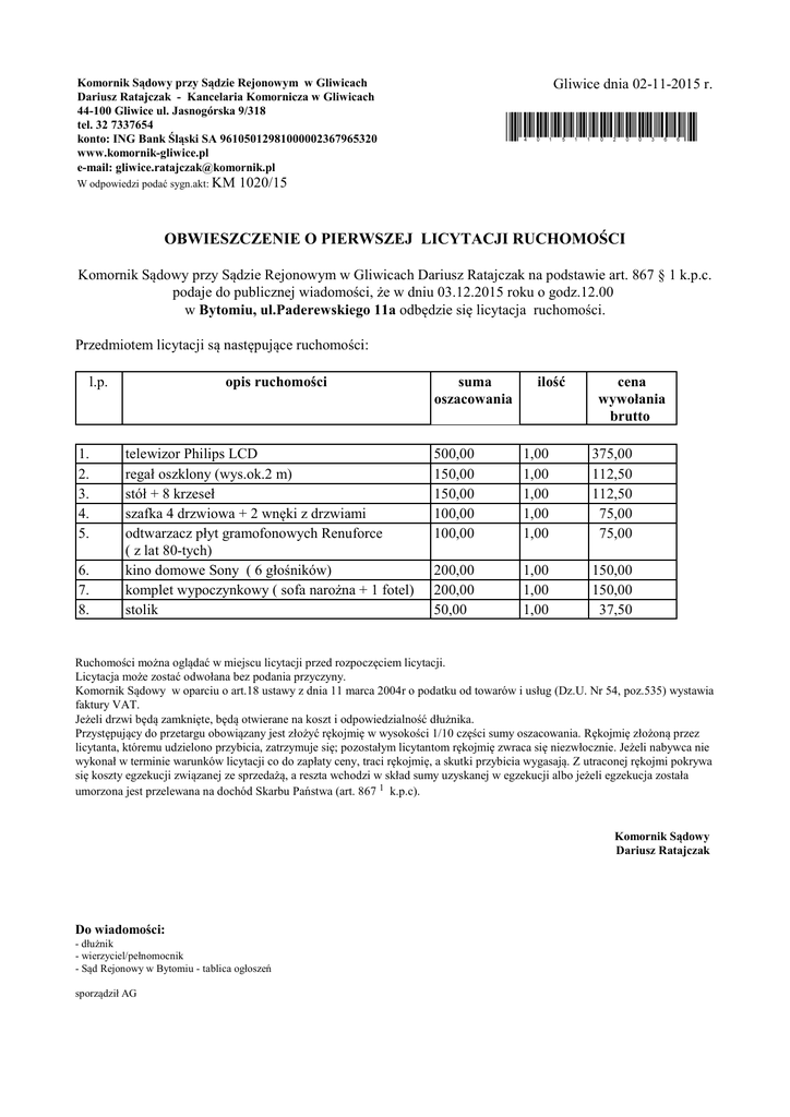 Komornik Sądowy przy Sądzie Rejonowym w Gliwicach Dariusz Ratajczak - Kancelaria Komornicza w Gliwicach 44-100 Gliwice ul. Jasnogórska 9/318 tel. 32 7337654 konto: ING Bank Śląski SA 96105012981000002367965320 www.komornik-gliwice.pl e-mail: [email protected] W odpowiedzi podać sygn.akt: KM Gliwice dnia 02-11-2015 r. *4015110200366* 1020/15 OBWIESZCZENIE O PIERWSZEJ LICYTACJI RUCHOMOŚCI Komornik Sądowy przy Sądzie Rejonowym w Gliwicach Dariusz Ratajczak na podstawie art. 867 § 1 k.p.c. podaje do publicznej wiadomości, że w dniu 03.12.2015 roku o godz.12.00 w Bytomiu, ul.Paderewskiego 11a odbędzie się licytacja ruchomości. Przedmiotem licytacji są następujące ruchomości: l.p. 1. 2. 3. 4. 5. 6. 7. 8. opis ruchomości telewizor Philips LCD regał oszklony (wys.ok.2 m) stół + 8 krzeseł szafka 4 drzwiowa + 2 wnęki z drzwiami odtwarzacz płyt gramofonowych Renuforce ( z lat 80-tych) kino domowe Sony ( 6 głośników) komplet wypoczynkowy ( sofa narożna + 1 fotel) stolik suma oszacowania ilość cena wywołania brutto 500,00 150,00 150,00 100,00 100,00 1,00 1,00 1,00 1,00 1,00 375,00 112,50 112,50 75,00 75,00 200,00 200,00 50,00 1,00 1,00 1,00 150,00 150,00 37,50 Ruchomości można oglądać w miejscu licytacji przed rozpoczęciem licytacji. Licytacja może zostać odwołana bez podania przyczyny. Komornik Sądowy w oparciu o art.18 ustawy z dnia 11 marca 2004r o podatku od towarów i usług (Dz.U. Nr 54, poz.535) wystawia faktury VAT. Jeżeli drzwi będą zamknięte, będą otwierane na koszt i odpowiedzialność dłużnika. Przystępujący do przetargu obowiązany jest złożyć rękojmię w wysokości 1/10 części sumy oszacowania. Rękojmię złożoną przez licytanta, któremu udzielono przybicia, zatrzymuje się; pozostałym licytantom rękojmię zwraca się niezwłocznie. Jeżeli nabywca nie wykonał w terminie warunków licytacji co do zapłaty ceny, traci rękojmię, a skutki przybicia wygasają. Z utraconej rękojmi pokrywa się koszty egzekucji związanej ze sprzedażą, a reszta wchodzi w skład sumy uzyskanej w egzekucji albo jeżeli egzekucja została umorzona jest przelewana na dochód Skarbu Państwa (art. 867 1 k.p.c). Komornik Sądowy Dariusz Ratajczak Do wiadomości: - dłużnik - wierzyciel/pełnomocnik - Sąd Rejonowy w Bytomiu - tablica ogłoszeń sporządził AG