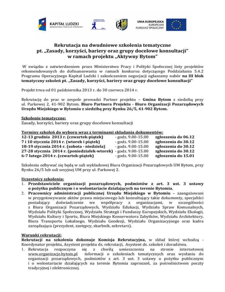 Rekrutacja na dwudniowe szkolenia tematyczne pt. „Zasady, korzyści, bariery oraz grupy docelowe konsultacji” w ramach projektu „Aktywny Bytom” W związku z zatwierdzeniem przez Ministerstwo Pracy i Polityki Społecznej listy projektów rekomendowanych do dofinansowania w ramach konkursu dotyczącego Poddziałania 5.4.2 Programu Operacyjnego Kapitał Ludzki i zakończeniem negocjacji ogłaszamy nabór na III blok tematyczny szkoleń pt. „Zasady, korzyści, bariery oraz grupy docelowe konsultacji” Projekt trwa od 01 października 2013 r. do 30 czerwca 2014 r. Rekrutację do prac w zespole prowadzi Partner projektu – Gmina Bytom z siedzibą przy ul. Parkowej 2, 41-902 Bytom. Biuro Partnera Projektu - Biuro Organizacji Pozarządowych Urzędu Miejskiego w Bytomiu z siedzibą przy Rynku 26/5, 41-902 Bytom. Szkolenie tematyczne: Zasady, korzyści, bariery oraz grupy docelowe konsultacji Terminy szkoleń do wyboru wraz z terminami składania dokumentów: 12-13 grudnia 2013 r. (czwartek-piątek) - godz. 9.00-15.00 zgłoszenia do 06.12 7 i 10 stycznia 2014 r. (wtorek i piątek) - godz. 9.00-15.00 zgłoszenia do 30.12 18-19 stycznia 2014 r. (sobota - niedziela) - godz. 9.00-15.00 zgłoszenia do 30.12 27-28 stycznia 2014 r. (poniedziałek-wtorek) - godz. 9.00-15.00 zgłoszenia do 30.12 6-7 lutego 2014 r. (czwartek-piątek) - godz. 9.00-15.00 zgłoszenia do 15.01 Szkolenia odbywać się będą w sali wykładowej Biura Organizacji Pozarządowych UM Bytom, przy Rynku 26/5 lub sali sesyjnej UM przy ul. Parkowej 2. Uczestnicy szkolenia: 1. Przedstawiciele organizacji pozarządowych, podmiotów z art. 3 ust. 3 ustawy o pożytku publicznym i o wolontariacie działających na terenie Bytomia, 2. Pracownicy administracji publicznej Urzędu Miejskiego w Bytomiu – zaangażowani w przygotowywanie aktów prawa miejscowego lub konsultujący takie dokumenty, specjaliści posiadający doświadczenie we współpracy z organizacjami, w szczególności z Biura Organizacji Pozarządowych, Wydziału Edukacji, Wydziału Spraw Komunalnych, Wydziału Polityki Społecznej, Wydziału Strategii i Funduszy Europejskich, Wydziału Ekologii, Wydziału Kultury i Sportu, Biura Miejskiego Konserwatora Zabytków, Wydziału Architektury, Biura Transportu Lokalnego, Wydziału Geodezji, Wydziału Organizacyjnego oraz kadra zarządzająca (prezydent, zastępcy, skarbnik, sekretarz). Warunki rekrutacji: Rekrutacji na szkolenia dokonuje Komisja Rekrutacyjna, w skład której wchodzą Koordynator projektu, Asystent projektu ds. rekrutacji, Asystent ds. szkoleń i doradztwa. 1. Rekrutacja rozpoczyna się z chwilą umieszczenia na stronie internetowej www.organizacje.bytom.pl informacji o szkoleniach tematycznych oraz wysłaniu do organizacji pozarządowych, podmiotów z art. 3 ust. 3 ustawy o pożytku publicznym i o wolontariacie działających na terenie Bytomia zaproszeń, za pośrednictwem poczty tradycyjnej i elektronicznej. 2. Uczestnik, który zgłasza się na szkolenie w ramach Projektu pierwszy raz - składa Deklarację przystąpienia do Projektu oraz Formularz zgłoszenia na szkolenie. Deklaracja przystąpienia do Projektu wraz z oświadczeniem uczestnika Projektu oraz Formularz zgłoszenia na szkolenie, składane są w oryginale do Partnera. 3. Dokumenty, o których mowa w pkt. 2 winny być wypełnione, podpisane własnoręcznie i czytelnie przez uczestnika i dostarczone przed otrzymaniem wsparcia szkoleniowego. Dopuszcza się możliwość dostarczenia ww. (wypełnionych) dokumentów mailowo lub za pośrednictwem faksu, pod warunkiem dostarczenia w terminie do 3 dni (osobiście bądź listownie) do siedziby Biura Organizacji Pozarządowych wskazanego kompletu wypełnionych dokumentów podpisanych własnoręcznie. 4. Przy wyborze uczestników na szkolenia Komisja rekrutacyjna będzie brała pod uwagę: 1) kryteria uczestnictwa w Projekcie określone w § 1 ust. 4 i § 3 ust. 3 Regulaminu rekrutacji na szkolenia tematyczne; 2) kolejność zgłoszeń. 5. Liczba uczestników w szkoleniu wynosi: 4 grupy 15 osobowe i 1 grupa 16 osobowa. Liczba miejsc na szkolenie jest ograniczona. Wymagane dokumenty: Osoby zainteresowane udziałem w szkoleniu zobowiązane są do wypełnienia wszystkich niezbędnych dokumentów projektowych: 1. Deklarację udziału w projekcie wraz z oświadczeniami, jeśli pierwszy raz zostają objęte wsparciem Projektu „Aktywny Bytom”; 2. Formularz zgłoszenia na szkolenie. Miejsce składnia dokumentów: Dokumenty prosimy składać w siedzibie Urzędu Miejskiego w Bytomiu, Biuro Organizacji Pozarządowych przy Rynku 26/5 w godzinach pracy, tj. od godziny 9:00 do 18:00 od poniedziałku do piątku. Data publikacji: 27.11.2013 r. załącznik: Regulamin rekrutacji na szkolenia tematyczne