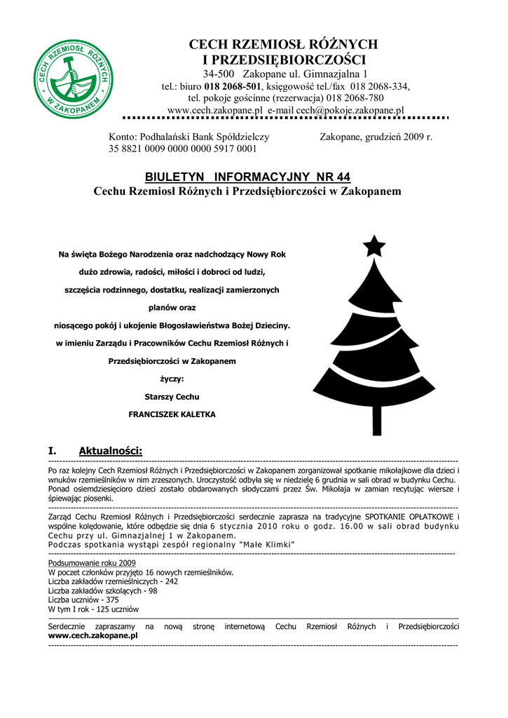 CECH RZEMIOSŁ RÓŻNYCH I PRZEDSIĘBIORCZOŚCI 34-500 Zakopane ul. Gimnazjalna 1 tel.: biuro 018 2068-501, księgowość tel./fax 018 2068-334, tel. pokoje gościnne (rezerwacja) 018 2068-780 www.cech.zakopane.pl e-mail [email protected] Konto: Podhalański Bank Spółdzielczy 35 8821 0009 0000 0000 5917 0001 Zakopane, grudzień 2009 r. BIULETYN INFORMACYJNY NR 44 Cechu Rzemiosł Różnych i Przedsiębiorczości w Zakopanem Na święta Bożego Narodzenia oraz nadchodzący Nowy Rok dużo zdrowia, radości, miłości i dobroci od ludzi, szczęścia rodzinnego, dostatku, realizacji zamierzonych planów oraz niosącego pokój i ukojenie Błogosławieństwa Bożej Dzieciny. w imieniu Zarządu i Pracowników Cechu Rzemiosł Różnych i Przedsiębiorczości w Zakopanem życzy: Starszy Cechu FRANCISZEK KALETKA I. Aktualności: --------------------------------------------------------------------------------------------------------------------------------------------------Po raz kolejny Cech Rzemiosł Różnych i Przedsiębiorczości w Zakopanem zorganizował spotkanie mikołajkowe dla dzieci i wnuków rzemieślników w nim zrzeszonych. Uroczystość odbyła się w niedzielę 6 grudnia w sali obrad w budynku Cechu. Ponad osiemdziesięcioro dzieci zostało obdarowanych słodyczami przez Św. Mikołaja w zamian recytując wiersze i śpiewając piosenki. --------------------------------------------------------------------------------------------------------------------------------------------------Zarząd Cechu Rzemiosł Różnych i Przedsiębiorczości serdecznie zaprasza na tradycyjne SPOTKANIE OPŁATKOWE i wspólne kolędowanie, które odbędzie się dnia 6 s t yc z ni a 2 0 1 0 r ok u o go d z . 1 6. 0 0 w s a l i o b ra d b ud y nk u C e c h u p rz y u l . Gi m na zj a l n e j 1 w Za ko p a ne m. P o d c za s s po t k a n i a wy s t ą pi z e s pó ł r e g io na l ny "Ma łe Kl i m k i " -------------------------------------------------------------------------------------------------------------------------------------------------Podsumowanie roku 2009 W poczet członków przyjęto 16 nowych rzemieślników. Liczba zakładów rzemieślniczych - 242 Liczba zakładów szkolących - 98 Liczba uczniów - 375 W tym I rok - 125 uczniów ------------------------------------------------------------------------------------------------------------------------------------------------------------------------------------------------------------------------------------------------------------------------------------------------- Serdecznie zapraszamy na nową stronę internetową Cechu Rzemiosł Różnych i Przedsiębiorczości www.cech.zakopane.pl --------------------------------------------------------------------------------------------------------------------------------------------------- II. Refundacje: Przypominamy, że umowy o refundację zawarte przez Pracodawców w roku szkoleniowym 2007/2008 oraz 2008/2009 obejmowały okres do 30 czerwca 2009 r. Obecnie czekamy na nowe umowy o refundację z OHP na okres dopełniający do zakończenia przygotowania zawodowego a także na umowy zawarte od 01.09.2009 r. Przypominamy o zmianach w przepisach refundacyjnych §3 ust. 12 "Jeżeli umowa o pracę w celu przygotowania zawodowego została zawarta z młodocianym przed dniem złożenia wniosku o zawarcie umowy lub w tym dniu, wniosek o zawarcie umowy zostanie rozpatrzony negatywnie w odniesieniu do tego młodocianego." (więcej na stronie www.malopolska.ohp.pl) Rozporządzeniem Ministra Pracy i Polityki Społecznej Dz.U.235 poz 1601 z dnia 19 grudnia 2008 r Wnioski o zawarcie umowy o refundacje można składać w terminie od 1 stycznia do 15 listopada każdego roku. Należy jednak pamiętać, że wniosek musi być złożony przed podpisaniem umowy o pracę w celu przygotowania zawodowego. Umowy o refundację będą zawierane z pracodawcami na okres od dnia, w którym młodociany rozpoczyna przygotowanie zawodowe u danego pracodawcy zgodnie z umową o pracę - do dnia zakończenia przygotowania zawodowego - zgodnie z programem. REFUNDACJE PRZYZNAWANE PRZEZ OHP Druki wniosków dostępne są w Cechu, na naszej stronie internetowej www.cech.zakopane.pl i stronie OHP, gdzie również można znaleźć dodatkowe informacje na temat refundacji z OHP pod adresem www.malopolska.ohp.pl Terminy składania dokumentów rozliczeniowych do Cechu za poszczególne kwartały: od VII 2009 po otrzymaniu umowy z OHP Niedotrzymanie terminu złożenia dokumentów rozliczeniowych i załączników do Cechu może powodować utratę możliwości ubiegania się o refundację za w/w okresy. Przy składaniu co kwartał wniosków o refundację należy dostarczyć : ♦ Wniosek pracodawcy (załącznik 4) ♦ Rozlicznie finansowe wypłaconych wynagrodzeń... (Załącznik 4b - na osobnej kartce), ♦ Druk ZUS: DRA (ksero) ♦ W przypadku choroby ucznia druk ZUS RCX i RSA (ksero) ♦ Listy płac – opieczętowane i z potwierdzeniem odbioru wynagrodzenia oraz z pieczęcią i podpisem pracodawcy w miejscu "zatwierdził do wypłaty" (ksero) ♦ Potwierdzenia opłaty składki na ubezpieczenie społeczne ZUS (ksero) ♦ Oświadczenie o kosztach kwalifikujących się do objęcia pomocą poniesionych w każdym miesiącu Wszystkie załączniki składamy w dwóch egzemplarzach. WAŻNE: Wypełnione formularze (wnioski) muszą być z oryginalnymi pieczęciami i podpisami (nie może to być ksero np. pieczątki) oraz nie mogą występować żadne poprawki, skreślenia, korekty - gdyż takie dokumenty są odsyłane z powrotem do Cechu lub pracodawcy. W razie wątpliwości i kłopotów z wypełnianiem druków i całej dokumentacji służymy pomocą i prosimy o kontakt telefoniczny lub osobisty. ............................................................................................................................................................................................................................................................................
