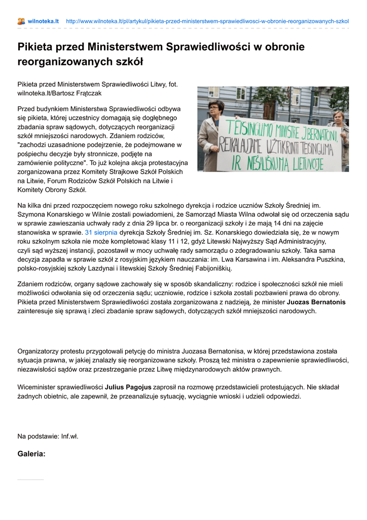 wilnoteka.lt http://www.wilnoteka.lt/pl/artykul/pikieta-przed-ministerstwem-sprawiedliwosci-w-obronie-reorganizowanych-szkol Pikieta przed Ministerstwem Sprawiedliwości w obronie reorganizowanych szkół Pikieta przed Ministerstwem Sprawiedliwości Litwy, fot. wilnoteka.lt/Bartosz Frątczak Przed budynkiem Ministerstwa Sprawiedliwości odbywa się pikieta, której uczestnicy domagają się dogłębnego zbadania spraw sądowych, dotyczących reorganizacji szkół mniejszości narodowych. Zdaniem rodziców, "zachodzi uzasadnione podejrzenie, że podejmowane w pośpiechu decyzje były stronnicze, podjęte na zamówienie polityczne". To już kolejna akcja protestacyjna zorganizowana przez Komitety Strajkowe Szkół Polskich na Litwie, Forum Rodziców Szkół Polskich na Litwie i Komitety Obrony Szkół. Na kilka dni przed rozpoczęciem nowego roku szkolnego dyrekcja i rodzice uczniów Szkoły Średniej im. Szymona Konarskiego w Wilnie zostali powiadomieni, że Samorząd Miasta Wilna odwołał się od orzeczenia sądu w sprawie zawieszania uchwały rady z dnia 29 lipca br. o reorganizacji szkoły i że mają 14 dni na zajęcie stanowiska w sprawie. 31 sierpnia dyrekcja Szkoły Średniej im. Sz. Konarskiego dowiedziała się, że w nowym roku szkolnym szkoła nie może kompletować klasy 11 i 12, gdyż Litewski Najwyższy Sąd Administracyjny, czyli sąd wyższej instancji, pozostawił w mocy uchwałę rady samorządu o zdegradowaniu szkoły. Taka sama decyzja zapadła w sprawie szkół z rosyjskim językiem nauczania: im. Lwa Karsawina i im. Aleksandra Puszkina, polsko-rosyjskiej szkoły Lazdynai i litewskiej Szkoły Średniej Fabijoniškių. Zdaniem rodziców, organy sądowe zachowały się w sposób skandaliczny: rodzice i społeczności szkół nie mieli możliwości odwołania się od orzeczenia sądu; uczniowie, rodzice i szkoła zostali pozbawieni prawa do obrony. Pikieta przed Ministerstwem Sprawiedliwości została zorganizowana z nadzieją, że minister Juozas Bernatonis zainteresuje się sprawą i zleci zbadanie spraw sądowych, dotyczących szkół mniejszości narodowych. Organizatorzy protestu przygotowali petycję do ministra Juozasa Bernatonisa, w której przedstawiona została sytuacja prawna, w jakiej znalazły się reorganizowane szkoły. Proszą też ministra o zapewnienie sprawiedliwości, niezawisłości sądów oraz przestrzeganie przez Litwę międzynarodowych aktów prawnych. Wiceminister sprawiedliwości Julius Pagojus zaprosił na rozmowę przedstawicieli protestujących. Nie składał żadnych obietnic, ale zapewnił, że przeanalizuje sytuację, wyciągnie wnioski i udzieli odpowiedzi. Na podstawie: Inf.wł. Galeria: