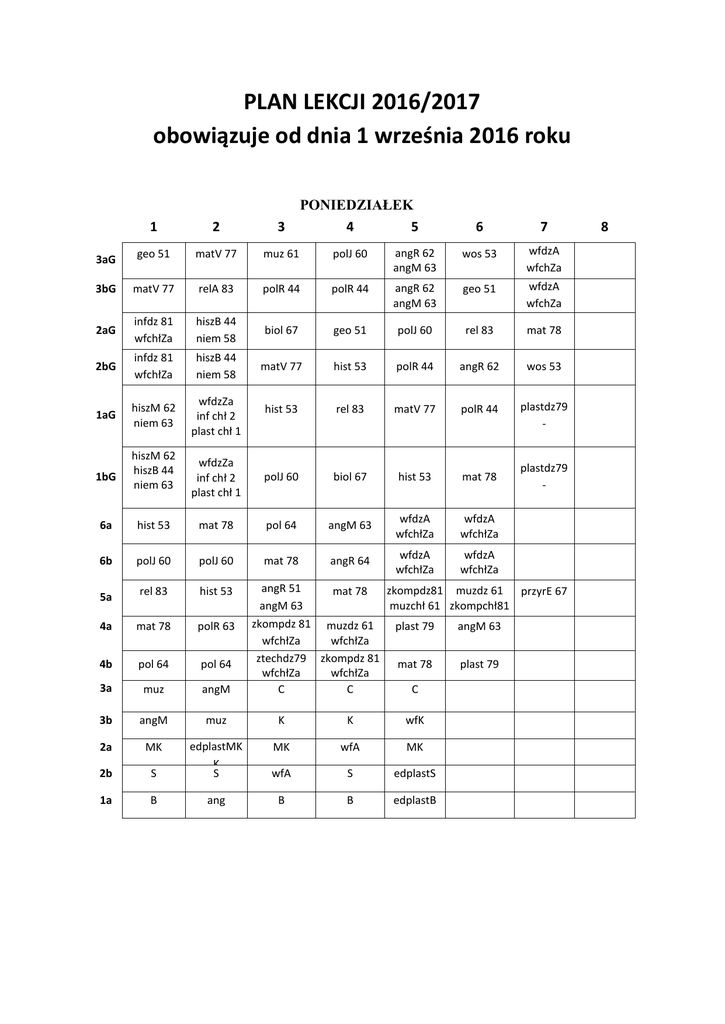 PLAN LEKCJI 2016/2017 obowiązuje od dnia 1 września 2016 roku PONIEDZIAŁEK 4 5 1 2 3 3aG geo 51 matV 77 muz 61 polJ 60 3bG matV 77 relA 83 polR 44 2aG infdz 81 wfchłZa hiszB 44 niem 58 2bG infdz 81 wfchłZa hiszB 44 niem 58 1aG hiszM 62 niem 63 wfdzZa inf chł 2 plast chł 1 1bG hiszM 62 hiszB 44 niem 63 6 7 angR 62 angM 63 wos 53 wfdzA wfchZa polR 44 angR 62 angM 63 geo 51 wfdzA wfchZa biol 67 geo 51 polJ 60 rel 83 mat 78 matV 77 hist 53 polR 44 angR 62 wos 53 hist 53 rel 83 matV 77 polR 44 plastdz79 - wfdzZa inf chł 2 plast chł 1 polJ 60 biol 67 hist 53 mat 78 6a hist 53 mat 78 pol 64 angM 63 wfdzA wfchłZa wfdzA wfchłZa 6b polJ 60 polJ 60 mat 78 angR 64 wfdzA wfchłZa wfdzA wfchłZa 5a rel 83 hist 53 angR 51 angM 63 mat 78 4a mat 78 polR 63 4b pol 64 pol 64 3a muz angM 3b angM muz K K wfK 2a MK MK wfA MK 2b S edplastMK K S wfA S edplastS 1a B ang B B edplastB zkompdz 81 muzdz 61 wfchłZa wfchłZa ztechdz79 zkompdz 81 wfchłZa wfchłZa C C plastdz79 - zkompdz81 muzdz 61 przyrE 67 muzchł 61 zkompchł81 plast 79 angM 63 mat 78 plast 79 C 8 WTOREK 1 2 3 4 5 6 7 3aG fiz 70 matV 77 angR 62 angM 63 relA 83 geo 51 wfdzZi techchł wfdzZi techchł 3bG geo 51 fiz 70 angR 62 angM 63 hist 53 matV 77 wfdzZi techchł wfdzZi techchł 2aG angR 83 angS 62 wfdzZi infchł 81 fiz 70 mat 78 hist 53 polJ 60 polJ 60 2bG angR 83 angS 62 wfdzZi infchł 81 matV 77 geo 51 fiz 70 polR 44 polR 44 wfdzZa inf chł 1 plast chł 2 wfdzZa inf chł 1 plast chł 2 angR 51 angS 62 angM 63 angR 51 angS 62 angM 63 infdz 81 wfchłZi matV 77 polR 44 fiz 70 fiz 70 polJ 60 rel 83 6a przyr 67 mat 78 rel 64 6b mat 78 plast 79 relA 83 przyr 67 5a pol 64 pol 64 hist 53 4a angM 63 rel 83 przyr 67 4b hist 53 przyr 67 mat 78 angR 64 ztechdz 79 przyrE 67 angM 63 ztechchł wfdzZi wfdzZi mat 78 ztechchł muzchł wfdzZi wfdzZi angM 63 muzchł ztechchł 3a C C C rel wfC 3b K K K edplastK rel 2a muz relJ MK MK MK 2b relJ S S S ang 1a rytm B relJ B B 1aG 1bG infdz 81 wfchłZi ztechdz 79 angM 63 muzchł 61 angR 64 pol 64 ztechdz 79 muzchł 61 8 ŚRODA 1 2 3 4 5 6 3aG fiz 70 hiszB 44 niem 58 angNS 63 hist 53 matV 77 relA 83 3bG angNS 63 hiszB 44 niem 58 fiz 70 matV 77 chem 70 biol 67 2aG wfdzZi wfchłZa wfdzZi wfchłZa hiszB 60 niem 58 polJ 60 angNS 63 angR 64 angS 63 2bG wfdzZi wfchłZa wfdzZi wfchłZa hiszB 60 niem 58 angNS 63 biol 67 1aG hiszM 62 niem 60 fiz 70 matV 77 biol 67 angR 53 angS 62 angM 51 chem 70 1bG hiszM 62 hiszB 44 niem 60 angNS 63 rel 83 fiz 70 angR 53 angS 62 angM 51 mat 78 rel 83 angM 51 muzdz 61 zkompchł mat 78 zkompdz81 ztechchł 6a 6b mat 78 muzdz 61 zkompchł 81 angR 51 zkompdz81 ztechchł 5a angR 64 angM 51 plast 79 mat 78 pol 64 ztechdz79 zkompchł mat 78 polR 44 polR 44 4b muzdz 61 zkompchł rel 83 pol 64 3a C C C K K 4a 3b 2a 2b 1a polJ 60 BASEN 11:45 – 12:30 BASEN 10:45 – 11:30 K MK MK S S S muz B B MK BASEN 10:45 – 11:30 B wfB 8 chem 70 mat 78 relA 83 WF 13:35 – 14:20 BASEN 13:15 – 14:00 BASEN 12:30 – 13:15 angM 51 BASEN 10:00 – 10:45 angR 64 angS 63 7 BASEN 14:00 – 14:45 CZWARTEK 1 3aG 2 matV 77 angR 51 3 4 5 6 7 8 biol 77 polJ 60 polJ 60 angR 62 angM 63 techdz 79 wfchZa techdz 79 wfchZa matV 77 angR 62 angM 63 techdz 79 wfchZa techdz 79 wfchZa 3bG biol 83 polR 44 wos 53 muz 61 2aG hist 53 wos 53 wfdzZi wfchłZa angR 51 angS 62 z art 79/61 z art 79/61 chem 70 2bG polR 44 matV 77 wfdzZi wfchłZa angR 51 angS 62 z art 79/61 z art 79/61 hist 53 1aG geo 51 biol 83 polR 44 wfchłZi wfdzZa 1bG polJ 60 polJ 60 mat 78 wfchłZi wfdzZa 6a mat 78 plast 79 pol 64 przyr 67 angR 51 angS 62 angM 63 angR 51 angS 62 angM 63 hist 53 6b angR 63 przyr 67 polJ 60 hist 53 mat 78 5a wfdzA wfchłZi angR 51 angM 63 mat 78 pol 64 4a przyr 67 angM 63 rel 83 polR 44 wfdzZi wfchłZa wfdzA wfchłZi 4b pol 64 mat 78 przyr 67 angM 63 wfdzZi wfchłZa 3a angM C C C ed plastC 3b rel K zkompK K K 2a relJ ang MK zkompMK MK 2b zkomp S S S muz ang 1a ang relJ B B B hist 53 chem 70 wdż dz 51 wfchłZa 51 wdż dz wfchłZa pol 64 PIĄTEK 1 2 3 4 5 6 7 polJ 60 edb 51 3aG matV 77 biol 67 hist 53 zzw 51 wfdzZi 3bG relA 62 hist 53 matV 77 zzw 44 wfchłA wfdzZi polR 44 edb 51 2aG geo 51 polJ 60 mat 78 zzw 78 chem 70 wfchłA biol 67 rel 83 2bG polR 44 geo 62 relA 62 zzw 62 biol 67 matV 77 chem 70 1aG rel 83 polR 44 polR 44 zzw 77 matV 77 chem 70 - 1bG polJ 60 mat 78 chem 70 zzw 67 hist 53 geo 51 wfchZi 6a wfdzA pol 64 pol 64 zzw 53 przyr 51 angM 63 wfchZi 6b wfdzA63 wdżchł relA 51 przyr 60 zzw 60 polJ 60 hist 53 5a mat 7863 wdżchł rel 83 przyrE 67 zzw 64 pol 64 wfdzA 4a hist 53 przyr 77 angM 63 zzw 83 polR 44 wfchłZi mat 78 4b przyr 67 angM 63 rel 83 zzw 79 mat 78 pol 64 3a 3b 2a 2b 1a zkompC K MK relJ B wfC K MK wfA zkompB C wfK wfA S B C K MK S wfB rel angM ang S B BASEN - środa wyjazd powrót klasy 3b i 2a 3a i 2b 4a i 4b 5a 6a i 6b 1a G i 1b G ` 9:35 10:20 11:25 12:10 12:50 13:35 11:30 12:25 13:10 13:50 14:45 15:10 opieka A. Kowalska, M. Kasprzak N. Czerniak, M. Seliga s. Miriam, s. Eliza s. Olga, K. Czarny J. Gaj, J. Kobusińska s. Vianneya, s. Elżbieta DZWONKI 1. 2. 3. 4. 5. 6. 7. 8. 9. 7:55 8:55 9:50 10:45 11:40 12:45 13:35 14:25 15:15 - 8:45 9:40 10:35 11:30 12:25 13:30 14:20 15:10 16:00 6. 12:35 – 13:20 w kl. 1 – 3 SP 8