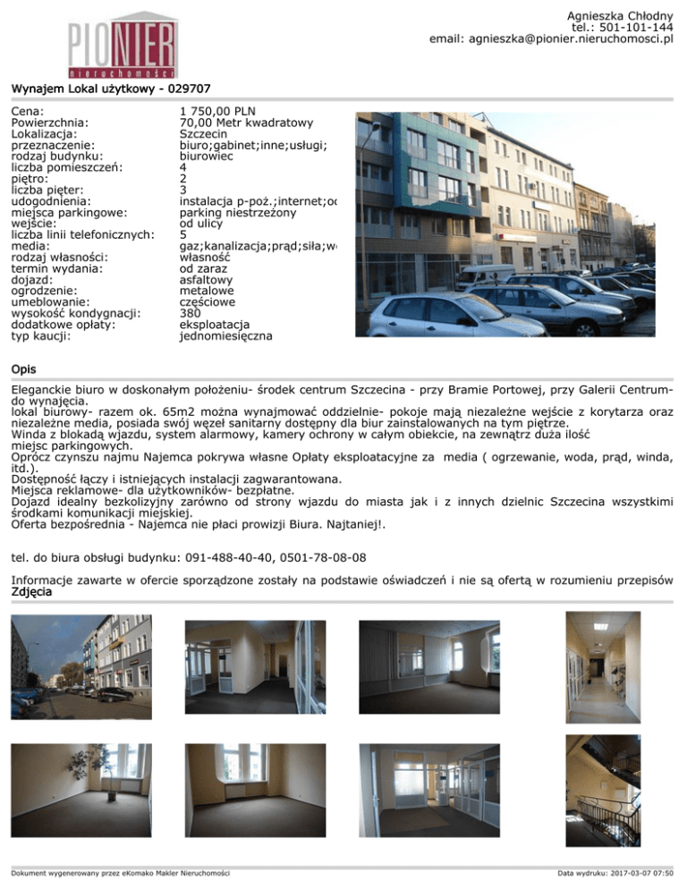 Agnieszka Chłodny tel.: 501-101-144 email: [email protected] Wynajem Lokal użytkowy - 029707 Cena: Powierzchnia: Lokalizacja: przeznaczenie: rodzaj budynku: liczba pomieszczeń: piętro: liczba pięter: udogodnienia: miejsca parkingowe: wejście: liczba linii telefonicznych: media: rodzaj własności: termin wydania: dojazd: ogrodzenie: umeblowanie: wysokość kondygnacji: dodatkowe opłaty: typ kaucji: 1 750,00 PLN 70,00 Metr kwadratowy Szczecin biuro;gabinet;inne;usługi; biurowiec 4 2 3 instalacja p-poż.;internet;ochrona;ogrzewanie;rampa;wentylacja;winda parking niestrzeżony od ulicy 5 gaz;kanalizacja;prąd;siła;woda; własność od zaraz asfaltowy metalowe częściowe 380 eksploatacja jednomiesięczna Opis Eleganckie biuro w doskonałym położeniu- środek centrum Szczecina - przy Bramie Portowej, przy Galerii Centrumdo wynajęcia. lokal biurowy- razem ok. 65m2 można wynajmować oddzielnie- pokoje mają niezależne wejście z korytarza oraz niezależne media, posiada swój węzeł sanitarny dostępny dla biur zainstalowanych na tym piętrze. Winda z blokadą wjazdu, system alarmowy, kamery ochrony w całym obiekcie, na zewnątrz duża ilość miejsc parkingowych. Oprócz czynszu najmu Najemca pokrywa własne Opłaty eksploatacyjne za media ( ogrzewanie, woda, prąd, winda, itd.). Dostępność łączy i istniejących instalacji zagwarantowana. Miejsca reklamowe- dla użytkowników- bezpłatne. Dojazd idealny bezkolizyjny zarówno od strony wjazdu do miasta jak i z innych dzielnic Szczecina wszystkimi środkami komunikacji miejskiej. Oferta bezpośrednia - Najemca nie płaci prowizji Biura. Najtaniej!. tel. do biura obsługi budynku: 091-488-40-40, 0501-78-08-08 Informacje zawarte w ofercie sporządzone zostały na podstawie oświadczeń i nie są ofertą w rozumieniu przepisów Zdjęcia Dokument wygenerowany przez eKomako Makler Nieruchomości Data wydruku: 2017-03-07 07:50