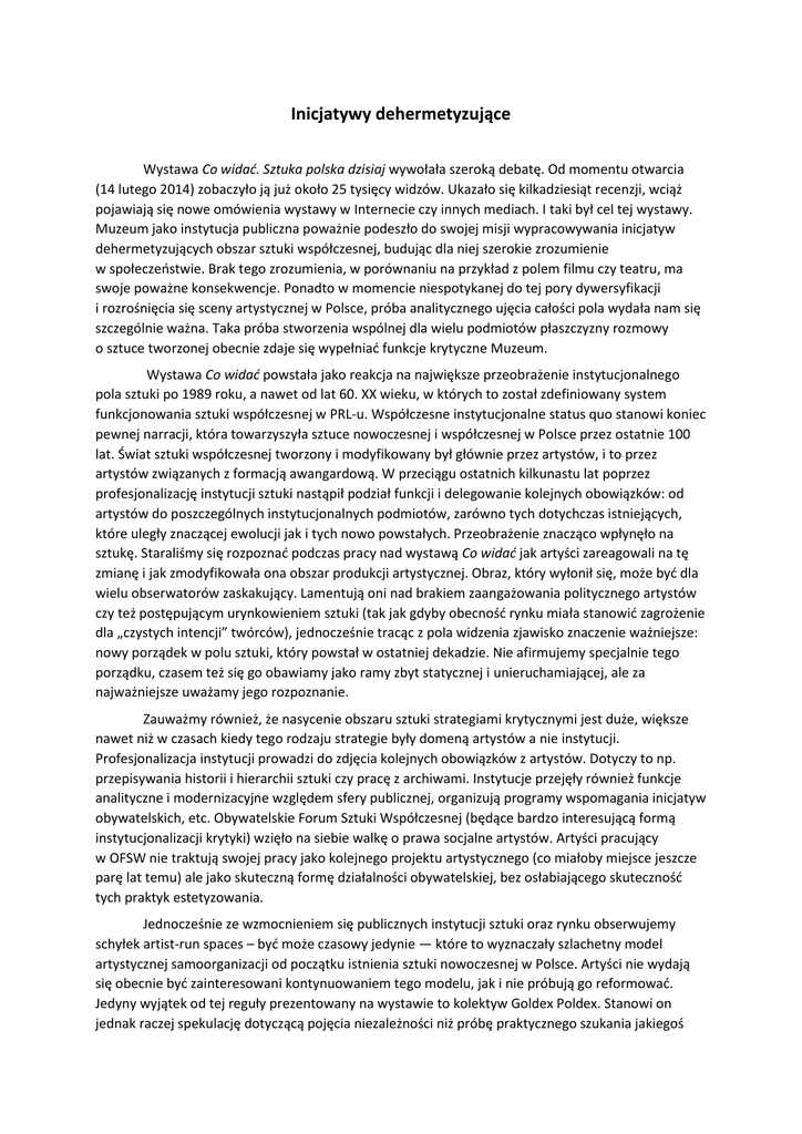 Inicjatywy dehermetyzujące Wystawa Co widać. Sztuka polska dzisiaj wywołała szeroką debatę. Od momentu otwarcia (14 lutego 2014) zobaczyło ją już około 25 tysięcy widzów. Ukazało się kilkadziesiąt recenzji, wciąż pojawiają się nowe omówienia wystawy w Internecie czy innych mediach. I taki był cel tej wystawy. Muzeum jako instytucja publiczna poważnie podeszło do swojej misji wypracowywania inicjatyw dehermetyzujących obszar sztuki współczesnej, budując dla niej szerokie zrozumienie w społeczeństwie. Brak tego zrozumienia, w porównaniu na przykład z polem filmu czy teatru, ma swoje poważne konsekwencje. Ponadto w momencie niespotykanej do tej pory dywersyfikacji i rozrośnięcia się sceny artystycznej w Polsce, próba analitycznego ujęcia całości pola wydała nam się szczególnie ważna. Taka próba stworzenia wspólnej dla wielu podmiotów płaszczyzny rozmowy o sztuce tworzonej obecnie zdaje się wypełniać funkcje krytyczne Muzeum. Wystawa Co widać powstała jako reakcja na największe przeobrażenie instytucjonalnego pola sztuki po 1989 roku, a nawet od lat 60. XX wieku, w których to został zdefiniowany system funkcjonowania sztuki współczesnej w PRL-u. Współczesne instytucjonalne status quo stanowi koniec pewnej narracji, która towarzyszyła sztuce nowoczesnej i współczesnej w Polsce przez ostatnie 100 lat. Świat sztuki współczesnej tworzony i modyfikowany był głównie przez artystów, i to przez artystów związanych z formacją awangardową. W przeciągu ostatnich kilkunastu lat poprzez profesjonalizację instytucji sztuki nastąpił podział funkcji i delegowanie kolejnych obowiązków: od artystów do poszczególnych instytucjonalnych podmiotów, zarówno tych dotychczas istniejących, które uległy znaczącej ewolucji jak i tych nowo powstałych. Przeobrażenie znacząco wpłynęło na sztukę. Staraliśmy się rozpoznać podczas pracy nad wystawą Co widać jak artyści zareagowali na tę zmianę i jak zmodyfikowała ona obszar produkcji artystycznej. Obraz, który wyłonił się, może być dla wielu obserwatorów zaskakujący. Lamentują oni nad brakiem zaangażowania politycznego artystów czy też postępującym urynkowieniem sztuki (tak jak gdyby obecność rynku miała stanowić zagrożenie dla „czystych intencji” twórców), jednocześnie tracąc z pola widzenia zjawisko znaczenie ważniejsze: nowy porządek w polu sztuki, który powstał w ostatniej dekadzie. Nie afirmujemy specjalnie tego porządku, czasem też się go obawiamy jako ramy zbyt statycznej i unieruchamiającej, ale za najważniejsze uważamy jego rozpoznanie. Zauważmy również, że nasycenie obszaru sztuki strategiami krytycznymi jest duże, większe nawet niż w czasach kiedy tego rodzaju strategie były domeną artystów a nie instytucji. Profesjonalizacja instytucji prowadzi do zdjęcia kolejnych obowiązków z artystów. Dotyczy to np. przepisywania historii i hierarchii sztuki czy pracę z archiwami. Instytucje przejęły również funkcje analityczne i modernizacyjne względem sfery publicznej, organizują programy wspomagania inicjatyw obywatelskich, etc. Obywatelskie Forum Sztuki Współczesnej (będące bardzo interesującą formą instytucjonalizacji krytyki) wzięło na siebie walkę o prawa socjalne artystów. Artyści pracujący w OFSW nie traktują swojej pracy jako kolejnego projektu artystycznego (co miałoby miejsce jeszcze parę lat temu) ale jako skuteczną formę działalności obywatelskiej, bez osłabiającego skuteczność tych praktyk estetyzowania. Jednocześnie ze wzmocnieniem się publicznych instytucji sztuki oraz rynku obserwujemy schyłek artist-run spaces – być może czasowy jedynie — które to wyznaczały szlachetny model artystycznej samoorganizacji od początku istnienia sztuki nowoczesnej w Polsce. Artyści nie wydają się obecnie być zainteresowani kontynuowaniem tego modelu, jak i nie próbują go reformować. Jedyny wyjątek od tej reguły prezentowany na wystawie to kolektyw Goldex Poldex. Stanowi on jednak raczej spekulację dotyczącą pojęcia niezależności niż próbę praktycznego szukania jakiegoś zewnętrza systemu. Nasza teza jest następująca: nie ma chwilowo takiej nadwyżki energii twórczej czy krytycznej, która nie mogłaby się zrealizować w ramach obecnego systemu. System ten wydaje się absorbować całą istniejącą energię. I w tym tkwi jego niepokojący urok, który z czasem może przerodzić się w słabość. Młodzi artyści próbują więc odnaleźć w ramach istniejącego systemu, nie szukają niezależnej przestrzeni czy obiegu prezentacji sztuki. Artyści wybierają galerie prywatne, nie szukają innego modelu. Tu pojawia się kwestia uwikłania w ekonomiczne zależności, zarówno artystów jak i instytucji publicznych. Zakładamy, że sam fakt podpisania kontraktu artysty z galerią prywatną (który nie pociąga często za sobą rzeczywistej współpracy merytorycznej) nie sprawia, że znika on z obszaru zainteresowania instytucji publicznych. Istotnym zjawiskiem jest również rozluźnienie czy też pomieszanie związków między ideologicznym zaangażowaniem artystów a formą wypowiedzi artystycznej. Wciąż pokutują pewne mity – krytyczny artysta powinien wypowiadać się poprzez amatorsko zrealizowane wideo czy performanse, podczas gdy na przykład gwasz, akwarela czy litografia należą do świata konserwatyzmu i „zmęczonych rzeczywistością”. Za pomocą naszej wystawy wskazujemy na charakterystyczne dla sztuki ostatniego czasu odwrócenie, w której „stare” media czy też bardzo scenograficzne plastyczne instalacje (Joanny Rajkowskiej czy Ewy Juszkiewicz) mogą nieść bardzo polityczny przekaz, a jednocześnie „nowe” media związane z progresywną tradycja awangardową łączą się dziś często z przekazem konserwatywnym i zachowawczym. Podobnie rzecz ma się często z technologiami cyfrowymi i Internetem, które stały się terenem szcze