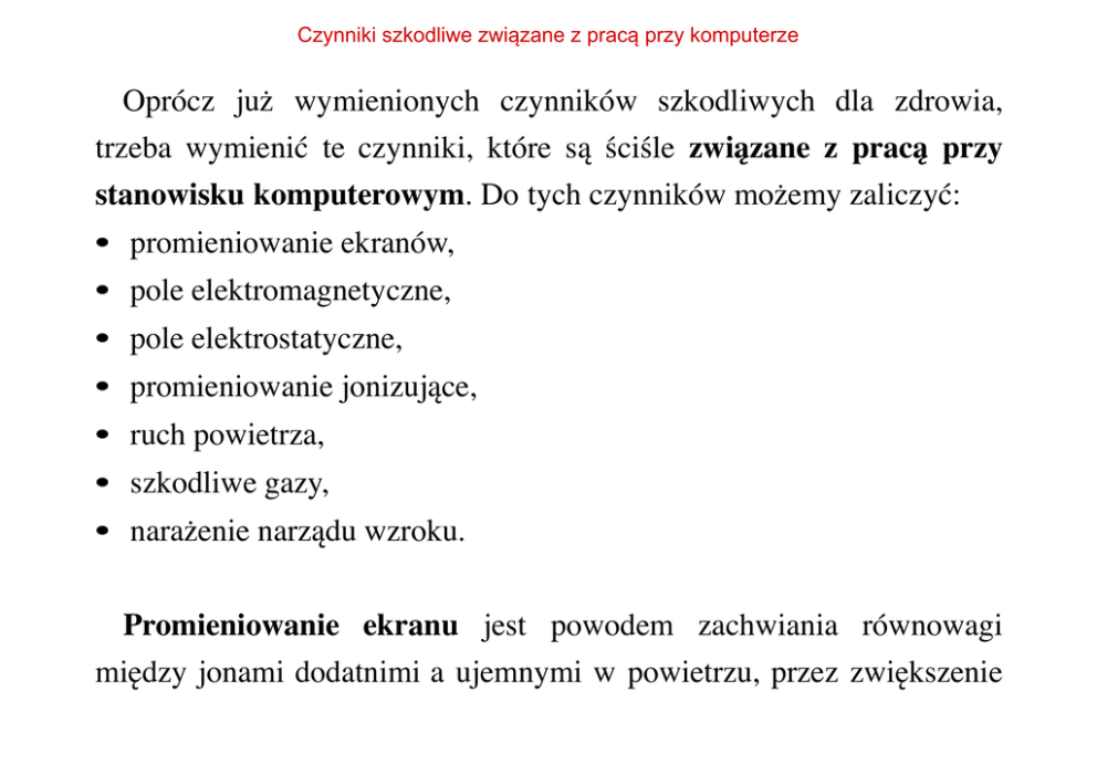 Czynniki szkodliwe związane z pracą przy komputerze Oprócz ju! wymienionych czynników szkodliwych dla zdrowia, trzeba wymieni( te czynniki, które s' %ci%le zwi!zane z prac! przy stanowisku komputerowym. Do tych czynników mo!emy zaliczy(: • promieniowanie ekranów, • pole elektromagnetyczne, • pole elektrostatyczne, • promieniowanie jonizuj'ce, • ruch powietrza, • szkodliwe gazy, • nara!enie narz'du wzroku. Promieniowanie ekranu jest powodem zachwiania równowagi mi&dzy jonami dodatnimi a ujemnymi w powietrzu, przez zwi&kszenie Czynniki szkodliwe związane z pracą przy komputerze si& ilo%ci jonów ujemnych. Reakcj' cz"owieka jest depresja, obni!enie ci%nienia krwi, obni!enie sprawno%ci organizmu i ból g"owy. Pole elektromagnetyczne wytwarzane jest przez p"yn'cy pr'd. W nowoczesnym sprz&cie nie ma ono takiego znaczenia ze wzgl&du na zmniejszon' ilo%( transformatorów, cewek elektromagnetycznych. Nadal jest wa!nym czynnikiem wi'!'cym si& z prac' monitora, zw"aszcza kineskopowego. Powoduje polaryzacj& napi&cia elektrostatycznego pomi&dzy cz"owiekiem a ekranem. W jej rezultacie twarz operatora przyci'ga na"adowane cz'steczki kurzu w takim samym stopniu co na"adowany elektrycznie ekran. Pogarsza si& proces oddychania oraz wyrazisto%( odczytywania informacji z ekranu. Kurz i jonizacja powietrza mo!e wywo"ywa( podra!nienia skóry i alergie. Wszystkie Czynniki szkodliwe związane z pracą przy komputerze aktualnie sprzedawane obecnie monitory spe"niaj' bardzo rygorystyczne w tym zakresie normy TCO. Pole elektrostatyczne – powstaje w wyniku wtórnej emisji elektronów wybijanych przez wi'zk& elektronów o wysokiej cz&stotliwo%ci bombarduj'c' wewn&trzn' powierzchni& ekranu oraz towarzysz'ce mu promieniowanie jonizuj'ce. Powoduje zbieranie si& na powierzchni ekranu kurzu. Przesuwaj'c r&k' po ekranie, s"yszymy ciche trzaski – co oznacza to !e zebra" si& "adunek elektrostatyczny. Jest ono neutralizowane przez dzia"anie wody zawartej w powietrzu. Przy wilgotno%ci powietrza 50–60% potencja" elektrostatyczny jest znacznie ograniczony. St'd bardzo wa!nym jest wietrzenie pomieszcze#, zw"aszcza w okresie zimowym kiedy wilgotno%( mo!e d"ugookresowo Czynniki szkodliwe związane z pracą przy komputerze spada( do 30%. Najbardziej intensywne pole elektrostatyczne wyst&puje przez pierwszy kwadrans od w"'czenia monitora. Dlatego zalecanym jest w"'czanie komputera kilkana%cie minut przed rozpocz&ciem pracy. Promieniowanie jonizuj!ce w nowych monitorach jest filtrowane przez szk"o o"owiowe ekranu kineskopu. Samo szk"o oraz warstwa antystatyczna redukuje niemal ca"kowicie pole elektryczne i "adunki statyczne ekranu. Konstrukcja odchylania i ekranowanie zamyka pole magnetyczne wewn'trz obudowy. Dzi&ki temu mo!emy %mia"o sp&dza( znacznie wi&cej czasu przed ekranami monitorów, bez obawy o nasze zdrowie. Produkowane obecnie monitory posiadaj' Czynniki szkodliwe związane z pracą przy komputerze oznakowanie potwierdzaj'ce spe"nianie bardzo surowych wymaga# bezpiecze#stwa pracy z monitorami. Rys. 1. Powy!sze oznaczenia na monitorze %wiadcz' !e monitor jest bezpiecznym dla u!ytkownika. Czynniki szkodliwe związane z pracą przy komputerze Ruch powietrza – zainstalowane wewn'trz komputera urz'dzenia wiruj'ce (wentylator) wymusza ruch powietrza przenosz'c py"ki, alergeny oraz zjonizowane powietrze wytworzone przez monitor. Zapobieganie przez wietrzenie pomieszcze#. Szkodliwe gazy – z nagrzanym powietrzem z wn&trza komputera i monitora wydzielaj' si& zwi'zki chemiczne. S' to gazy bezwonne – tlenki i furany. S' one zaliczane do najgro$niejszych trucizn %rodowiska naturalnego, maj' dzia"anie rakotwórcze. Wydostaj' si& z emulsji ognioodpornej, któr' pokryte s' obudowy nowych monitorów i jednostek centralnych. Nowy sprz&t przed przydzieleniem na konkretne stanowisko pracy nale!y dobrze wygrzewa( przez kilka dni w cz&sto wietrzonym pomieszczeniu aby szkodliwe substancje ulotni"y si&. Czynniki szkodliwe związane z pracą przy komputerze Nara"enie narz!du wzroku - podczas 8 godzin wpatrywania si& w monitor oczy operatora wykonuj' oko"o 30000 ruchów. Oczy s' suche, piek'ce i przekrwione. Przy dodatkowym skumulowaniu braku ostro%ci, nadmiernej jaskrawo%ci i migotania obrazu monitora – spada cz&stotliwo%( mrugania powiekami i zwil!ania oczu. Jest to pierwszy objaw Syndromu Sicca – którego objawy to wysychanie i zm&tnienie rogówki oraz stopniowa utrata wzroku. Powodem jest niew"a%ciwy monitor, jego niew"a%ciwie ustawione parametry, nie wykorzystane w pe"ni mo!liwo%ci ekranu ale tak!e d"uga praca z ma"ymi czcionkami. Praca przy komputerze jest prac' siedz'c', wymaga wysi"ku statycznego, co jest powodem obci!"enia mi#$ni. Najbardziej obci'!one s' mi&%nie utrzymuj'ce cia"o w pozycji siedz'cej – mi&%nie Czynniki szkodliwe związane z pracą przy komputerze stabilizuj'ce kr&gos"up, ramion i r'k oraz mi&%nie karku utrzymuj'ce pionowo g"ow&. Przed"u!ony w pozycji siedz'cej nacisk mi&%ni na naczynia krwiono%ne staje si& powodem zmniejszenia si& przep"ywu krwi przez mi&%nie. Przy%piesza zm&czenie mi&%niowe a d"ugo utrzymywana pozycja siedz'ca mo!e doprowadzi( do zwyrodnienia stawów, zapalenia pochewek %ci&gnistych, bólów mi&%ni i kr&gos"upa. To krzes"o zapewnia dobr' i prawid"ow' postaw& przy pracy, zw"aszcza krzes"o z podpórk' dla cz&%ci l&d$wiowej kr&gos"upa.