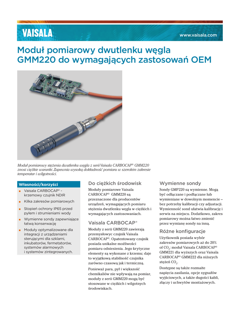www.vaisala.com Moduł pomiarowy dwutlenku węgla GMM220 do wymagających zastosowań OEM Moduł pomiarowy stężenia dwutlenku węgla z serii Vaisala CARBOCAP® GMM220 znosi ciężkie warunki. Zapewnia wysoką dokładność pomiaru w szerokim zakresie temperatur i wilgotności. Własności/korzyści Do ciężkich środowisk Wymienne sondy ▪ Vaisala CARBOCAP® krzemowy czujnik NDIR ▪ ▪ Kilka zakresów pomiarowych Stopień ochrony IP65 przed pyłem i strumieniami wody ▪ Moduły pomiarowe Vaisala CARBOCAP® GMM220 są przeznaczone dla producentów urządzeń, wymagających pomiaru stężenia dwutlenku węgla w ciężkich i wymagających zastosowaniach. Wymienne sondy zapewniające łatwą konserwację Vaisala CARBOCAP® Sondy GMP220 są wymienne. Mogą być odłączane i podłączane lub wymieniane w dowolnym momencie – bez potrzeby kalibracji czy adjustacji. Wymienność sond ułatwia kalibrację i serwis na miejscu. Dodatkowo, zakres pomiarowy można łatwo zmienić przez wymianę sondy na inną. ▪ Moduły optymalizowane dla integracji z urządzeniami sterującymi dla szklarni, inkubatorów, fermetatorów, systemów alarmowych i systemów zintegrowanych. Moduły z serii GMM220 zawierają przemysłowyc czujnik Vaisala CARBOCAP®. Opatentowany czujnik posiada unikalne możliwości pomiaru odniesienia. Jego krytyczne elementy są wykonane z krzemu; daje to wyjątkową stabilność czujnika zarówno czasową jak i termiczną. Ponieważ para, pył i większość chemikaliów nie wpływają na pomiar, moduły z serii GMM220 mogą być stosowane w ciężkich i wilgotnych środowiskach. Różne konfiguracje Użytkownik posiada wybór zakresów pomiarowych aż do 20% of CO2: moduł Vaisala CARBOCAP® GMM221 dla wyższych oraz Vaisala CARBOCAP® GMM222 dla niższych stężeń CO2. Dostępne są także rozmaite napięcia zasilania, opcje sygnałów wyjściowych, a także dugości kabli, złączy i uchwytów montażowych. Dane techniczne Dwutlenek węgla Parametry mechaniczne Zakresy pomiarowe GMM221 dla wysokich stężeń Materiał korpusu sondy poliwęglan Stopień ochrony (tylko sonda) IP65 Masa: GMM221 (z kablem 2m) max. 180 g Masa: GMM222 (z kablem 2m) max. 200 g Długości kabla sondy 0.6 m, 1 m (wysokotemperaturowy), 2 m, 6 m lub 10 m (opcja) 0…2 %, 0…3 %, 0…5 %, 0…10 %, 0…20 % GMM222 dla niskich stężeń 0…2000 ppm, 0…3000 ppm, 0…5000 ppm, 0…7000 ppm, 0…10 000 ppm Dokładność (w tym powtarzalność, nieliniowość i niepewność kalibracji) w 25°C i 1013 hPa GMM221 ±(1.5% zakresu + 2% wskazania) (dotyczy stężeń powyżej 2% zakresu) GMM222 ±(1.5% zakresu + 2% wskazania) Wpływ temperatury, typowo -0.3% zakresu / °C Wpływ ciśnienia, typowo +0.15% wskazania/hPa Stabilność długoczasowa <±5% zakresu/2 lata Stała czasowa (63 %) GMM221 20 sekund GMM222 30 sekund Czas stabilizacji 30 sekund, 15 minut do parametrów znam. Rozdzielczość wyjść analog. Zalecane obciążenie wyjść: wyjście prądowe wyjście napięciowe Napięcie zasilania Złącza Pobór mocy Wymienne sondy GMP221, GMP222 (użyć kodu zamawiania dla określenia zakresu itp.) Klipsy (2 szt.) do mocowania sondy 25245GM Kołnierz do montażu sondy GM45156SP Kalibrator do sond wymiennych GMK220 Kable do podłączenia sondy kabel wysokotemperaturowy 1 m (180°C) GMM220Z100SP kabel 2 m GMM220Z200SP kabel 6 m GMP343Z600SP kabel 10.0 m GMP343Z1000SP Kabel interfejsu szeregowego 19040GM Adapter do kalibracji sondy 26150GM Wymiary Wejścia i wyjścia Sygnały wyjściowe Akcesoria 0…20 lub 4…20 mA, 0…1 V, 0…2V, 0…2.5 V lub 0…5 V 12 bitów Wymiary w mm (calach) max. 200 Ω min. 1 kΩ 11…20 VDC lub 18…30 VDC zaciski śrubowe, 0.5…1.5 mm2 <2.5 W Środowisko pracy Temperatura robocza Temperatura przechowywania Ciśnienie robocze Wilgotność sonda płytka elektroniki Kompatybilność elektromagnet. www.vaisala.com -20…+60°C -30…+70°C 700…1300 hPa GMP221 GMP222 0…100 %RH, bez kondensacji 0…85 %RH, bez kondensacji stosowalne części normy EN61326-1, środowisko ogólne Dystrybucja w Polsce: TEST-THERM Sp. z o.o., ul.Friedleina 4-6, 30-009 Kraków tel.: 12 632 1301, 12 632 6188, http://www.test-therm.pl Ref. B210856EN-E-PL ©Vaisala 2013 Zeskanuj kod aby uzyskać więcej informacji Niniejsza publikacja jest prawnie chroniona, a wszelkie prawa autorskie należą do Vaisala Oyj oraz jej partnerów. Wszelkie prawa zastrzeżone. Logotypy i/lub nazwy produktów są znakami twarowymi firmy Vaisala lub poszczególnych partnerów. Reprodukcja, transfer, rozpowszechnianie lub przechowywanie informacji zawartych w tej ulotce, w dowolnej formie, bez uprzedniej pisemnej zgody Vaisala Oyj, jest ściśle zabronione. Wszystkie dane — w tym techniczne — mogą ulec zmianie bez uprzedzenia. Jest to tłumaczenie oryginalnej wersji angielskiej. W niejednoznacznych przypadkach obowiązuje wersja angielska broszury a nie tłumaczenie.