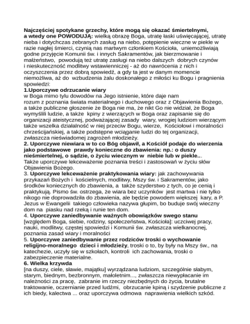 Najczęściej spotykane grzechy, które mogą się okazać śmiertelnymi, a wtedy one POWODUJĄ: wielką obrazę Boga, utratę łaski uświęcającej, utratę nieba i dotychczas zebranych zasług na niebo, potępienie wieczne w piekle w razie nagłej śmierci, czynią nas martwym członkiem Kościoła, uniemożliwiają godne przyjęcie Komunii św. i innych Sakramentów, jak bierzmowanie i małżeństwo, powodują też utratę zasługi na niebo dalszych dobrych czynów i nieskuteczność modlitwy wstawienniczej - aż do nawrócenia z nich i oczyszczenia przez dobrą spowiedź, a gdy ta jest w danym momencie niemożliwa, aż do wzbudzenia żalu doskonałego z miłości ku Bogu i pragnienia spowiedzi: 1.Uporczywe odrzucanie wiary w Boga mimo tylu dowodów na Jego istnienie, które daje nam rozum z poznania świata materialnego i duchowego oraz z Objawienia Bożego, a także publiczne głoszenie że Boga nie ma, że nikt Go nie widział, że Boga wymyślili ludzie, a także kpiny z wierzących w Boga oraz zapisanie się do organizacji ateistycznej, podważającej zasady wiary, wrogiej ludziom wierzącym także wszelka działalność w niej przeciw Bogu, wierze, Kościołowi i moralności chrześcijańskiej, a także podstępne wciąganie ludzi do tej organizacji, zwłaszcza nieświadomej zagrożeń młodzieży. 2. Uporczywe niewiara w to co Bóg objawił, a Kościół podaje do wierzenia jako podstawowe prawdy konieczne do zbawienia: np.: o duszy nieśmiertelnej, o sądzie, o życiu wiecznym w niebie lub w piekle... Także uporczywe lekceważenie poznania treści i zastosowań w życiu słów Objawienia Bożego. 3. Uporczywe lekceważenie praktykowania wiary: jak zachowywania przykazań Bożych i kościelnych, modlitwy, Mszy św. i Sakramentów, jako środków koniecznych do zbawienia, a także szyderstwo z tych, co je cenią i praktykują. Pismo św. ostrzega, że wiara bez uczynków jest martwa i nie tylko nikogo nie doprowadziła do zbawienia, ale będzie powodem większej kary, a P. Jezus w Ewangelii takiego człowieka nazywa głupim, bo buduje swój wieczny dom na piasku nad rzeką i runie ten dom. 4. Uporczywe zaniedbywanie ważnych obowiązków swego stanu [względem Boga, siebie, rodziny, społeczeństwa, Kościoła]: uczciwej pracy, nauki, modlitwy, częstej spowiedzi i Komunii św. zwłaszcza wielkanocnej, poznania zasad wiary i moralności 5. Uporczywe zaniedbywanie przez rodziców troski o wychowanie religijno-moralnego dzieci i młodzieży, troski o to, by były na Mszy św., na katechezie, uczyły się w szkołach, kontroli ich zachowania, troski o zabezpieczenie materialne. 6. Wielka krzywda [na duszy, ciele, sławie, majątku] wyrządzana ludziom, szczególnie słabym, starym, biednym, bezbronnym, małoletnim..., zwłaszcza niewypłacanie im należności za pracę, zabranie im rzeczy niezbędnych do życia, brutalne traktowanie, oczernianie przed ludźmi, obrzucanie kpiną i szydzenie publiczne z ich biedy, kalectwa ... oraz uporczywa odmowa naprawienia wielkich szkód. 7. Zabójstwo umyślne, poważne okaleczenie, uszkodzenie zdrowia fizycznego lub psychicznego, a także wewnętrzna zgoda woli na takie czyny, choćby nie doszło do jej realizacji., a także publiczne popieranie, pochwalanie, podżeganie do tego, czy też głosowanie np.: za aborcją, czy eutanazją, in vitro czy wybieranie do sejmu, senatu, na prezydenta, na ważne stanowiska tych co są za zabijaniem nienarodzonych, Za zabicie dziecka poczętego, co zawsze jest zbrodnią, Kościół wyklucza ze społeczności Kościoła przez karę ekskomuniki tych (aż do nawrócenia i dobrej spowiedzi), którzy tego czynu się dopuścili, a więc lekarza i pomocników medycznych, którzy to wykonywali, matkę dziecka i tych, którzy nakłaniali ją do tego i czynnie jej pomogli to załatwić. Powodem bójek i zabójstw są nieopanowane namiętności gniewu, nienawiści, pychy, zazdrości, chciwości, rozpusty, cudzołóstwa, dlatego P. Jezus tak surowo piętnuje te grzechy w swym publicznym nauczaniu. 8.Samobójstwo Bóg dał nam bezcenny dar życia i przykazanie "nie zabijaj!" chroniące to nasze życie, nigdy więc nie wolno wewnętrznie zgodzić się na odebranie sobie życia, a tym bardziej tego dokonać. Wielkim grzechem jest też poważne okaleczenie, poważne uszkodzenie swego zdrowia fizycznego i psychicznego, tak samo grzeszą ci co dokonują sterylizacji mężczyzny lub kobiety, Także nie leczenie poważnych chorób, lekkomyślne narażanie życia i zdrowia swego i bliźnich np.: przez brawurową jazdę, nie przestrzeganie przepisów drogowych, czy nie zachowanie karencji i ostrożności przy opryskach żywności, czy przy pracach niebezpiecznych. Powolnym samobójstwem jest narkomania, pijaństwo, palenie papierosów, złe odżywianie, stresy... 9Pijaństwo a więc upicie się, rozpijanie innych, przez przymuszanie do picia, stawianie nadmiernej ilości alkoholu, sklepikarze dający pijakom na kredyt, 10. Cudzołóstwo, czyli współżycie seksualne przez narzeczonych lub osoby wolnego stanu przed ślubem, a cudzołóstwo i zdrada. Rodzice jeśli zezwalają narzeczonym żyć seksualnie ze sobą, zwłaszcza w ich własnym domu, czy nawet zezwalają zamieszkać razem bez ślubu kościelnego, czy pozwalają żyć z rozwiedzionym lub rozwódką, związanymi już z kimś ślubem kościelnym , a także kto pochwala takie grzechy, zachęca młodych do tego... 11.Rozpusta czyli zgoda woli na uwolnienie namiętności seksualnych spod kontroli rozumu i sumienia, tu mamy liczne i poważne grzechy nadużywania tych organów ciała, które służą do przekazywania życia: onanizm osobisty lub narzeczeński i małżeński, homoseksualizm, pornografia i liczne grzechy osób, które ją tworzą, sprzedają, reklamują, wystawiają w miejscach publicznych, zwłaszcza w kioskach, ci co ją oglądają, kupują, lekkomyślnie narażając się na pokusy i rozniecenie w sobie namiętności, a szczególnie ciężko grzeszą osoby,