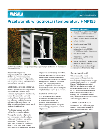 www.vaisala.com Przetwornik wilgotności i temperatury HMP155 Własności/korzyści HMP155 z dodatkową sondą temperatury i opcjonalnym zestawem do montażu w klatce Stevensona. Przetwornik wilgotności i temperatury Vaisala HUMICAP® HMP155 zapewnia wiarygodne pomiary temperatury i wilgotności. Jest przeznaczony do wymagających pomiarów na zewnątrz. Stabilność długoczasowa HMP155 posiada sprawdzony czujnik Vaisala HUMICAP®180R, który odznacza się wyjątkową stabilnością i znosi dobrze ciężkie warunki środowiskowe. Struktura sondy jest solidna a czujnik chroniony spiekanym filtrem teflonowym, dającym maksymalną ochronę przed wodą, pyłem i brudem. Podgrzewana sonda i wilgotne środowisko Wiarygodny pomiar wilgotności jest wyzwaniem w środowiskach, w których wilgotność jest bliska nasycenia. Pomiary mogą być przerwane przez mgłę, zamglenie, deszcz i silną rosę. Mokra sonda może nie dawać dokładnych wyników wilgotności otaczającego powietrza. To jest środowisko dla którego firma Vaisala opracowała opatentowaną podgrzewaną sondę w celu uzyskania wiarygodnych wyników. Ponieważ sonda jest ciągle podgrzewana, poziom wilgotności wewnątrz jest niższy od otoczenia. Zatem maleje też ryzyko kondensacji wody na sondzie. Szybkie pomiary Przy jej niskiej stałej czasowej, dodatkowa sonda temperatury w HMP155 jest idealna do pomiaru w środowiskach o zmiennej temperaturze. Nowy filtr membranowy przyspiesza pomiar wilgotności. ▪ Czujnik Vaisala HUMICAP®180R - świetna stabilność czasowa ▪ Opcjonalnie podgrzewana sonda i czyszczenie chemiczne ▪ ▪ ▪ Łatwy montaż ▪ ▪ Obudowa IP66 ▪ Różne możliwości podłączenia: napięcie, RS-485, Pt100 ▪ Zastosowania: meteorologia, lotnictwo, utrzymanie dróg Serwisowe złącze USB Pasuje do osłon antyradiacyjnych DTR13 i DTR503 oraz klatki Stevensona Opcjonalna szybka sonda temperatury Duża żywotność Ochrona czujnika przed rozproszonym i bezpośrednim promieniowaniem słonecznym oraz opadami zwiększa jego żywotność. Dlatego Vaisala zaleca montaż HMP155 w jednej z następujących osłon antyradiacyjnych: DTR503, DTR13 lub klatce Stevensona. Dla dodatkowej sondy temperatury, dostępy jest zestaw montażowy, który można stosować wraz z osłoną antyradiacyjną DTR502. Łatwa konserwacja Sonda może być kalibrowana za pomocą komputera i kabla USB, przycisków lub miernika MI70. Dane techniczne Parametry ogólne Parametry metrologiczne WILGOTNOŚĆ WZGLĘDNA Zakres pomiarowy Dokładność (w tym nieliniowość, histereza i powtarzalność) +15…+25°C 0…100 %RH ±1 %RH (0…90 %RH) ±1.7 %RH (90…100 %RH) -20…+40°C ±(1.0 + 0.008 x wskazanie) %RH -40…-20°C ±(1.2 + 0.012 x wskazanie) %RH +40…+60°C ±(1.2 + 0.012 x wskazanie) %RH -60…-40°C ±(1.4 + 0.032 x wskazanie) %RH Niepewność kalibracji ±0.6 %RH (0…40 %RH)* fabrycznej (+20°C) ±1.0 %RH (40…97 %RH)* * Zdefiniowany jako ±2 odchylenia standardowe. Możliwe małe zmiany, patrz te certyfikat kalibracji. Zalecany czujnik wilgotności HUMICAP®180R(C) Stałą czasowa w +20°C i nieruchomym powietrzu z filtrem spiekanym z PTFE 63 % 20 s 90 % 60 s TEMPERATURA Zakres pomiarowy -80…+60°C Dokładność na wyjściu napięciowym -80…+20°C ±(0.226 - 0.0028 x temperatura) °C +20…+60°C ±(0.055 + 0.0057 x temperatura) °C wyjście pasywne (rezystancyjne) zgodnie z IEC 751 ±(0.1 + 0.00167 x |temperatura|)°C klasa 1/3 B wyjście RS485 -80…+20°C ±(0.176 - 0.0028 x temperatura) °C +20…+60°C ±(0.07 + 0.0025 x temperatura) °C Dokładność w całym zakresie temperatury Czujnik temperatury Pt100 RTD klasa F0.1 IEC 60751 Stała czasowa z dodatkowym czujnikiem temperatury w powietrzu o prędkości 3 m/s 63 % <20 s 90 % <35 s Zakres temperatury pracy Temperatura przechowywania Złącze Długość kabli połączeniowych Materiał izolacji kabla Przekrój żył Kable serwisowe -80…+60°C -80…+60°C 8-pinowe złącze M12 3.5, 10 i 30 m PUR AWG26 kabel połączeniowy USB kabel połącz. do MI70 Długość kabla dodatkowej sondy T 2m Materiał obudowy PC Stopień ochrony obudowy IP66 Osłona czujnika spiekany PTFE opcja filtr membranowy Masa (przetwornik) 86 g Kompatybilność elektromagnetyczna. Spełnia wymagania normy EN61326-1, Urządzenia elektroniczne do pomiarów, sterowania i użytku laboratoryjnego - dla środowisk przemysłowych. Wejścia i wyjścia Napięcie zasilania 7…28 VDC* *Uwaga: minimalne napięcie zasilania 12 V dla sygnału wyjściowego 0…5 V i 16 V dla sygnału 0…10 V, podgrzewania sondy, czyszczenia chemicznego lub XHEAT. Wyjścia wyjście napięciowe 0…1 V, 0…5 V, 0…10 V rezystancyjne Pt100 (4-przewod.) RS485 Średni pobór prądu (+15 VDC, obciążenie 100 kΩ) wyjście 0…1 V <3 mA wyjście 0…10 V +0.5 mA RS485 <4 mA podczas czyszczenia chemicznego max. 110 mA z sondą podgrzewaną max. 150 mA Czas stabilizacji po włączeniu wyjście napięciowe 2s RS485 3s 0.5 Δ ºC 0.4 INNE ZMIENNE 0.3 temperatura punktu rosy/szronu, temperatura termometru mokrego, skład mieszaniny 0.2 0.1 ºC 0 Wymiary -0.1 -0.2 Wymiary w mm 267 -0.3 86 40 -0.4 -0.5 -80 -40 -20 12 RS485 output 0 20 40 60 voltage output 40 24 19 5.5 www.vaisala.com -60 Dystrybucja w Polsce: TEST-THERM Sp. z o.o., ul.Friedleina 4-6, 30-009 Kraków tel.: 12 632 1301, 12 632 6188, http://www.test-therm.pl Ref. B210752EN-E-PL ©Vaisala 2012 Zeskanuj kod aby uzyskać więcej informacji Niniejsza publikacja jest prawnie chroniona, a wszelkie prawa autorskie należą do Vaisala Oyj oraz jej partnerów. Wszelkie prawa zastrzeżone. Logotypy i/lub nazwy produktów są znakami twarowymi firmy Vaisala lub poszczególnych partnerów. Reprodukcja, transfer, rozpowszechnianie lub przechowywanie informacji zawartych w tej ulotce, w dowolnej formie, bez uprzedniej pisemnej zgody Vaisala Oyj, jest ściśle zabronione. Wszystkie dane — w tym techniczne — mogą ulec zmianie bez uprzedzenia. Jest to tłumaczenie oryginalnej wersj