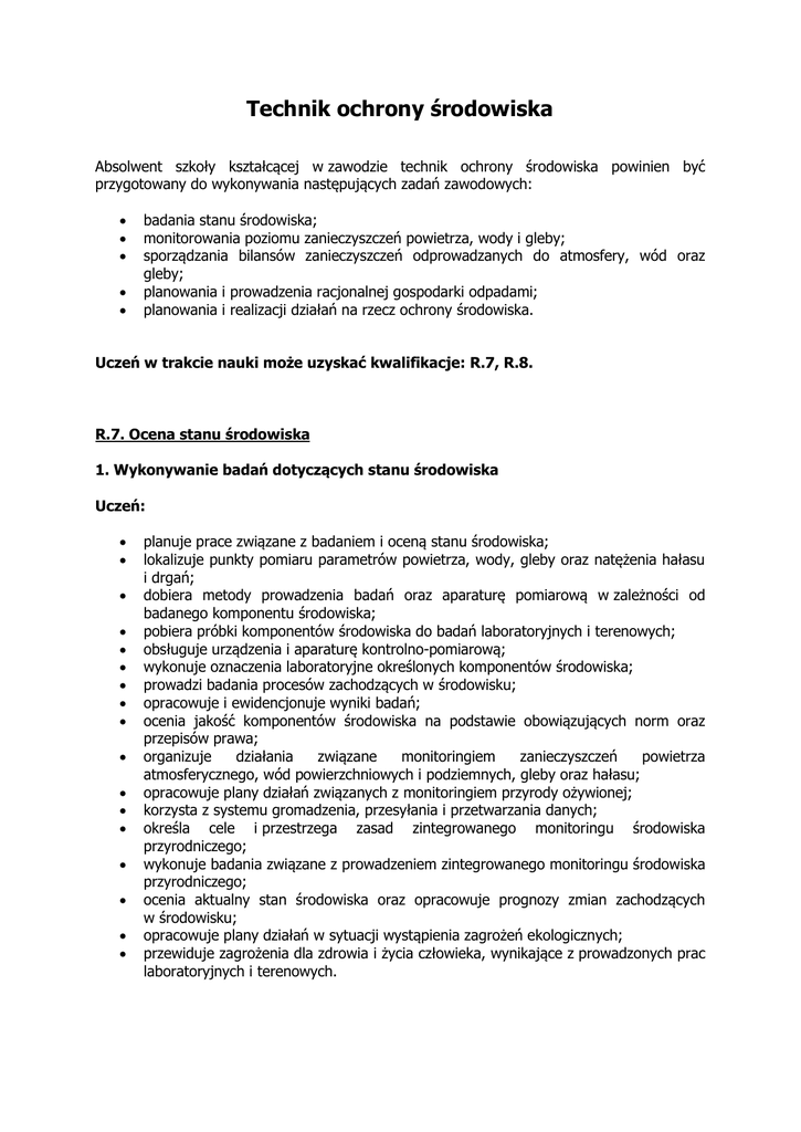 Technik ochrony środowiska Absolwent szkoły kształcącej w zawodzie technik ochrony środowiska powinien być przygotowany do wykonywania następujących zadań zawodowych: badania stanu środowiska; monitorowania poziomu zanieczyszczeń powietrza, wody i gleby; sporządzania bilansów zanieczyszczeń odprowadzanych do atmosfery, wód oraz gleby; planowania i prowadzenia racjonalnej gospodarki odpadami; planowania i realizacji działań na rzecz ochrony środowiska. Uczeń w trakcie nauki może uzyskać kwalifikacje: R.7, R.8. R.7. Ocena stanu środowiska 1. Wykonywanie badań dotyczących stanu środowiska Uczeń: planuje prace związane z badaniem i oceną stanu środowiska; lokalizuje punkty pomiaru parametrów powietrza, wody, gleby oraz natężenia hałasu i drgań; dobiera metody prowadzenia badań oraz aparaturę pomiarową w zależności od badanego komponentu środowiska; pobiera próbki komponentów środowiska do badań laboratoryjnych i terenowych; obsługuje urządzenia i aparaturę kontrolno-pomiarową; wykonuje oznaczenia laboratoryjne określonych komponentów środowiska; prowadzi badania procesów zachodzących w środowisku; opracowuje i ewidencjonuje wyniki badań; ocenia jakość komponentów środowiska na podstawie obowiązujących norm oraz przepisów prawa; organizuje działania związane monitoringiem zanieczyszczeń powietrza atmosferycznego, wód powierzchniowych i podziemnych, gleby oraz hałasu; opracowuje plany działań związanych z monitoringiem przyrody ożywionej; korzysta z systemu gromadzenia, przesyłania i przetwarzania danych; określa cele i przestrzega zasad zintegrowanego monitoringu środowiska przyrodniczego; wykonuje badania związane z prowadzeniem zintegrowanego monitoringu środowiska przyrodniczego; ocenia aktualny stan środowiska oraz opracowuje prognozy zmian zachodzących w środowisku; opracowuje plany działań w sytuacji wystąpienia zagrożeń ekologicznych; przewiduje zagrożenia dla zdrowia i życia człowieka, wynikające z prowadzonych prac laboratoryjnych i terenowych. 2. Ocena stopnia zanieczyszczenia środowiska Uczeń: przestrzega zasad sporządzania bilansów zanieczyszczeń powietrza, wody i gleby; określa stężenie i rozmieszczenie zanieczyszczeń powietrza, wody i gleby w różnych regionach kraju; sporządza bilanse zanieczyszczeń wód płynących, powietrza i gleby; opracowuje wyniki bilansów z wykorzystaniem specjalistycznych programów komputerowych; określa dopuszczalny stopień zanieczyszczenia środowiska na podstawie obowiązujących norm i przepisów prawa; oblicza stopień redukcji zanieczyszczeń gazów odlotowych i ścieków; oblicza emisje zanieczyszczeń na podstawie wyników monitoringu; ocenia aktualny stan środowiska na podstawie bilansu zanieczyszczeń; korzysta z informacji zamieszczanych w katastrze wodnym; określa warunki wydawania pozwoleń emisyjnych i decyzji wodnoprawnych; opracowuje instrukcje gospodarowania wodą; rozpoznaje rodzaje zagrożeń i określa ich wpływ na środowisko; oblicza opłaty za korzystanie ze środowiska; określa wpływ oddziaływania inwestycji szczególnie szkodliwych na środowisko przyrodnicze i ludzi. R.8. Planowanie i realizacja zadań związanych z ochroną środowiska 1. Planowanie i wykonywanie zadań dotyczących ochrony wód Uczeń: przestrzega zasad eksploatacji ujęć wód powierzchniowych i podziemnych; rozpoznaje źródła zanieczyszczenia wód powierzchniowych i podziemnych; dobiera metody uzdatniania wody; planuje proces uzdatniania wody w zależności od jej składu chemicznego; dobiera urządzenia do uzdatniania wody przeznaczonej do określonych celów; obsługuje urządzenia stosowane w procesie uzdatniania wody przeznaczonej do celów pitnych i przemysłowych; klasyfikuje ścieki według określonych kryteriów; analizuje procesy zachodzące podczas oczyszczania ścieków miejskich i przemysłowych; dobiera urządzenia do oczyszczania różnego rodzaju ścieków; prowadzi prace związane z oczyszczaniem ścieków miejskich i przemysłowych; rozpoznaje rodzaje i elementy przydomowej oczyszczalni ścieków; kieruje pracami związanymi z budową i eksploatacją przydomowych oczyszczalni ścieków; prowadzi prace związane z zagospodarowaniem osadów ściekowych; korzysta z dokumentacji projektowych sieci wodociągowych i kanalizacyjnych. 2. Planowanie oraz atmosferycznego wykonywanie zadań dotyczących ochrony powietrza Uczeń: rozpoznaje źródła zanieczyszczeń powietrza; określa rodzaj i stężenie zanieczyszczeń powietrza atmosferycznego; dobiera metody ochrony powietrza atmosferycznego przed zanieczyszczeniami; planuje działania związane z ograniczeniem emisji zanieczyszczeń do atmosfery; organizuje i prowadzi prace związane z usuwaniem zanieczyszczeń z powietrza atmosferycznego; propaguje stosowanie bezodpadowych technologii wytwarzania energii elektrycznej i cieplnej; określa wpływ hałasu na organizm człowieka i środowisko przyrodnicze; dobiera metody i środki ochrony przed hałasem; podejmuje działania związane z ograniczaniem hałasu i drgań w środowisku; stosuje przepisy prawa dotyczące ochrony przed hałasem i drganiami. 3. Prowadzenie racjonalnej gospodarki odpadami oraz prac dotyczących ochrony gleb Uczeń: klasyfikuje odpady według określonych kryteriów; określa warunki i metody unieszkodliwiania odpadów; organizuje zbiórkę i wywóz odpadów komunalnych; przestrzega zasad składowania i magazynowania odpadów; sortuje odpady komunalne; dobiera sposoby zagospodarowania odpadów; dobiera metody unieszkodliwiania odpadów; prowadzi kampanię na rzecz ochrony środowiska; nadzoruje prace związane z eksploatacją składowiska odpadów komunalnych; prowadzi prace związane z kompostowaniem odpadów; planuje i prowadzi prace związane ze spalaniem odpadów komunalnych oraz eksploatacją spalarni; prowadzi prace związane z zagospodarowaniem odpadów niebezpiecznych; dobiera metody unieszkodliwiania odpad