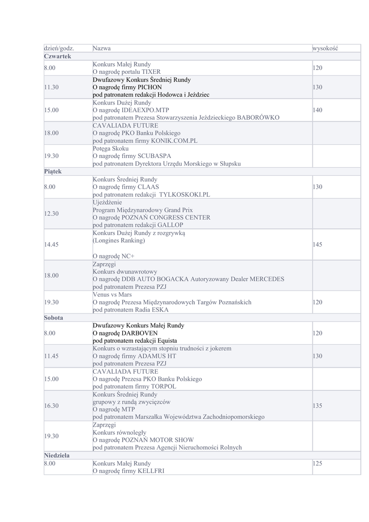 dzień/godz. Czwartek 8.00 11.30 15.00 18.00 19.30 Nazwa Konkurs Małej Rundy O nagrodę portalu TIXER Dwufazowy Konkurs Średniej Rundy O nagrodę firmy PICHON pod patronatem redakcji Hodowca i Jeździec Konkurs Dużej Rundy O nagrodę IDEAEXPO.MTP pod patronatem Prezesa Stowarzyszenia Jeździeckiego BABORÓWKO CAVALIADA FUTURE O nagrodę PKO Banku Polskiego pod patronatem firmy KONIK.COM.PL Potęga Skoku O nagrodę firmy SCUBASPA pod patronatem Dyrektora Urzędu Morskiego w Słupsku wysokość 120 130 140 Piątek 8.00 12.30 14.45 18.00 19.30 Konkurs Średniej Rundy O nagrodę firmy CLAAS pod patronatem redakcji TYLKOSKOKI.PL Ujeżdżenie Program Międzynarodowy Grand Prix O nagrodę POZNAŃ CONGRESS CENTER pod patronatem redakcji GALLOP Konkurs Dużej Rundy z rozgrywką (Longines Ranking) O nagrodę NC+ Zaprzęgi Konkurs dwunawrotowy O nagrodę DDB AUTO BOGACKA Autoryzowany Dealer MERCEDES pod patronatem Prezesa PZJ Venus vs Mars O nagrodę Prezesa Międzynarodowych Targów Poznańskich pod patronatem Radia ESKA 130 145 120 Sobota 8.00 11.45 15.00 16.30 19.30 Niedziela 8.00 Dwufazowy Konkurs Małej Rundy O nagrodę DARBOVEN pod patronatem redakcji Equista Konkurs o wzrastającym stopniu trudności z jokerem O nagrodę firmy ADAMUS HT pod patronatem Prezesa PZJ CAVALIADA FUTURE O nagrodę Prezesa PKO Banku Polskiego pod patronatem firmy TORPOL Konkurs Średniej Rundy grupowy z rundą zwycięzców O nagrodę MTP pod patronatem Marszałka Województwa Zachodniopomorskiego Zaprzęgi Konkurs równoległy O nagrodę POZNAŃ MOTOR SHOW pod patronatem Prezesa Agencji Nieruchomości Rolnych Konkurs Małej Rundy O nagrodę firmy KELLFRI 120 130 135 125 11:30 13.30 15.30 pod patronatem Prezesa PZHK Ujeżdżenie Program Grand Prix Free Style O nagrodę firmy Kwiaty Polskie Sztafeta (kuc / duży koń) Grand Prix z rozgrywką (Longines Ranking) O nagrodę Prezesa PKO Banku Polskiego pod patronatem Prezydenta Miasta Kołobrzeg 145