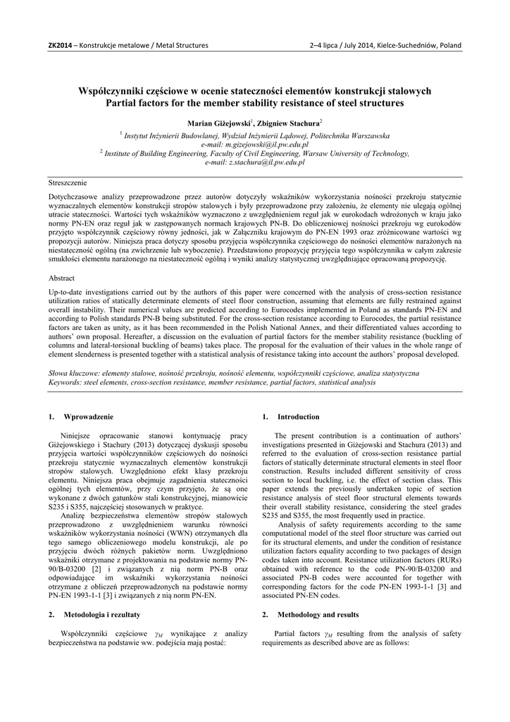 ZK2014 – Konstrukcje metalowe / Metal Structures 2–4 lipca / July 2014, Kielce-Suchedniów, Poland Współczynniki częściowe w ocenie stateczności elementów konstrukcji stalowych Partial factors for the member stability resistance of steel structures Marian Giżejowski1, Zbigniew Stachura2 1 Instytut Inżynierii Budowlanej, Wydział Inżynierii Lądowej, Politechnika Warszawska e-mail: [email protected] 2 Institute of Building Engineering, Faculty of Civil Engineering, Warsaw University of Technology, e-mail: [email protected] Streszczenie Dotychczasowe analizy przeprowadzone przez autorów dotyczyły wskaźników wykorzystania nośności przekroju statycznie wyznaczalnych elementów konstrukcji stropów stalowych i były przeprowadzone przy założeniu, że elementy nie ulegają ogólnej utracie stateczności. Wartości tych wskaźników wyznaczono z uwzględnieniem reguł jak w eurokodach wdrożonych w kraju jako normy PN-EN oraz reguł jak w zastępowanych normach krajowych PN-B. Do obliczeniowej nośności przekroju wg eurokodów przyjęto współczynnik częściowy równy jedności, jak w Załączniku krajowym do PN-EN 1993 oraz zróżnicowane wartości wg propozycji autorów. Niniejsza praca dotyczy sposobu przyjęcia współczynnika częściowego do nośności elementów narażonych na niestateczność ogólną (na zwichrzenie lub wyboczenie). Przedstawiono propozycję przyjęcia tego współczynnika w całym zakresie smukłości elementu narażonego na niestateczność ogólną i wyniki analizy statystycznej uwzględniające opracowaną propozycję. Abstract Up-to-date investigations carried out by the authors of this paper were concerned with the analysis of cross-section resistance utilization ratios of statically determinate elements of steel floor construction, assuming that elements are fully restrained against overall instability. Their numerical values are predicted according to Eurocodes implemented in Poland as standards PN-EN and according to Polish standards PN-B being substituted. For the cross-section resistance according to Eurocodes, the partial resistance factors are taken as unity, as it has been recommended in the Polish National Annex, and their differentiated values according to authors’ own proposal. Hereafter, a discussion on the evaluation of partial factors for the member stability resistance (buckling of columns and lateral-torsional buckling of beams) takes place. The proposal for the evaluation of their values in the whole range of element slenderness is presented together with a statistical analysis of resistance taking into account the authors’ proposal developed. Słowa kluczowe: elementy stalowe, nośność przekroju, nośność elementu, współczynniki częściowe, analiza statystyczna Keywords: steel elements, cross-section resistance, member resistance, partial factors, statistical analysis 1. Wprowadzenie 1. Introduction Niniejsze opracowanie stanowi kontynuację pracy Giżejowskiego i Stachury (2013) dotyczącej dyskusji sposobu przyjęcia wartości współczynników częściowych do nośności przekroju statycznie wyznaczalnych elementów konstrukcji stropów stalowych. Uwzględniono efekt klasy przekroju elementu. Niniejsza praca obejmuje zagadnienia stateczności ogólnej tych elementów, przy czym przyjęto, że są one wykonane z dwóch gatunków stali konstrukcyjnej, mianowicie S235 i S355, najczęściej stosowanych w praktyce. Analizę bezpieczeństwa elementów stropów stalowych przeprowadzono z uwzględnieniem warunku równości wskaźników wykorzystania nośności (WWN) otrzymanych dla tego samego obliczeniowego modelu konstrukcji, ale po przyjęciu dwóch różnych pakietów norm. Uwzględniono wskaźniki otrzymane z projektowania na podstawie normy PN90/B-03200 [2] i związanych z nią norm PN-B oraz odpowiadające im wskaźniki wykorzystania nośności otrzymane z obliczeń przeprowadzonych na podstawie normy PN-EN 1993-1-1 [3] i związanych z nią norm PN-EN. The present contribution is a continuation of authors’ investigations presented in Giżejowski and Stachura (2013) and referred to the evaluation of cross-section resistance partial factors of statically determinate structural elements in steel floor construction. Results included different sensitivity of cross section to local buckling, i.e. the effect of section class. This paper extends the previously undertaken topic of section resistance analysis of steel floor structural elements towards their overall stability resistance, considering the steel grades S235 and S355, the most frequently used in practice. Analysis of safety requirements according to the same computational model of the steel floor structure was carried out for its structural elements, and under the condition of resistance utilization factors equality according to two packages of design codes taken into account. Resistance utilization factors (RURs) obtained with reference to the code PN-90/B-03200 and associated PN-B codes were accounted for together with corresponding factors for the code PN-EN 1993-1-1 [3] and associated PN-EN codes. 2. 2. Metodologia i rezultaty Współczynniki częściowe γM wynikające z analizy bezpieczeństwa na podstawie ww. podejścia mają postać: Methodology and results Partial factors γM resulting from the analysis of safety requirements as described above are as follows: ZK2014 – Konstrukcje metalowe / Metal Structures 2–4 lipca / July 2014, Kielce-Suchedniów, Poland - w przypadku elementów zginanych w płaszczyźnie większej - in case of elements bent in the plane of greater cross-section bezwładności przekroju i ulegających zwichrzeniu: moment of inertia and subjected to lateral-torsional buckling: γ G , PN + γ Q , PN ⋅ψ M M M χ γs γ M = b , Rk , EN ⋅ Ed , PN γ s = c , Rk , EN ⋅ LT ⋅ (1) M b , Rk , PN M Ed , EN M c , Rk , PN ϕ LT γ G , EN + γ Q , EN ⋅ψ ( ( - w przypadku elementów ściskanych osiowo i ulegających różnym f