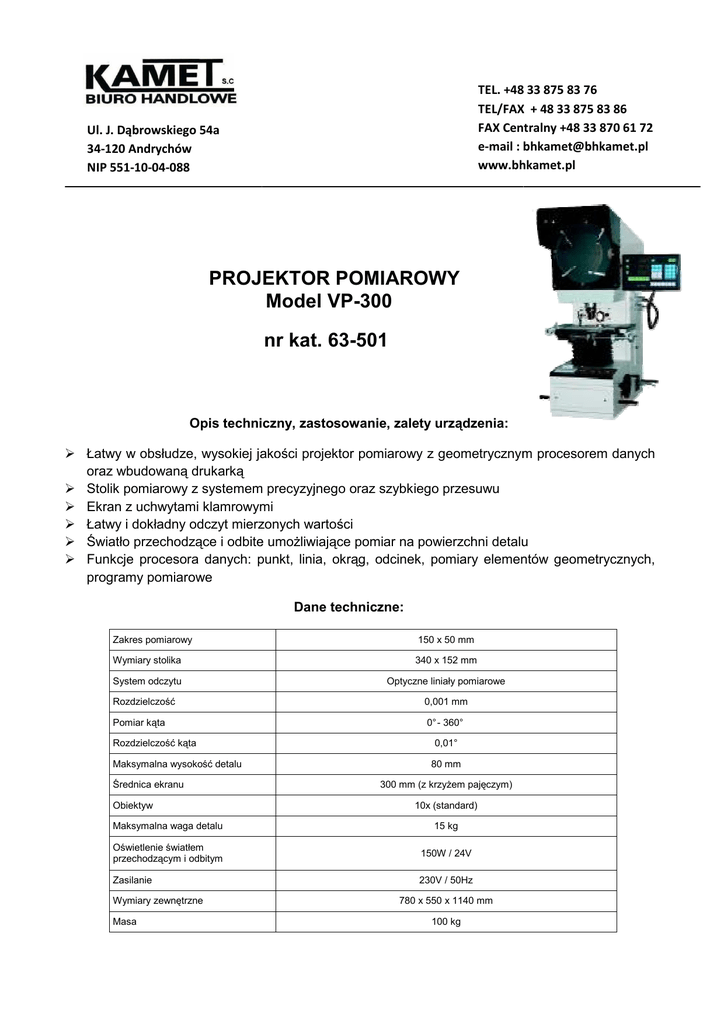 TEL. +48 33 875 83 76 TEL/FAX + 48 33 875 83 86 FAX Centralny +48 33 870 61 72 e-mail : [email protected] www.bhkamet.pl bhkamet.pl Ul. J. Dąbrowskiego 54a 34-120 Andrychów NIP 551-10-04-088 PROJEKTOR POMIAROWY Model VP-300 nr kat. 63-501 Opis techniczny, zastosowanie, zalety urządzenia: urz Łatwy w obsłudze, wysokiej jakości jako projektor pomiarowy z geometrycznym procesorem danych oraz wbudowaną drukarką Stolik pomiarowy z systemem precyzyjnego oraz szybkiego przesuwu Ekran z uchwytami klamrowymi Łatwy i dokładny dny odczyt mierzonych wartości warto Światło przechodzące ce i odbite umożliwiające ce pomiar na powierzchni detalu Funkcje procesora danych: punkt, linia, okrąg, okr g, odcinek, pomiary elementów geometrycznych, programy pomiarowe Dane techniczne: Zakres pomiarowy 150 x 50 mm Wymiary stolika 340 x 152 mm System odczytu Optyczne liniały pomiarowe Rozdzielczość 0,001 mm Pomiar kąta 0° - 360° Rozdzielczość kąta Maksymalna wysokość detalu Średnica ekranu Obiektyw 0,01° 80 mm 300 mm (z krzyżem pajęczym) 10x (standard) Maksymalna waga detalu 15 kg Oświetlenie światłem przechodzącym i odbitym 150W / 24V Zasilanie 230V / 50Hz Wymiary zewnętrzne Masa 780 x 550 x 1140 mm 100 kg Wyposażenie standardowe: w cenie Projektor pomiarowy z obiektywem o powiększeniu 10x Cena specjalna kompletu: 5 950,00 EUR Wyposażenie dodatkowe: Stół obrotowy 360° Ø100 mm nr kat. 63-561 Cena specjalna: 490,00 EUR Obiektyw o powiększeniu 20x nr kat. 63-571 Cena specjalna: 650,00 EUR - W cenie: Transport, uruchomienie, szkolenie, instrukcja w języku polskim - Ceny netto w EUR. Do cen należy doliczyć podatek VAT 23% - Fakturę wystawiamy w PLN. Przy sprzedaży obowiązuje aktualny kurs sprzedaży walut banku PeKaO S.A. - Termin realizacji: Do uzgodnienia - Warunki płatności: Do uzgodnienia - Warunki dostawy: Na koszt dostawcy - Zamówienia i zapytania prosimy kierować na fax +48 33 870 61 72 lub mail [email protected] Łączymy wyrazy szacunku