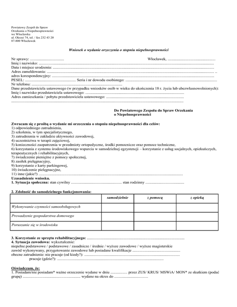 Powiatowy Zespół do Spraw Orzekania o Niepełnosprawności we Włocławku ul. Okrzei 74, tel. / fax 232 43 20 87-800 Włocławek Wniosek o wydanie orzeczenia o stopniu niepełnosprawności Nr sprawy: .................................. Włocławek, ................................................ Imię i nazwisko: ................................................................................................................................................................................ Data i miejsce urodzenia: .................................................................................................................................................................. Adres zameldowania: ........................................................................................................................................................................ .. adres korespondencyjny: ................................................................................................................................................................... PESEL: ................................................... Seria i nr dowodu osobistego: ............................................................................................ Nr telefonu: ........................................................................................... Dane przedstawiciela ustawowego (w przypadku wniosków osób w wieku do ukończenia 18 r. życia lub ubezwłasnowolnionych): Imię i nazwisko przedstawiciela ustawowego: ................................................................................................... Adres zamieszkania / pobytu przedstawiciela ustawowego: .............................................................................. ............................................................................................................................................................................. Do Powiatowego Zespołu do Spraw Orzekania o Niepełnosprawności Zwracam się z prośbą o wydanie mi orzeczenia o stopniu niepełnosprawności dla celów: 1) odpowiedniego zatrudnienia, 2) szkolenia, w tym specjalistycznego, 3) zatrudnienia w zakładzie aktywności zawodowej, 4) uczestnictwa w terapii zajęciowej, 5) konieczności zaopatrzenia w przedmioty ortopedyczne, środki pomocnicze oraz pomoce techniczne, 6) korzystania z systemu środowiskowego wsparcia w samodzielnej egzystencji – korzystanie z usług socjalnych, opiekuńczych, terapeutycznych i rehabilitacyjnych, 7) świadczenie pieniężne z pomocy społecznej, 8) zasiłek pielęgnacyjny, 9) korzystanie z karty parkingowej, 10) świadczenie pielęgnacyjne, 11) inne (jakie?) ................................................................................................................................................. Uzasadnienie wniosku. 1. Sytuacja społeczna: stan cywilny ................................................... stan rodzinny ....................................... 2. Zdolność do samodzielnego funkcjonowania: samodzielnie z pomocą z opieką Wykonywanie czynności samoobsługowych Prowadzenie gospodarstwa domowego Poruszanie się w środowisku 3. Korzystanie ze sprzętu rehabilitacyjnego: .................................................................................................. 4. Sytuacja zawodowa: wykształcenie: niepełne podstawowe / podstawowe / zasadnicze / średnie / wyższe zawodowe / wyższe magisterskie zawód wykonywany, przygotowanie zawodowe lub posiadane kwalifikacje ................................................ obecne zatrudnienie: nie pracuje (od kiedy?): ................................................................................................ pracuje (gdzie?): ........................................................................................................... Oświadczam, że: 1. Posiadam/nie posiadam* ważne orzeczenie wydane w dniu ................. przez ZUS/ KRUS/ MSWiA/ MON* ze skutkiem (podać grupę) .......................................................... wydane na okres do .................................. 2. Składałem / nie składałem* uprzednio wniosku o ustalenie stopnia niepełnosprawności: kiedy?............................, z jakim skutkiem? (podać stopień niepełnosprawności) ........................................ na okres do .................................../ na stałe, orzeczenie nr ..................................wydane przez Powiatowy/ Miejski/ Wojewódzki Zespół ds. Orzekania o Niepełnosprawności, Sąd Pracy i Ubezpieczeń Społecznych .......................................................................................................................................................... 3.Mogę / nie mogę* przybyć na posiedzenie składu orzekającego. (Jeżeli nie, to należy załączyć zaświadczenie lekarskie potwierdzające niemożność wzięcia udziału w posiedzeniu z powodu obłożnej i długotrwałej choroby). 4.Pobieram / nie pobieram* świadczenie z ubezpieczenia społecznego (jakie?): ......................................................................................................................................................................... 5.W razie stwierdzonej przez zespół orzekający konieczności wykonania badań dodatkowych, konsultacji specjalistycznych lub obserwacji szpitalnych, uzupełniających złożone zaświadczenie o stanie zdrowia, wydane przez lekarza nie będącego lekarzem ubezpieczenia zdrowotnego, jestem świadomy wymogu ponoszenia ich kosztów we własnym zakresie. OŚWIADCZAM, ŻE DANE ZAWARTE WE WNIOSKU SĄ ZGODNE ZE STANEM FAKTYCZNYM I JESTEM ŚWIADOMY ODPOWIEDZIALNOŚCI ZA ZEZNANIE NIEPRAWDY LUB ZATAJENIA PRAWDY. Wyrażam zgodę na przetwarzanie danych osobowych zawartych we wniosku dla celów ustalenia stopnia niepełnosprawności zgodnie z ustawą z dnia 29 sierpnia 1997 r. o ochronie danych osobowych (Dz. U. z 1997 r., Nr 133, poz. 883 z późn. zm.). W załączeniu do wniosku p