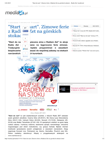 2.02.2015 "Start do nart". Zimowe ferie z Radiem Zet na górskich stokach. - Radio Zet | media2.pl Media2.pl korzysta z plików cookie. Korzystając z serwisu zgadzasz się na ich przyjmowanie. Dowiedz się więcej lub kontynuuj. Łukasz Szewczyk 25.01.2015 (11:47) 2 komentarze "Start do nart". Zimowe ferie z Radiem Zet na górskich stokach. Dzisiaj Wczoraj 30.01.2015 0 Media 11 "Mamy Cię" wraca do TVN. Będzie hit? (wide… Poleć Media Udostępnij 6 Nowy serial "Mąż czy nie mąż" wiosną w TV… 0 Badania 3 Prawie 8 mln widzów oglądało mecz Polakó… "Start do nart" i "Bezpieczna zima z Radiem Zet" to akcje Radia Zet przygotowane na tegoroczne ferie zimowe. 0 Tradycyjnie stacja będzie przypominać o zasadach Tweet bezpieczeństwa i zapraszać do wspólnej zabawy na stokach + narciarskich w górskich kurortach. Badania 3 Styczeń TV: TVP1 i Polsat liderami. Nickelod… Media 3 Zimowe pasmo "Winter City" oraz nowe pora… wykop Media 1 komentarz Fenomen polskich operatorów w lutym w Ale kino+ Zima z Radiem ZET 2015 "Start do nart" to cykl weekendowych eventów, z którymi Radio ZET odwiedzi sześć górskich ośrodków: Czarna Góra (2325.01), Ski Arena Łysa Góra/Jelenia Góra (30.011.02), Ustrzyki Dolne (68.02), Szczyrk (1315.02), Zakopane (20 22.02) oraz Białka Tatrzańska (27.021.03). W specjalnych strefach na gości będą czekać zabawy i konkursy rodzinne, testowanie sprzętu narciarskiego, ćwiczenia rozgrzewające pod okiem instruktorów, czy gorąca herbata. Będzie również możliwość sprawdzenia swoich umiejętności w zawodach narciarskich. Akcję organizuje Eurozet Live. Partnerami są: Atomic, Normaflex, Plus/LG oraz KIA. Patron medialny: skionline.pl. Więcej o przygotowanych atrakcjach na www.startdonart.pl. http://media2.pl/media/117411-Start-do-nart.-Zimowe-ferie-z-Radiem-Zet-na-gorskich-stokach..html 1/2 2.02.2015 "Start do nart". Zimowe ferie z Radiem Zet na górskich stokach. - Radio Zet | media2.pl Jak co roku Radio ZET będzie też edukować w zakresie bezpieczeństwa na stokach. Tym razem w ramach akcji "Bezpieczna zima z Radiem ZET" instruktorzy będą nagradzać pozytywne zachowania narciarzy, ale też piętnować te stwarzające zagrożenie. Niebezpieczni narciarze otrzymają "czerwone kartki" i zostaną pouczeni. Akcję wspierają GOPR i Policja. Wzorem poprzednich lat w miasteczkach Radia ZET zlokalizowanych u podnóża stoków będą organizowane gry i zabawy dla najmłodszych i całych rodzin. "Bezpieczna zima z Radiem ZET" zawita do Beskidzkiej 5, czyli Istebnej (2425.01), Brennej (31.011.02), Wisły (78.02), Ustronia (1415.02) oraz Szczyrku (2122.02). Partnerami akcji są: Beskidzka 5, Hi Tec, Las Vegas, Mokate oraz Kamelleon. Patroni medialni: Gazeta Wyborcza i skionline.pl. http://media2.pl/media/117411-Start-do-nart.-Zimowe-ferie-z-Radiem-Zet-na-gorskich-stokach..html 2/2