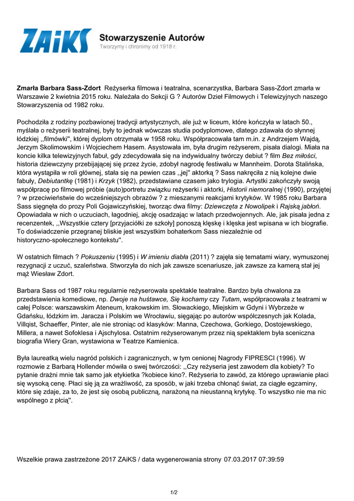 Stowarzyszenie Autorów ZAiKS - Zmar³a Barbara Sass