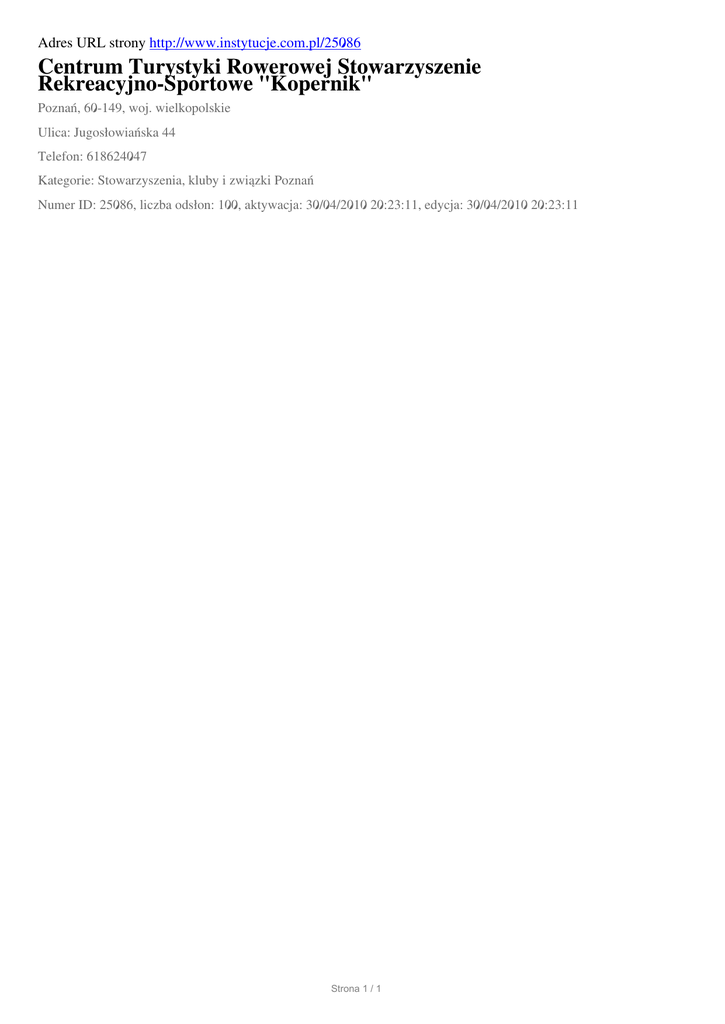 Adres URL strony http://www.instytucje.com.pl/25086 Centrum Turystyki Rowerowej Stowarzyszenie Rekreacyjno-Sportowe "Kopernik" Poznań, 60-149, woj. wielkopolskie Ulica: Jugosłowiańska 44 Telefon: 618624047 Kategorie: Stowarzyszenia, kluby i związki Poznań Numer ID: 25086, liczba odsłon: 100, aktywacja: 30/04/2010 20:23:11, edycja: 30/04/2010 20:23:11 Strona 1 / 1