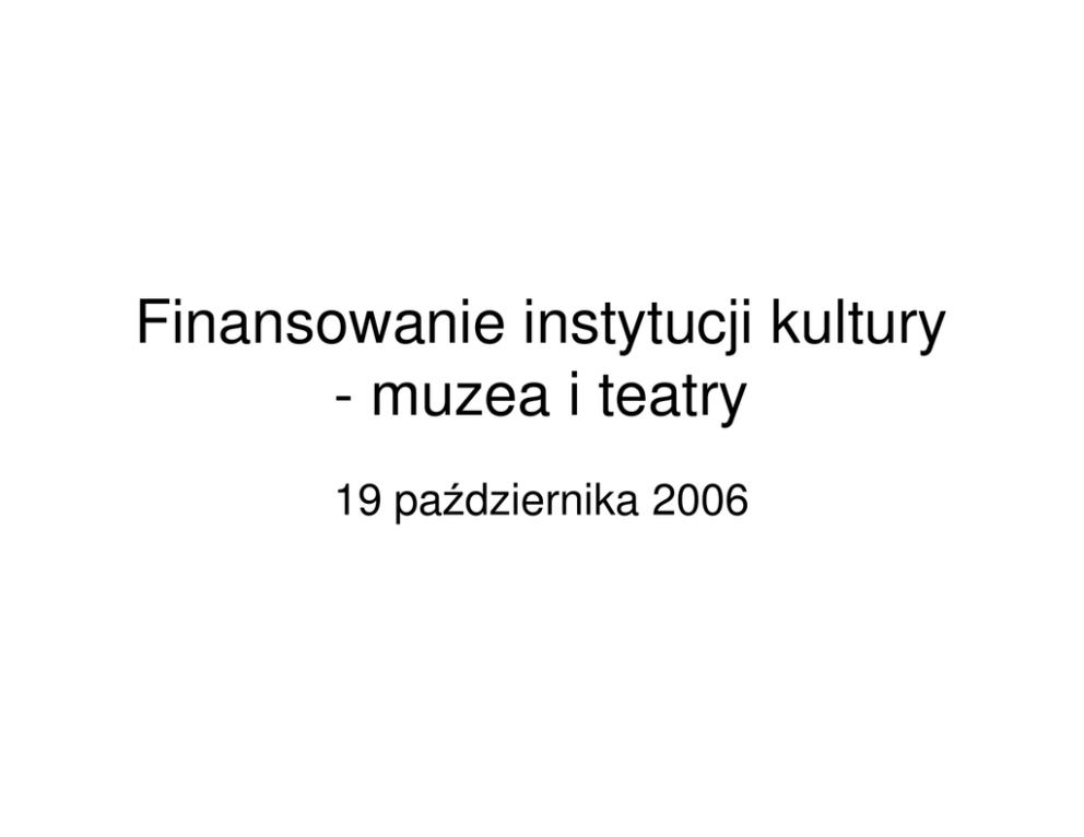 Finansowanie instytucji kultury - muzea i teatry 19 października 2006 Finansowanie, a ekonomia • Dobro publiczne, a dobro prywatne: – dotacja produkcji versus dotacja konsumpcji /bilet do kina? do teatru? płyta?/ • Kulturotwórcza rola mecenatu – powszechne przekonania (common beliefs) – niezależność, a mecenat – Michael Schearer i mecenat oraz prawa autorskie Ministerstwo Kultury • Budżet centralny – dotacje podmiotowe /dla konkretnej instytucji/ – dotacje celowe /dla jakiegoś przedsięwzięcia/ – zależność bez dotacji /wynik finansowy do przekazania, wpływ merytoryczny/ • Zapisy w budżetach – budżet ministerstwa /pracodawca, decyzyjność/ – budżety niezależne (ale centralne) /teatry, muzea, szkoły.../ – budżety samorządowe /ustawa o działach..., Muzea • Finansowanie – Ministerstwo Kultury – Jednostki samorządu terytorialnego – Organizacje pozarządowe/instytucje prywatne – Sponsorzy (podmiotowo i przedmiotowo) Muzea • Ustawa o muzeach: – not-for-profit – tylko państwowe muzea (NGO nie mogą) – cele: • • • • • gromadzenie, udostępnianie dla edukacji zabezpieczanie, konserwowanie, katalogowanie powołuje je statut jeden dzień w tygodniu nieodpłatny WNIOSKI??? Teatry • Finansowanie – Ministerstwo Kultury (20 placówek w Polsce) – Jednostki samorządu terytorialnego – Organizacje pozarządowe/instytucje prywatne – Sponsorzy (podmiotowo i przedmiotowo) Teatry publiczne • Ustawa o działach: – finansowanie podmiotowe – wsparcie przedmiotowe nieobowiązkowe WNIOSKI: • przerost zatrudnienia • przerost wynagrodzeń • brak rachunku ekonomicznego KLUCZ: DOTACJA Teatry • Pensja aktora • Honorarium za spektakl („winner takes all”) • Koszty techniczne • Koszty administracji • Koszty produkcji – Realne a budżetowane... Teatry publiczne • Przykłady „+” – Teatr Współczesny we Wrocławiu – Teatr im. Jaracza w Legnicy – Teatr Powszechny im. Hubnera w Warszawie • Przykłady „-” – Teatr Narodowy w Warszawie (1 maja?) – Teatr Narodowy w Krakowie – Teatr Stary (ostatnie dwa sezony?) – Teatr Nowy im. Łomnickiego w Poznaniu (remont?) • Dylemat „zespołu” Teatry prywatne • Studio Buffo (z siedzibą) – Model biznesowy • Teatr Montownia (bez siedziby) – Model biznesowy • Teatr-Rewia M. Potockiej – Model biznesowy Teatry pozarządowe • Teatr Polonia – Model biznesowy – Media („pierwszy prywatny teatr w Polsce”) – Przyszłość? Filmy • Instytut kinematografii • Telewizje (obowiązek ustawowy) – publiczne – prywatne • Prywatni inwestorzy • Studia filmowe (z zysków) Instytut Kinematografii • Cele – – – – – – – – tworzenie warunków do rozwoju polskiej produkcji filmów i koprodukcji filmowej; inspirowanie i wspieranie rozwoju wszystkich gatunków polskiej twórczości filmowej, a w szczególności filmów artystycznych. w tym przygotowania projektów filmowych, produkcji filmów i rozpowszechniania filmów; wspieranie działań mających na celu tworzenie warunków powszechnego dostępu do dorobku polskiej, europejskiej i światowej sztuki filmowej; wspieranie debiutów filmowych oraz rozwoju artystycznego młodych twórców filmowych; promocja polskiej twórczości filmowej; dofinansowywanie przedsięwzięć z zakresu przygotowania projektów filmowych, produkcji filmów, dystrybucji filmów i rozpowszechniania filmów, promocji polskiej twórczości filmowej i upowszechniania kultury filmowej, w tym produkcji filmów podejmowanych przez środowiska polonijne, świadczenie usług eksperckich organom administracji publicznej, wspieranie utrzymywania archiwów filmowych, wspieranie rozwoju potencjału polskiego niezależnego przemysłu kinematograficznego, a w szczególności małych i średnich przedsiębiorców działających w kinematografii. Instytut Kinematografii • Budżet i finansowanie Jakie przedsięwzięcia dofinansowuje Instytut? Instytut udziela dofinansowania przedsięwzięciom z zakresu: developmentu (przygotowania) projektów filmowych, produkcji filmowej, dystrybucji i rozpowszechniania filmów. Dofinansowuje także zadania z dziedziny upowszechnienia i promocji kultury filmowej, rozwoju infrastruktury kinematograficznej oraz zachowania i ochrony dziedzictwa kultury filmowej Instytut Kinematografii • Jakim budżetem dysponuje Instytut? Na mocy Ustawy głównymi źródłami finansowania kinematografii będą wpłaty na rzecz Instytutu stanowiące 1,5 % od przychodów z wyświetlania filmów i reklam w kinach, ze sprzedaży kaset VHS i DVD, z emisji reklam przez stacje telewizyjne, od przychodu operatorów telewizji kablowych i satelitarnych a takżejak to już miało miejsce wcześniej- przychody z zakładów i gier losowych oraz budżetu państwa. W ten sposób budżet polskiej kinematografii potroi się w stosunku do stanu sprzed uchwalenia ustawy i wyniesie około 100 mln złotych rocznie. Na tle budżetów europejskich instytutów filmowych oraz funduszy wspierających kinematografię, środki, którymi zarządzać będzie Polski Instytut Sztuki Filmowej nie są zbyt wielkie - dla porównania należy podać, iż w roku 2003 Francuzi dysponowali kwotą 490 mln euro, a średnia europejska wynosiła ok. 100 mln euro. Węgierski Instytut dysponować będzie kwotą ok. 23 mln euro, choć to kraj nieporównywalnie mniejszy, niż Polska. Nie mniej jednak źródła finansowania zapisane w ustawie pomogą potroić budżet kinematografii w stosunku do 2004r. Instytut Kinematografii • Struktura finansowania przedstawia się następująco: ok. 75 mln zł pochodzi zł ze źródeł komercyjnych 6 mln zł z Funduszu Promocji Kultury, czyli z zakładów i gier specjalnych 21 mln z budżetu państwa. Budżet Wpłaty Zakłady i gry specjalne Instytut Kinematografii • Instytut obowiązuje zasada częściowego udziału państwa przedsięwzięciu filmowym, określona procentowa i kwotowo: 50% budżetu fi