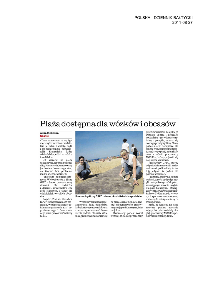 POLSKA - DZIENNIK BA£TYCKI 2011-08-27 Plaża dostępna dla wózków i obcasów Anna Bielińska Gdańsk - Teraz morze mam na wyciąg nięcie ręki, wcześniej widzia łam je tylko z daleka bądź z sopockiego mola - mówi Na talia Kraszyńska, która od dwóch lat jeździ na wózku inwalidzkim. Od wczoraj na plaży w Jelitkowie, na przedłużeniu ulicy Piastowskiej, umocowany jest bowiem drewniany podest, na którym bez problemu można wjechać wózkiem. -1 nie tylko - podkreśla Kata rzyna Wielochowska z firmy GPEC. - Jest on przeznaczony również dla rodziców z dziećmi, rowerzystów czy osób starszych, a także dla wielbicielek wysokich obca sów. Projekt „Podest - Plaża bez Barier", powstał w ramach pro gramu „Wspólne działanie - lo kalne zaangażowanie 2011" or ganizowanego i finansowa nego przez pracowników firmy GPEC. Pracownicy firmy GPEC od rana układali deski na podeście - Wyszliśmy z inicjatywą zre alizowania kilku pomysłów, które każdy z pracowników ma szansę zaproponować. Stwo rzenie podestu dla osób, które mają problemy z dostaniem się na plażę, okazał się najciekaw szy i zdobył najwięcej głosów przyznaje pani Katarzyna, lider projektu. Drewniany podest został wczoraj oficjalnie przekazany przedstawicielom Miejskiego Ośrodka Sportu i Rekreacji w Gdańsku. - Jak tylko usłysze liśmy o pomyśle, od razu się do niego przyłączyliśmy. Nowy podest ułatwi nam pracę, ale przede wszystkim pomoże po ruszać się po plaży mieszkań com - mówili pracownicy MOSiR-u, którzy pojawili się na plaży w Jelitkowie. Pracownicy GPEC, którzy od południa mocowali i malo wali deski, podkreślają, że ża łują jedynie, że podest nie powstał wcześniej. - Niestety, mamy już koniec wakacji, turyści będą więc mo gli z niego korzystać dopiero w następnym sezonie - wyjaś nia pani Katarzyna. - Zachę camy jednak wszystkich miesz kańców Trójmiasta do jesien nych spacerów nad morzem, a wiosną do zatrzymania się tu trochę dłużej. Zimą, ze względu na silne sztormy, podest zostanie zdjęty. Jak tylko zrobi się cie plej, pracownicy MOSiR-u po nownie zainstalują deski.