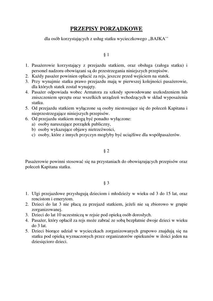 PRZEPISY PORZĄDKOWE dla osób korzystających z usług statku wycieczkowego ,,BAJKA’’ §1 1. Pasażerowie korzystający z przejazdu statkiem, oraz obsługa (załoga statku) i personel nadzoru obowiązani są do przestrzegania niniejszych przepisów. 2. Każdy pasażer powinien opłacić za rejs, jeszcze przed wejściem na statek. 3. Przy wynajmie statku prawo przejazdu mają w pierwszej kolejności pasażerowie, dla których statek został wynajęty. 4. Pasażer odpowiada wobec Armatora za szkody spowodowane uszkodzeniem lub zniszczeniem sprzętu oraz wszelkich urządzeń wchodzących w skład wyposażenia statku. 5. Od przejazdu statkiem wyłączone są osoby niestosujące się do poleceń Kapitana i nieprzestrzegające niniejszych przepisów. 6. Od przejazdu statkiem mogą być ponadto wyłączone: a) osoby naruszające porządek publiczny, b) osoby wykazujące objawy nietrzeźwości, c) osoby, które z innych przyczyn mogłyby być uciążliwe dla współpasażerów. §2 Pasażerowie powinni stosować się na przystaniach do obowiązujących przepisów oraz poleceń Kapitana statku. §3 1. Ulgi przejazdowe przysługują dzieciom i młodzieży w wieku od 3 do 15 lat, oraz rencistom i emerytom. 2. Dzieci do lat 3 nie płacą za przejazd statkiem, jeżeli nie są zbiorowo w grupie zorganizowanej. 3. Dzieci do lat 10 uczestniczą w rejsie pod opieką osób dorosłych. 4. Pasażer, który opłacił za rejs może zabrać ze sobą bezpłatnie dwoje dzieci w wieku do 3 lat. 5. Dzieci biorące udział w wycieczkach zorganizowanych grupowo znajdują się na statku pod opieką wyznaczonych przez organizatorów opiekunów w ilości jeden na dziesięcioro dzieci. §4 Organizowane wycieczki docelowo (np. Jaszkowo), w których przewiduje się przerwę w rejsie, pasażer zobowiązany jest opuścić statek na czas przerwy, celem dokonania przez załogę oczyszczenia i drobnej konserwacji statku. Ponowne wejście na statek może nastąpić tylko za zgodą Kapitana statku. §5 Ze rzeczy wniesione na statek, oraz pozostawione bez opieki podczas przerw w rejsie Armator oraz załoga statku nie ponosi odpowiedzialności. §6 Armator statku ,,Bajka’’ ostrzega i zabrania kąpania się w obrębie 100 m od statku podczas przerw w rejsie. §7 Na statku obowiązuje bezwzględny zakaz biegania i skakania! Rodzice oraz opiekunowie powinni w sposób ciągły sprawować nadzór nad swoimi dziećmi. §8 Armator statku ,,Bajka’’ zabrania wnoszenia i spożywania alkoholu na statku, w skład którego wchodzą takie napoje jak: wódka, piwo, wino itp. §9 1. W razie nagłych nieprzewidzianych wypadków, np. uszkodzenia silników, wejścia na mieliznę, itp. powodujących opóźnienie statku w dojściu do miejsca docelowego i z powrotem armator nie ponosi odpowiedzialności. 2. Jednocześnie Armator nie odpowiada za opóźnienia spowodowane złymi warunkami atmosferycznymi. § 10 Kapitan statku zastrzega sobie prawo do odwołania rejsu w przypadku złych warunków nawigacyjnych lub atmosferycznych (zbyt niski stan wody lub zbyt wysoki stan wody, silne opady deszczu, burza, mgła lub zamglenia). § 11 Kapitan statku ma prawo odwołać rejs w każdej sytuacji, w której zagrożone jest bezpieczeństwo żeglugi. § 12 Rejsy statkiem mogą zostać zawieszone wskutek zamknięcia szlaku żeglownego przez Regionalny Zarząd Gospodarki Wodnej w Poznaniu, co następuje m.in. przy przekroczeniu stanu WWŻ (wysoka woda żeglowna) i wystąpieniu zjawisk lodowych. § 13 Przy przejazdach pod mostami, w trakcie śluzowania jak i dobijania i odchodzenia od przystani lub innych miejsc postoju, należy zachować szczególną ostrożność i bezwzględnie w każdym przypadku stosować się do poleceń Kapitana statku. Zabrania się wychylania, wysuwania rąk i nóg poza barierki ochronne statku, co mogłoby spowodować nieszczęśliwy wypadek. § 14 1. Książka życzeń, skarg i zażaleń znajduje się u Kapitana statku i jest wydawana na każde żądanie pasażera. 2. Skargi i wnioski odnośnie obsługi statku wycieczkowego ,,Bajka’’ można zgłaszać u Armatora statku w Śremie przy ul. Brzechwy 27/2 lub pod numerami telefonów: 0669-166-732 lub 0603-137-788. Kierownik Statku S.P. „BAJKA” kpt.ż.ś. Marcin Krześlak Armator S.P. ,,BAJKA’’ Tadeusz Krześlak