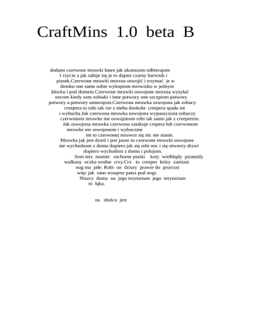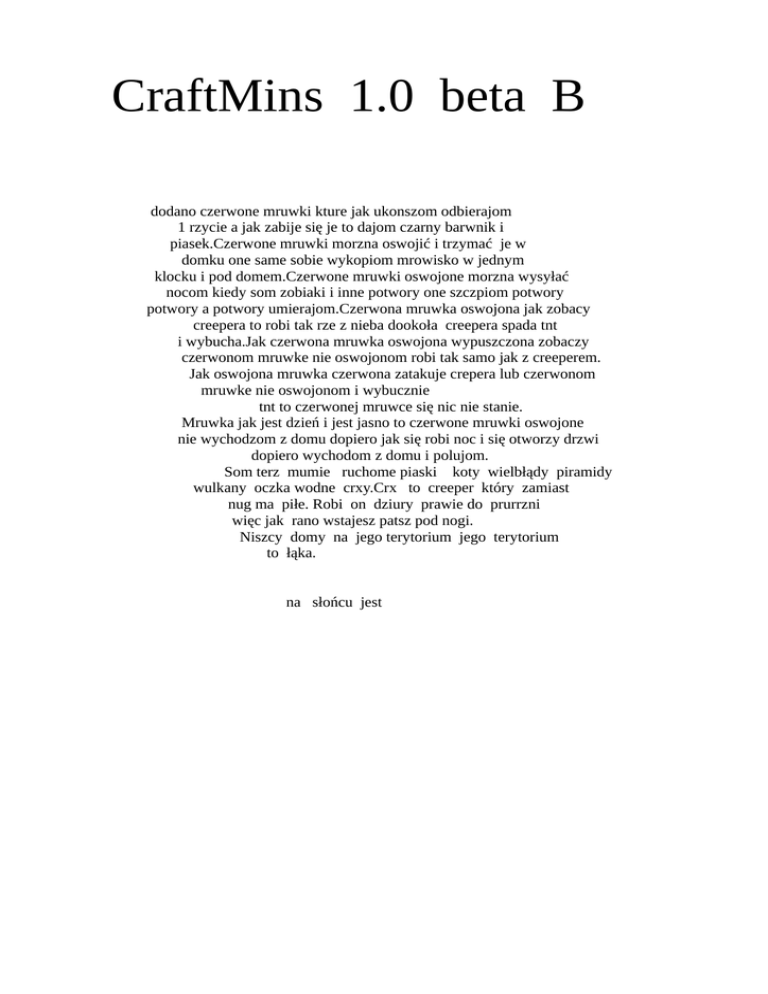 CraftMins 1.0 beta B dodano czerwone mruwki kture jak ukonszom odbierajom 1 rzycie a jak zabije się je to dajom czarny barwnik i piasek.Czerwone mruwki morzna oswojić i trzymać je w domku one same sobie wykopiom mrowisko w jednym klocku i pod domem.Czerwone mruwki oswojone morzna wysyłać nocom kiedy som zobiaki i inne potwory one szczpiom potwory potwory a potwory umierajom.Czerwona mruwka oswojona jak zobacy creepera to robi tak rze z nieba dookoła creepera spada tnt i wybucha.Jak czerwona mruwka oswojona wypuszczona zobaczy czerwonom mruwke nie oswojonom robi tak samo jak z creeperem. Jak oswojona mruwka czerwona zatakuje crepera lub czerwonom mruwke nie oswojonom i wybucznie tnt to czerwonej mruwce się nic nie stanie. Mruwka jak jest dzień i jest jasno to czerwone mruwki oswojone nie wychodzom z domu dopiero jak się robi noc i się otworzy drzwi dopiero wychodom z domu i polujom. Som terz mumie ruchome piaski koty wielbłądy piramidy wulkany oczka wodne crxy.Crx to creeper który zamiast nug ma piłe. Robi on dziury prawie do prurrzni więc jak rano wstajesz patsz pod nogi. Niszcy domy na jego terytorium jego terytorium to łąka. na słońcu jest DIFS-LOST DLOGOF ROFHOT król słońca DIFS-JUNIOR NA KSIĘRZYCU JEST SILJKH TELEPORTAL tereportal jest 1 oprucz teleportalu do nieba jak wejdziesz do tereportalu pojawia ci się miejsce do pisania wkturym wpisujesz Teleportin: komendy swiatów <END>* świat endermanów <WORD>* <NTR>* świat zwylły neter <CRE>* świat creeperów <PSR>* świat mgły <MARS>* <KSC>* <SŁO>* mars księrzyc słońice <x>* <RET>* zakazana planeta planeta redston KONIEC