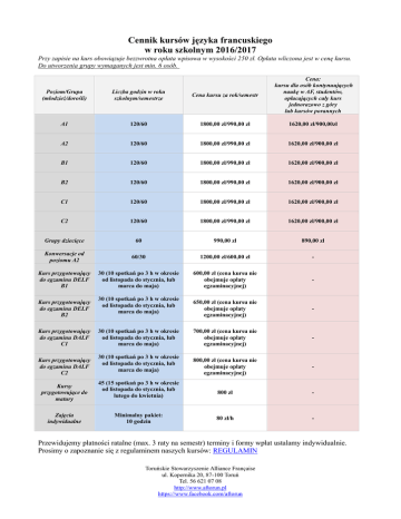 Cennik kursów języka francuskiego w roku szkolnym 2016/2017