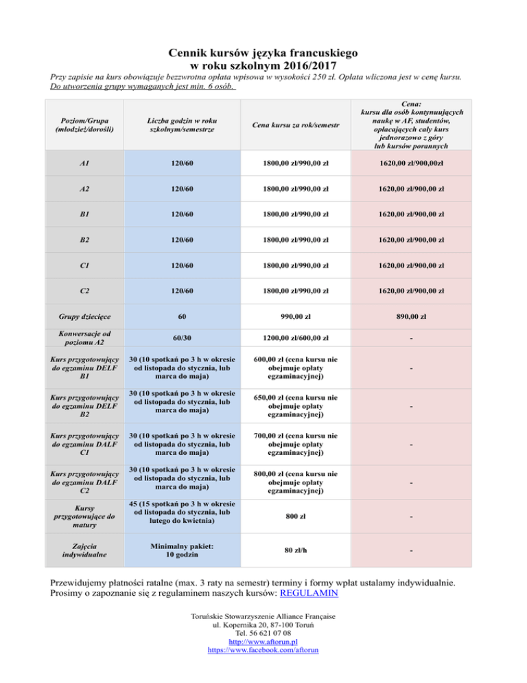 Cennik kursów języka francuskiego w roku szkolnym 2016/2017 Przy zapisie na kurs obowiązuje bezzwrotna opłata wpisowa w wysokości 250 zł. Opłata wliczona jest w cenę kursu. Do utworzenia grupy wymaganych jest min. 6 osób. Poziom/Grupa (młodzież/dorośli) Liczba godzin w roku szkolnym/semestrze Cena kursu za rok/semestr Cena: kursu dla osób kontynuujących naukę w AF, studentów, opłacających cały kurs jednorazowo z góry lub kursów porannych A1 120/60 1800,00 zł/990,00 zł 1620,00 zł/900,00zł A2 120/60 1800,00 zł/990,00 zł 1620,00 zł/900,00 zł B1 120/60 1800,00 zł/990,00 zł 1620,00 zł/900,00 zł B2 120/60 1800,00 zł/990,00 zł 1620,00 zł/900,00 zł C1 120/60 1800,00 zł/990,00 zł 1620,00 zł/900,00 zł C2 120/60 1800,00 zł/990,00 zł 1620,00 zł/900,00 zł Grupy dziecięce 60 990,00 zł 890,00 zł Konwersacje od poziomu A2 60/30 1200,00 zł/600,00 zł - Kurs przygotowujący do egzaminu DELF B1 30 (10 spotkań po 3 h w okresie od listopada do stycznia, lub marca do maja) 600,00 zł (cena kursu nie obejmuje opłaty egzaminacyjnej) - 650,00 zł (cena kursu nie obejmuje opłaty egzaminacyjnej) - 700,00 zł (cena kursu nie obejmuje opłaty egzaminacyjnej) - 800,00 zł (cena kursu nie obejmuje opłaty egzaminacyjnej) - 800 zł - 80 zł/h - Kurs przygotowujący do egzaminu DELF B2 Kurs przygotowujący do egzaminu DALF C1 Kurs przygotowujący do egzaminu DALF C2 Kursy przygotowujące do matury Zajęcia indywidualne 30 (10 spotkań po 3 h w okresie od listopada do stycznia, lub marca do maja) 30 (10 spotkań po 3 h w okresie od listopada do stycznia, lub marca do maja) 30 (10 spotkań po 3 h w okresie od listopada do stycznia, lub marca do maja) 45 (15 spotkań po 3 h w okresie od listopada do stycznia, lub lutego do kwietnia) Minimalny pakiet: 10 godzin Przewidujemy płatności ratalne (max. 3 raty na semestr) terminy i formy wpłat ustalamy indywidualnie. Prosimy o zapoznanie się z regulaminem naszych kursów: REGULAMIN Toruńskie Stowarzyszenie Alliance Française ul. Kopernika 20, 87-100 Toruń Tel. 56 621 07 08 http://www.aftorun.pl https://www.facebook.com/aftorun