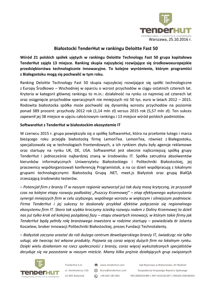 Warszawa, 25.10.2016 r. Białostocki TenderHut w rankingu Deloitte Fast 50 Wśród 21 polskich spółek ujętych w rankingu Deloitte Technology Fast 50 grupa kapitałowa TenderHut zajęła 13 miejsce. Ranking skupia najszybciej rozwijające się środkowoeuropejskie przedsiębiorstwa technologicznie innowacyjne. To kolejne wyróżnienie, którym programiści z Białegostoku mogą się pochwalić w tym roku. Ranking Deloitte Technology Fast 50 skupia najszybciej rozwijające się spółki technologiczne z Europy Środkowo – Wschodniej w oparciu o wzrost przychodów w ciągu ostatnich czterech lat. Kryteria w kategorii głównej rankingu to m.in.: działalność na rynku co najmniej od czterech lat oraz osiągnięcie przychodów operacyjnych nie mniejszych niż 50 tys. euro w latach 2012 – 2015. Rodowita białostocka spółka może pochwalić się dynamiką wzrostu przychodów na poziomie ponad 389 procent: przychody 2012 rok (1,14 mln zł) versus 2015 rok (5,57 mln zł). Ten sukces zapewnił jej 38 miejsce w ujęciu całościowym rankingu i 13 miejsce wśród polskich podmiotów. SoftwareHut z TenderHut w białostockim ekosystemie IT W czerwcu 2015 r. grupa powiększyła się o spółkę SoftwareHut, która na przełomie lutego i marca bieżącego roku przejęła białostocką firmę LemonTea. LemonTea, również z Białegostoku, specjalizowała się w technologiach frontendowych, a ich rynkiem zbytu były agencje reklamowe oraz startupy na rynku UK, DE, USA. SoftwareHut jest obecnie najliczniejszą spółką grupy TenderHut i jednocześnie najbardziej znaną w środowisku IT. Spółka zatrudnia absolwentów kierunków informatycznych Uniwersytetu Białostockiego i Politechniki Białostockiej, jej pracownicy współorganizowali konferencję Programistok, a na co dzień współpracują z lokalnymi grupami technologicznymi: Białostocką Grupą .NET, meet.js Białystok oraz grupą BiałQA zrzeszającą środowisko testerów. – Potencjał firm z branży IT w naszym regionie wytworzył już tak dużą masę krytyczną, że przyszedł czas na kolejne etapy rozwoju podlaskiej „Puszczy Krzemowej” – etap efektywnego wykorzystania synergii mniejszych firm w celu szybszego, wspólnego wzrostu w większym i silniejszym podmiocie. Firma TenderHut i jej sukcesy to doskonały przykład efektów połączenia się regionalnego ekosystemu firm IT. Skoro tak szybko kroczymy ścieżką rozwoju rodem z Doliny Krzemowej to dzieli nas już tylko krok od kolejnej pożądanej fazy – etapu otwartych innowacji, w którym takie firmy jak TenderHut będą pełniły rolę branżowego inwestora w rodzime startupy – powiedziała dr Jolanta Koszelew, broker innowacji Politechniki Białostockiej, prezes Fundacji Technotalenty. – Białystok zaczyna urastać do roli dużego centrum deweloperskiego branży IT, świadcząc nie tylko usługi, ale tworząc też własne produkty. Pojawia się coraz więcej dużych firm na lokalnym rynku. Dzięki wielu działaniom na rzecz społeczności z branży, coraz więcej wykształconych specjalistów decyduje się na pozostanie w naszym mieście. Mamy kilka prężnie działających grup związanych TenderHut S.A. www.tenderhut.com ul. Sienkiewicza 110 [email protected] 15-005 Białystok +48 664 185 863 Sąd Rejonowy w Białymstoku, XII Wydział Gospodarczy Krajowego Rejestru Sądowego KRS 0000355489 | NIP 5423161397 | REGON 200346301 z technologiami i językami programowania. Społeczności zebrane wokół nich, organizują cykliczne spotkania w Białymstoku, które stanowią idealne miejsce do wymiany wiedzy i doświadczeń – powiedział Paweł Tadejko, kierownik studiów podyplomowych na Wydziale Informatyki Politechniki Białostockiej. – Firmy zaczynają przenosić do nas nie tylko swoje działy developerskie, ale także siedziby główne. Przykładem jest wyróżniona przez Deloitte grupa TenderHut, która mocno inwestuje w rozwój i aktywizację białostockiego środowiska programistycznego. Takie działania bardzo cieszą. Swoją cegiełkę dokłada do tego Wydział Informatyki Politechniki Białostockiej, który blisko z współpracuje z wieloma firmami. Nasi studenci bardzo cenią sobie możliwość praktyk zawodowych, które są organizowane właśnie m.in. przez SoftwareHut – dodał Tadejko. Rok sukcesów w IT Wcześniejszym sukcesem grupy TenderHut było ujęcie w zestawieniu Computerworld TOP 200 – najbardziej prestiżowym rankingu branży IT w Polsce. Uwzględnione tam zostały tylko te firmy informatyczne, które w ciągu roku uzyskały co najmniej 1 mln zł przychodu ze sprzedaży rozwiązań informatycznych. Wśród nich znalazła się białostocka grupa, która zakończyła miniony rok z 6,44 mln zł przychodu skonsolidowanego. W rankingu Computerworld TOP 200 spółka uplasowała się na 3 miejscu wśród najszybciej rosnących podmiotów oraz na 20 wśród największych dostawców usług outsourcingu IT. *** W skład grupy kapitałowej TenderHut S.A. wchodzą 3 kooperujące ze sobą spółki zależne z branży IT. SoftwareHut specjalizuje się w projektowaniu, dostosowywaniu i rozwijaniu systemów informatycznych (portale www, aplikacje mobilne, systemy dedykowane i wiele innych) oraz oferuje usługi szeroko rozumianego outsourcingu IT. Solution4Labs świadczy usługi implementacji oraz dostosowywania systemów klasy LIMS do indywidualnych potrzeb laboratoriów. LegalHut świadczy usługi doradztwa prawnego i merytorycznego w zakresie zamówień publicznych oraz postępowań przetargowych w obszarze usług i produktów IT. KONTAKT DLA MEDIÓW: Michał Rubaj [email protected] 660 021 373 TenderHut S.A. www.tenderhut.com ul. Sienkiewicza 110 [email protected] 15-005 Białystok +48 664 185 863 Sąd Rejonowy w Białymstoku, XII Wydział Gospodarczy Krajowego Rejestru Sądowego KRS 0000355489 | NIP 5423161397 | REGON 200346301