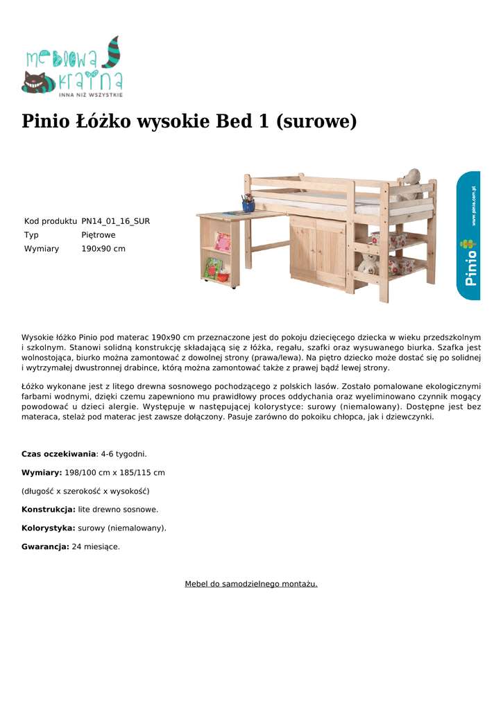 Pinio Łóżko wysokie Bed 1 (surowe) Kod produktu PN14_01_16_SUR Typ Piętrowe Wymiary 190x90 cm Wysokie łóżko Pinio pod materac 190x90 cm przeznaczone jest do pokoju dziecięcego dziecka w wieku przedszkolnym i szkolnym. Stanowi solidną konstrukcję składającą się z łóżka, regału, szafki oraz wysuwanego biurka. Szafka jest wolnostojąca, biurko można zamontować z dowolnej strony (prawa/lewa). Na piętro dziecko może dostać się po solidnej i wytrzymałej dwustronnej drabince, którą można zamontować także z prawej bądź lewej strony. Łóżko wykonane jest z litego drewna sosnowego pochodzącego z polskich lasów. Zostało pomalowane ekologicznymi farbami wodnymi, dzięki czemu zapewniono mu prawidłowy proces oddychania oraz wyeliminowano czynnik mogący powodować u dzieci alergie. Występuje w następującej kolorystyce: surowy (niemalowany). Dostępne jest bez materaca, stelaż pod materac jest zawsze dołączony. Pasuje zarówno do pokoiku chłopca, jak i dziewczynki. Czas oczekiwania: 4-6 tygodni. Wymiary: 198/100 cm x 185/115 cm (długość x szerokość x wysokość) Konstrukcja: lite drewno sosnowe. Kolorystyka: surowy (niemalowany). Gwarancja: 24 miesiące. Mebel do samodzielnego montażu.