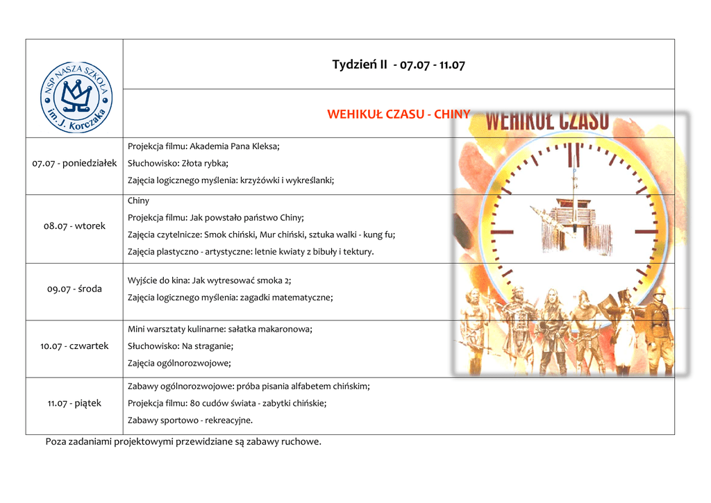 Tydzień II - 07.07 - 11.07 WEHIKUŁ CZASU - CHINY Projekcja filmu: Akademia Pana Kleksa; 07.07 - poniedziałek Słuchowisko: Złota rybka; Zajęcia logicznego myślenia: krzyżówki i wykreślanki; Chiny 08.07 - wtorek Projekcja filmu: Jak powstało państwo Chiny; Zajęcia czytelnicze: Smok chiński, Mur chiński, sztuka walki - kung fu; Zajęcia plastyczno - artystyczne: letnie kwiaty z bibuły i tektury. 09.07 - środa Wyjście do kina: Jak wytresować smoka 2; Zajęcia logicznego myślenia: zagadki matematyczne; Mini warsztaty kulinarne: sałatka makaronowa; 10.07 - czwartek Słuchowisko: Na straganie; Zajęcia ogólnorozwojowe; Zabawy ogólnorozwojowe: próba pisania alfabetem chińskim; 11.07 - piątek Projekcja filmu: 80 cudów świata - zabytki chińskie; Zabawy sportowo - rekreacyjne. Poza zadaniami projektowymi przewidziane są zabawy ruchowe.