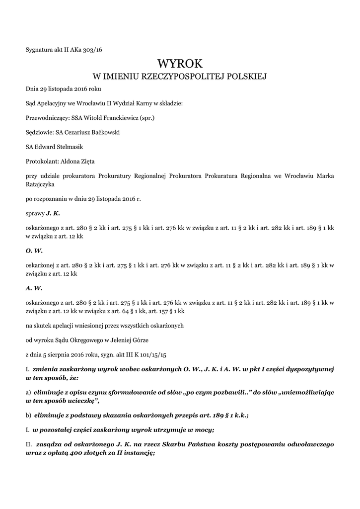 Sygnatura akt II AKa 303/16 WYROK W IMIENIU RZECZYPOSPOLITEJ POLSKIEJ Dnia 29 listopada 2016 roku Sąd Apelacyjny we Wrocławiu II Wydział Karny w składzie: Przewodniczący: SSA Witold Franckiewicz (spr.) Sędziowie: SA Cezariusz Baćkowski SA Edward Stelmasik Protokolant: Aldona Zięta przy udziale prokuratora Prokuratury Regionalnej Prokuratora Prokuratura Regionalna we Wrocławiu Marka Ratajczyka po rozpoznaniu w dniu 29 listopada 2016 r. sprawy J. K. oskarżonego z art. 280 § 2 kk i art. 275 § 1 kk i art. 276 kk w związku z art. 11 § 2 kk i art. 282 kk i art. 189 § 1 kk w związku z art. 12 kk O. W. oskarżonej z art. 280 § 2 kk i art. 275 § 1 kk i art. 276 kk w związku z art. 11 § 2 kk i art. 282 kk i art. 189 § 1 kk w związku z art. 12 kk A. W. oskarżonego z art. 280 § 2 kk i art. 275 § 1 kk i art. 276 kk w związku z art. 11 § 2 kk i art. 282 kk i art. 189 § 1 kk w związku z art. 12 kk w związku z art. 64 § 1 kk, art. 157 § 1 kk na skutek apelacji wniesionej przez wszystkich oskarżonych od wyroku Sądu Okręgowego w Jeleniej Górze z dnia 5 sierpnia 2016 roku, sygn. akt III K 101/15/15 I. zmienia zaskarżony wyrok wobec oskarżonych O. W., J. K. i A. W. w pkt I części dyspozytywnej w ten sposób, że: a) eliminuje z opisu czynu sformułowanie od słów „po czym pozbawili..” do słów „uniemożliwiając w ten sposób ucieczkę”, b) eliminuje z podstawy skazania oskarżonych przepis art. 189 § 1 k.k.; I. w pozostałej części zaskarżony wyrok utrzymuje w mocy; II. zasądza od oskarżonego J. K. na rzecz Skarbu Państwa koszty postępowaniu odwoławczego wraz z opłatą 400 złotych za II instancję; III. zwalnia oskarżonych (...)W. i A. W. od kosztów postępowania odwoławczego zaliczając je na rachunek Skarbu Państwa. UZASADNIENIE Prokurator Prokuratury Rejonowej w Jeleniej Górze oskarżył: O. W., J. K. i A. W. o to, że : I. w dniu 19 maja 2015 roku w J. i M., działając ze z góry powziętym zamiarem i w krótkich odstępach czasu oraz w celu osiągnięcia korzyści majątkowej, wspólnie i w porozumieniu oraz z nieustalonym mężczyzną co do którego materiały zostały wyłączone do odrębnego prowadzenia, dokonali rozboju na osobie i mieniu M. M. (1), grożąc pokrzywdzonemu natychmiastowym użyciem przemocy polegającej na jego pobiciu, gdzie w trakcie zdarzenia A. W. posługiwał się wobec niego niebezpiecznym narzędziem w postaci nałożonego na rękę kastetu, którym uderzył w twarz wymienionego, dokonali zaboru w celu przywłaszczenia samochodu osobowego M. (...) o numerze rejestracyjnym (...) o wartości 8.000 złotych, pieniędzy w kwocie 50 złotych, radioodtwarzacza marki P. o wartości 200 złotych, odzieży o wartości 1.500 złotych o łącznej wartości 9.750 zł oraz dowodu osobistego na nazwisko M. M. (1), a także dokumenty w postaci dowodu rejestracyjnego samochodu M. (...) i dowodu ubezpieczenia tegoż pojazdu, po czym w dalszym ciągu groźbą zamachu na życie i zdrowie pokrzywdzonego, grożąc użyciem przemocy polegającej na jego pobiciu, zmusili go do niekorzystnego rozporządzenia swoim mieniem nakazując sporządzenie i podpisanie dwóch pisemnych oświadczeń w tym zobowiązującego go do zwrotu w terminie 7 dni kwoty 1.500 złotych na rzecz J. K., a w sytuacji braku tejże zapłaty o przejściu własności samochodu osobowego M. (...) na rzecz J. K., po czym pozbawili M. M. (1) wolności w ten sposób, że nakazali mu wsiąść na tylne siedzenie samochodu osobowego M. (...) o numerze rejestracyjnym (...), gdzie J. K. i inny nieustalony personalnie mężczyzna usiedli z obu jego stron, a w trackie tankowania na stacji paliwowej L. w J. nieustalony mężczyzna przytrzymywał M. M. (1) za ramię, uniemożliwiając mu ucieczkę, gdzie w trackie jazdy samochodem przełamali kartę SIM z jego telefonu komórkowego, po czym zawieźli wymienionego do M., gdzie go pozostawili, czym działali na szkodę M. M. (1) i K. M., przy czym A. W. dopuścił się tego czynu będąc uprzednio karany za przestępstwa podobne wyrokami sądów Republiki Węgier z dnia 19 kwietnia 2012 roku w sprawie 4 BF (...) na karę 2 lat i 6 miesięcy pozbawienia wolności za czyn w postaci przemytu ludzi poprzez udzielenie pomocy wielu osobom § 218 oraz z dnia 14 października 2013 roku w sprawie 4 BF (...) na kary 2 lat i 3 lat pozbawienia wolności za czyny w postaci przymusu, wywierania nacisku, nękania, molestowania lub agresji psychicznej lub emocjonalnej oraz spowodowania ciężkiego uszkodzenia lub zniekształcenia ciała lub trwałego kalectwa, za które odbywał karę pozbawienia wolności w wymiarze nie mniejszym niż 6 miesięcy, której odbywanie zakończył w dniu 19 czerwca 2014 roku, tj. o czyn z art. 280 § 2 k .k. i art. 275 § 1 k . k . w zw. z art. 11 § 2 k . k . oraz art. 282 k . k . i art. 189 § 1 k . k . w zw. z art. 12 k . k . wobec oskarżonych O. W. i J. K. ; tj. o czyn z art. 280 § 2 k . k . i art. 275 § 1 k . k . w zw. z art. 11 § 2 k . k . oraz art. 282 k . k . i art. 189 § 1 k . k . w zw. z art. 12 kk w zw. z art. 64 § 1 k . k . wobec oskarżonego A. W. a nadto A. W. o to, że: II. w nocy z 25 na 26 kwietnia 2015 roku w J. w okolicy B. (...) przy ul. (...), uderzając M. M. (2) pałką teleskopową w głowę spowodował u niego obrażenia ciała w postaci podwójnego złamania żuchwy z niewielkim przemieszczeniem, które to obrażenia powodowały u pokrzywdzonego rozstrój zdrowia trwający powyżej 7 dni, przy czym czynu tego dopuścił się będąc uprzednio karany za przestępstwa podobne wyrokami sądów Republiki Węgier z dnia 19 kwietnia 2012 roku w sprawie 4 BF 85/2012/09 na karę 2 lat i 6 miesięcy pozbawienia wolności za czyn w postaci przemytu ludzi poprzez udzielenie pomocy wielu osobom § 218 oraz z dnia 14 października 2013 roku w sprawie 4 BF 444/2013/21 na kary 2 lat i 3 lat pozbawienia wolności za czyny w postaci przymusu, wywierania nacisku, nękania, molestowania lub agresji