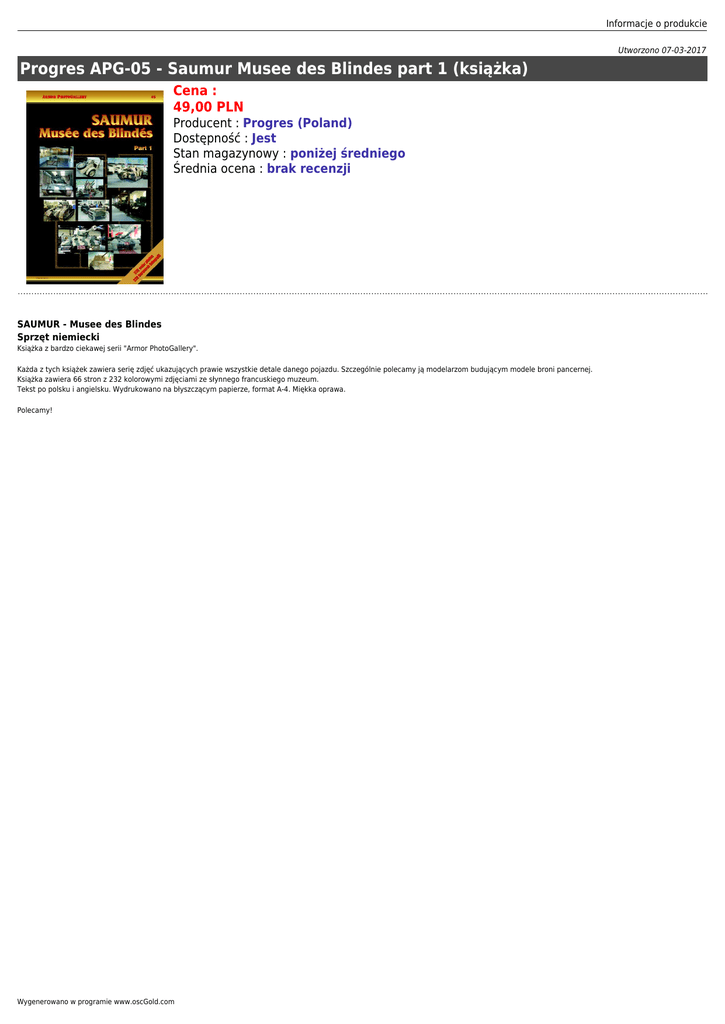 Informacje o produkcie Utworzono 07-03-2017 Progres APG-05 - Saumur Musee des Blindes part 1 (książka) Cena : 49,00 PLN Producent : Progres (Poland) Dostępność : Jest Stan magazynowy : poniżej średniego Średnia ocena : brak recenzji SAUMUR - Musee des Blindes Sprzęt niemiecki Książka z bardzo ciekawej serii "Armor PhotoGallery". Każda z tych książek zawiera serię zdjęć ukazujących prawie wszystkie detale danego pojazdu. Szczególnie polecamy ją modelarzom budującym modele broni pancernej. Książka zawiera 66 stron z 232 kolorowymi zdjęciami ze słynnego francuskiego muzeum. Tekst po polsku i angielsku. Wydrukowano na błyszczącym papierze, format A-4. Miękka oprawa. Polecamy! Wygenerowano w programie www.oscGold.com