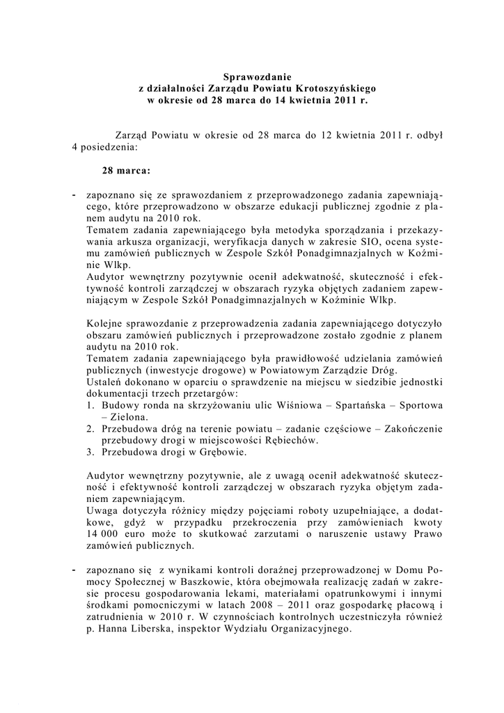 Sprawozdanie z działalności Zarządu Powiatu Krotoszyńskiego w okresie od 28 marca do 14 kwietnia 2011 r. Zarząd Powiatu w okresie od 28 marca do 12 kwietnia 2011 r. odbył 4 posiedzenia: 28 marca: - zapoznano się ze sprawozdaniem z przeprowadzonego zadania zapewniają cego, które przeprowadzono w obszarze edukacji publicznej zgodnie z pla nem audytu na 2010 rok. Tematem zadania zapewniającego była metodyka sporządzania i przekazywania arkusza organizacji, weryfikacja danych w zakresie SIO, ocena systemu zamówień publicznych w Zespole Szkół Ponadgimnazjalnych w Koźmi nie Wlkp. Audytor wewnętrzny pozytywnie ocenił adekwatność, skuteczność i efek tywność kontroli zarządczej w obszarach ryzyka objętych zadaniem zapew niającym w Zespole Szkół Ponadgimnazjalnych w Koźminie Wlkp. Kolejne sprawozdanie z przeprowadzenia zadania zapewniającego dotyczyło obszaru zamówień publicznych i przeprowadzone zostało zgodnie z planem audytu na 2010 rok. Tematem zadania zapewniającego była prawidłowość udzielania zamówień publicznych (inwestycje drogowe) w Powiatowym Zarządzie Dróg. Ustaleń dokonano w oparciu o sprawdzenie na miejscu w siedzibie jednostki dokumentacji trzech przetargów: 1. Budowy ronda na skrzyżowaniu ulic Wiśniowa – Spartańska – Sportowa – Zielona. 2. Przebudowa dróg na terenie powiatu – zadanie częściowe – Zakończenie przebudowy drogi w miejscowości Rębiechów. 3. Przebudowa drogi w Grębowie. Audytor wewnętrzny pozyt ywnie, ale z uwagą ocenił adekwatność skuteczność i efekt ywność kontroli zarządczej w obszarach ryzyka objęt ym zadaniem zapewniającym. Uwaga dot yczyła różnicy między pojęciami roboty uzupełniające, a dodatkowe, gdyż w przypadku przekroczenia przy zamówieniach kwot y 14 000 euro może to skutkować zarzutami o naruszenie ustawy Prawo zamówień publicznych. - zapoznano się z wynikami kontroli doraźnej przeprowadzonej w Domu Pomocy Społecznej w Baszkowie, która obejmowa ła realizację zadań w zakresie procesu gospodarowania lekami, materiałami opatrunkowymi i innymi środkami pomocniczymi w latach 2008 – 2011 oraz gospodarkę płacową i zatrudnienia w 2010 r. W czynnościach kontrolnych uczestniczyła również p. Hanna Liberska, inspektor Wydziału Organizacyjnego. 2 Kontrola spowodowana została wcześniejszym unieważnieniem przetargu na dostarczanie leków, który ogłoszono na 2011 r. Unieważnienie zostało spo wodowane faktem zaginięcia jednej z ofert. W specyfikacji nie podano, ja kie informacje powinny się znaleźć na kopercie zewnętrznej, co spowodowało, że trafiła do pokoju 202 mieszkańca, a nie do sekretariatu. Dyrektor DPS nie mia ł innego wyjścia, jak przetarg unieważnić i zrobił to zgodnie z procedurami i przepisami prawnymi. Ponadto przyjęto wystąpienie wnosząc o usunięcie stwierdzonych w toku czynności kontrolnych uchybień. - przyjęto odpowiedź na wystąpienie pokontrolne Dyrektor Powiatowego Centrum Pomocy Rodzinie w Krotoszynie, z którego wynika, że wszystkie stwierdzone nieprawidłowości i uchybienia zostały na bieżąco usunięte; - wyrażono zgodę na utworzenie dodatkowego etatu w księgowości w I Li ceum Ogólnokształcącym w Krotoszynie do końca bieżącego roku. Koszt y związane z dodatkowym etatem pokryje szkoła z własnego budżetu. - zatwierdzono aneks nr 9 do arkusza organizacji Zespołu Szkół Specjalnych w Krotoszynie na rok szkolny 2010/2011, który wiąże się ze zmianą podzia łu godzin; - przyznano nauczanie indywidualne dla ucznia klasy II I Liceum Ogólno kształcącego w wymiarze 12 godzin tygodniowo (do końca II semestru na uki w roku szkolnym 2010/2011); - przyznano nagrodę Dyrektorowi Specjalnego Ośrodka Szkolno-Wychowawczego w Konarzewie w związku z koordynowaniem realizacji projektu „Wiele Potrafimy- Chęt nie Pomożemy” w I kwartale 2011 r. w wysokości 3.000 zł. Środki na nagrodę pochodzą z Europejskiego Fundusz Społeczne go. - przyjęto sprawozdanie z realizacji gminnego planu odpadami dla miasta Sulmierzyce za lata 2009-2010 oraz sprawozdanie Miasta i Gminy Kobylin. Zgodnie z ustawą o odpadach sprawozdanie z realizacji planu gospodarki odpadami, gminy są zobowiązane przygotować do 31 marca, po upływie okresu sprawozdawczego. Na dzień dzisiejszy z tego obowiązku wywiązało się Miasto i Gmina Kobylin oraz Miasto Sulmierzyce. Sprawozdania te przedkładane są radom gminy oraz zarządowi powiatu. - przyjęto projekt uchwały Rady Powiatu Krotoszyńskiego w sprawie przeznaczenia części umorzonej pożyczki z Wojewódzkiego Funduszu Ochrony Środowiska i Gospodarki Wodnej w Poznaniu. Kwotę 32.000,00 zł z tytułu umorzenia 20% pożyczki przeznacza się na realizację przedsięwzięcia pn. „Wymiana stolarki okiennej w I Liceum Ogólnokształcącym im. H. Kołłątaja w Krotoszynie w ramach programu oszczęd ności energii” 3 - przyjęto sprawozdanie z wykonania budżetu Powiatu Krotoszyńskiego za 2010 r. oraz informację o stanie mienia Powiatu Krotoszyńskiego na dzień 31 grudnia 2010 r. Przyjęte materiały odwrotnie przesłane zostaną do Regionalnej Izby Obrachunkowej, łącznie ze sprawozdaniem rocznym z wykonania planu finansowego SPZOZ - podjęto uchwałę w sprawie akceptacji ustalonych kwot odszkodowania za przejęte pod budowę dróg nieruchomości; - postanowiono nieodpłatnie przekazać 37 sztuk płyt betonowych Radzie So łeckiej Wsi Cegielnia. W powyższej sprawie zwróciła się Rada Sołecka wsi Cegielnia (płyt y po rozbiórkowe po demontażu parkingu przy I LO w Koźminie Wlkp.) Płyt y te zostaną wykorzystane do utwardzenia powierzchni wokół przystanku autobusowego przy drodze powiatowej we wsi, którego lokalizacja musi zostać zmieniona, aby poprawić bezpieczeństwo korzystających dzieci. Natomiast pozostałe płyt y zostaną wykorzystane do naprawy pobocza drogi powiato wej zniszczonego po tegorocznej zimie oraz jesiennych ulewnych desz czach. - wyrażon