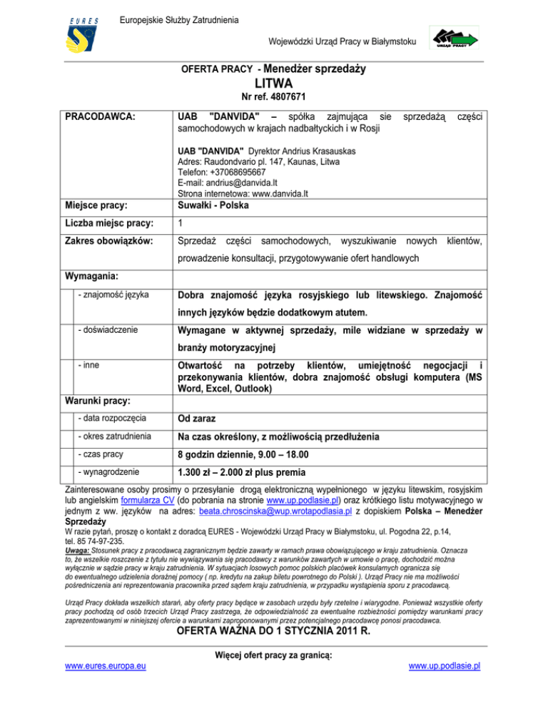 Europejskie Służby Zatrudnienia Wojewódzki Urząd Pracy w Białymstoku OFERTA PRACY - Menedżer sprzedaży LITWA Nr ref. 4807671 PRACODAWCA: UAB "DANVIDA" – spółka zajmująca sie samochodowych w krajach nadbałtyckich i w Rosji sprzedażą części UAB "DANVIDA" Dyrektor Andrius Krasauskas Adres: Raudondvario pl. 147, Kaunas, Litwa Telefon: +37068695667 E-mail: [email protected] Strona internetowa: www.danvida.lt Miejsce pracy: Suwałki - Polska Liczba miejsc pracy: 1 Zakres obowiązków: Sprzedaż części samochodowych, wyszukiwanie nowych klientów, prowadzenie konsultacji, przygotowywanie ofert handlowych Wymagania: - znajomość języka Dobra znajomość języka rosyjskiego lub litewskiego. Znajomość innych języków będzie dodatkowym atutem. - doświadczenie Wymagane w aktywnej sprzedaży, mile widziane w sprzedaży w branży motoryzacyjnej - inne Otwartość na potrzeby klientów, umiejętność negocjacji i przekonywania klientów, dobra znajomość obsługi komputera (MS Word, Excel, Outlook) Warunki pracy: - data rozpoczęcia Od zaraz - okres zatrudnienia Na czas określony, z możliwością przedłużenia - czas pracy 8 godzin dziennie, 9.00 – 18.00 - wynagrodzenie 1.300 zł – 2.000 zł plus premia Zainteresowane osoby prosimy o przesyłanie drogą elektroniczną wypełnionego w języku litewskim, rosyjskim lub angielskim formularza CV (do pobrania na stronie www.up.podlasie.pl) oraz krótkiego listu motywacyjnego w jednym z ww. języków na adres: [email protected] z dopiskiem Polska – Menedżer Sprzedaży W razie pytań, proszę o kontakt z doradcą EURES - Wojewódzki Urząd Pracy w Białymstoku, ul. Pogodna 22, p.14, tel. 85 74-97-235. Uwaga: Stosunek pracy z pracodawcą zagranicznym będzie zawarty w ramach prawa obowiązującego w kraju zatrudnienia. Oznacza to, że wszelkie roszczenie z tytułu nie wywiązywania się pracodawcy z warunków zawartych w umowie o pracę, dochodzić można wyłącznie w sądzie pracy w kraju zatrudnienia. W sytuacjach losowych pomoc polskich placówek konsularnych ogranicza się do ewentualnego udzielenia doraźnej pomocy ( np. kredytu na zakup biletu powrotnego do Polski ). Urząd Pracy nie ma możliwości pośredniczenia ani reprezentowania pracownika przed sądem kraju zatrudnienia, w przypadku wystąpienia sporu z pracodawcą. Urząd Pracy dokłada wszelkich starań, aby oferty pracy będące w zasobach urzędu były rzetelne i wiarygodne. Ponieważ wszystkie oferty pracy pochodzą od osób trzecich Urząd Pracy zastrzega, że odpowiedzialność za ewentualne rozbieżności pomiędzy warunkami pracy zaprezentowanymi w niniejszej ofercie a warunkami zaproponowanymi przez potencjalnego pracodawcę ponosi pracodawca. OFERTA WAŻNA DO 1 STYCZNIA 2011 R. www.eures.europa.eu Więcej ofert pracy za granicą: www.up.podlasie.pl