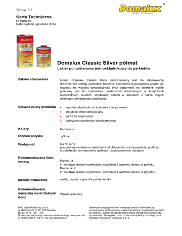 Strona 1/3 Karta Techniczna Nr Karty 03 Data wydania: grudzień 2014 Domalux Classic Silver półmat Lakier poliuretanowy jednoskładnikowy do parkietów Zakres stosowania Lakier Domalux Classic Silver przeznaczony jest do lakierowania drewnianych podłóg, parkietów, boazerii i elementów wyposażenia wnętrz. Ze względu na wysoką dekoracyjność oraz odporność na ścieranie wyrób polecany jest do malowania powierzchni drewnianych w budynkach mieszkalnych, biurach, szpitalach, salach w szkołach, a także innych obiektach użyteczności publicznej. Główne zalety produktu wysoka odporność na ścieranie i zarysowania elegancki efekt dekoracyjny do 15 lat odporności najwyższa odporność eksploatacyjna Kolory bezbarwny Stopień połysku półmat Wydajność Do 10 m2 /l przy jednej warstwie w zależności od chłonności i chropowatości podłoża w zależności od warunków aplikacji i zastosowanych narzędzi Rekomendowana ilość warstw Parkiet: 3 (1 warstwa finalna w półmacie, wcześniej 2 warstwy lakieru w połysku) Boazeria: 2 (1 warstwa finalna w półmacie, wcześniej 1 warstwa lakieru w połysku) Metoda malowania wałek, pędzel, szpachla parkieciarska Rekomendowane narzędzia marki Dekoral Gold Wałek nylonowy PPG Deco Polska Sp. z o.o. ul. Kwidzyńska 8; 51- 416 Wrocław tel. (071) 78 – 80 – 700 Dodatkowe informacje i aktualna dokumentacja dostępna pod nr infolinii 801 11 33 11 i na www.domalux.pl Informacje znajdujące się w niniejszej Karcie Technicznej są przygotowane według naszej najlepszej wiedzy i są aktualne na dzień jej wydruku. Spółka zastrzega sobie prawo korygowania zmian bez uprzedzenia. Ze względu na to, iż warunki aplikacji pozostają poza kontrolą PPG Deco Polska Sp. z o. o. Strona 2/3 Limit zawartości LZO wg dyrektywy 2004/42/WE (kat. A/i/FR) 500g/l (2010). Produkt zawiera max. 500 g/l. Zawartość LZO Parametry techniczne Norma/Wytyczne Wartość Ilość warstw --------------------------- 1-2 połysk + 1 półmat Nanoszenie kolejnej warstwy po ok. [h] ---------------------------- po 12 Czas schnięcia powierzchniowego [h], najwyżej PN EN ISO 1517 Gęstość w 20±0,5C, [g/cm3] PN-EN ISO 2811-1 Rozlewność, stopień, co najmniej PN-C-81507 8 PN-C-81701 20÷35 PN-EN ISO 1518 1000 Czas wypływu mierzony kubkiem wypływowym z dnem, stożkowym o średnicy otworu wypływowego4 mm, [s] Odporność powłoki na zarysowanie, [g], co najmniej Współczynnik tarcia kinetycznego (statycznego) μ w stanie suchym, „połysk” zgodnie z DIN V 180322: 2001-04, co najmniej Przygotowanie podłoża DIN EN-ISO/IE 17025:2005 4 1,000 ÷1,020 0,4 ÷ 0,6 Powierzchnie drewniane przeznaczone do lakierowania powinny być czyste i suche bez pozostałości np. past woskowych i środków nabłyszczających. Stare powłoki lakierowe należy usunąć a powierzchnię dokładnie odpylić. W celu zabezpieczenia podłoża przed ciemnieniem należy zagruntować lakierem podkładowym wiążącym Domalux Capon Extra. Tak przygotowane podłoże nadaje się do lakierowania lakierem Domalux Classic Silver połysk w ilości dwóch warstw (wskazówki dotyczące lakierowania lakierem Domalux Classic Silver połysk można znaleźć w KT tego produktu). Po wyschnięciu drugiej warstwy lakieru Domalux Classic Silver połysk należy wykonać szlif międzywarstwowy papierem ściernym o granulacji 120 – 150 w celu usunięcia ewentualnych zanieczyszczeń. Kolejnym etapem prac jest przygotowanie pomieszczenia do wykonania aplikacji lakieru w wersji półmat, czyli dokładne sprzątanie oraz zabezpieczenia pomieszczenia przed możliwością powstania „przeciągów”, które przyczyniają się do pojawiania się zanieczyszczeń, „chrupek” widocznych po wyschnięciu na powłoce lakieru. W tym celu w pomieszczeniu, w którym przeprowadzane są prace lakiernicze należy pozamykać okna, drzwi, itp. Jeżeli pomieszczenie nie posiada drzwi wejściowych należy zabezpieczyć wejście poprzez zaklejenie folią malarską. PPG Deco Polska Sp. z o.o. ul. Kwidzyńska 8; 51- 416 Wrocław tel. (071) 78 – 80 – 700 Dodatkowe informacje i aktualna dokumentacja dostępna pod nr infolinii 801 11 33 11 i na www.domalux.pl Informacje znajdujące się w niniejszej Karcie Technicznej są przygotowane według naszej najlepszej wiedzy i są aktualne na dzień jej wydruku. Spółka zastrzega sobie prawo korygowania zmian bez uprzedzenia. Ze względu na to, iż warunki aplikacji pozostają poza kontrolą PPG Deco Polska Sp. z o. o. Strona 3/3 Lakierowanie Przed użyciem lakier należy wymieszać poprzez kilkakrotne silne wytrząsanie w zamkniętym opakowaniu. W razie potrzeby dopuszcza się dodatek rozpuszczalnika w ilości max 2% obj. Rozcieńczalnik należy dodawać bezpośrednio przed aplikacją. Do lakierowania najkorzystniej stosować wałki lakiernicze nylonowe, odporne na działanie rozpuszczalników. W przypadku stosowania lakieru w wersji półmatowej dwie pierwsze warstwy zaleca się wykonać lakierem Domalux Classic Silver połysk. Aplikacja Lakieru Domalux Classic Silver w wersji półmat Ilość lakieru na mokro Produkt [ml/m2] Capon do 100 Domalux Classic Silver połysk min. 100 Domalux Classic Silver połysk min. 100 Domalux Classic Silver półmat 130 - 150 Warunki aplikacji Temperatura powietrza powinna wynosić od 15 °C do 25 °C. Wilgotność lakierowanego drewna powinna być nie większa niż 9 %. Względna wilgotność powietrza od 40 % do 65 %. Informacje dodatkowe Domalux Classic Silver półmat nie może być stosowany w salach gimnastycznych. Naturalną tendencją lakierów półmatowych poliuretanowych jest wypływanie lub osadzanie się wosku na ściankach opakowania, co nie wpływa, na jakość i trwałość finalnej powłoki. W przypadku renowacji podłóg polakierowanych wcześniej lakierami wodorozcieńczalnymi należy dokładnie usunąć starą powłokę do surowego drewna oraz starannie wyszpachlować powierzchnię. Pozostałości lakieru wodorozcieńczalnego mog