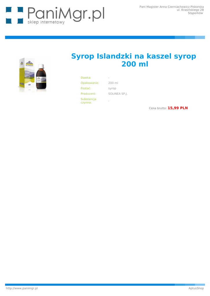 Pani Magister Anna Czerniachowicz-Piskorska ul. Krasińskiego 2B Stąporków Syrop Islandzki na kaszel syrop 200 ml Dawka: - Opakowanie: 200 ml Postać: syrop Producent: SOLINEA SP.J. Substancja czynna: Cena brutto: http://www.panimgr.pl 15,99 PLN AptusShop
