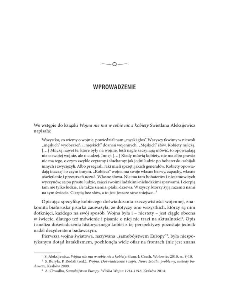 Wprowadzenie We wstępie do książki Wojna nie ma w sobie nic z kobiety Swietłana Aleksijewicz napisała: Wszystko, co wiemy o wojnie, powiedział nam „męski głos”. Wszyscy tkwimy w niewoli „męskich” wyobrażeń i „męskich” doznań wojennych. „Męskich” słów. Kobiety milczą. […] Milczą nawet te, które były na wojnie. Jeśli nagle zaczynają mówić, to opowiadają nie o swojej wojnie, ale o cudzej. Innej. […] Kiedy mówią kobiety, nie ma albo prawie nie ma tego, o czym zwykle czytamy i słuchamy: jak jedni ludzie po bohatersku zabijali innych i zwyciężyli. Albo przegrali. Jaki mieli sprzęt, jakich generałów. Kobiety opowiadają inaczej i o czym innym. „Kobieca” wojna ma swoje własne barwy, zapachy, własne oświetlenie i przestrzeń uczuć. Własne słowa. Nie ma tam bohaterów i niesamowitych wyczynów, są po prostu ludzie, zajęci swoimi ludzkimi-nieludzkimi sprawami. I cierpią tam nie tylko ludzie, ale także ziemia, ptaki, drzewa. Wszyscy, którzy żyją razem z nami na tym świecie. Cierpią bez słów, a to jest jeszcze straszniejsze...1 Opisując specyfikę kobiecego doświadczania rzeczywistości wojennej, znakomita białoruska pisarka zauważyła, że dotyczy ono wszystkich, którzy są nim dotknięci, każdego na swój sposób. Wojna była i – niestety – jest ciągle obecna w świecie, dlatego też mówienie i pisanie o niej nie traci na aktualności2. Opis i analiza doświadczenia historycznego kobiet z tej perspektywy pozostaje jednak nadal dezyderatem badawczym. Pierwsza wojna światowa, nazywana „samobójstwem Europy”3, była niespotykanym dotąd kataklizmem, pochłonęła wiele ofiar na frontach (nie jest znana S. Aleksijewicz, Wojna nie ma w sobie nic z kobiety, tłum. J. Czech, Wołowiec 2010, ss. 9-10. S. Buryła, P. Rodak (red.), Wojna. Doświadczenie i zapis. Nowe źródła, problemy, metody badawcze, Kraków 2008. 3 A. Chwalba, Samobójstwo Europy. Wielka Wojna 1914-1918, Kraków 2014. 1 2 10 Wprowadzenie liczba kobiet-żołnierek w różnych armiach) i poza nimi, gdyż w konflikt wciągnięta została także ludność cywilna. Do skutków politycznych Wielkiej Wojny należy zaliczyć przede wszystkim rewolucję w Rosji i zmianę na mapie Europy, która dla Polski okazała się bardzo korzystna. Wskutek upadku trzech mocarstw zaborczych Polska odzyskała niepodległość. Kształt jej wschodnich granic został określony w wyniku układu po wojnie polsko-bolszewickiej (1918-1920). Dalekosiężną konsekwencją I wojny światowej była zmiana sytuacji kobiet, które po jej zakończeniu nie wróciły już do tradycyjnych XIX-wiecznych ról. Lata 1913-1919 nazywane są „godziną kobiet”4. Kobiety, które na wojnie straciły mężów i dorobek życia, były zmuszone do podjęcia pracy. Efektem tego stał się późniejszy proces emancypacji kobiet i przeobrażenia społeczno-kulturalne. Przełomem było uzyskanie przez kobiety prawa wyborczego. Niektóre z nich rozpoczęły aktywną działalność polityczną, stając się pełnoprawnymi obywatelkami nowoczesnych społeczeństw. Wielka Wojna i jej skutki rzuciły cień na następne 25 lat labilnego pokoju. Angażując ogromne masy ludzkie i potencjały przemysłowe, następna dekada oznaczała także dla Europy starcie na „froncie wewnętrznym”. Bo jak inaczej można ocenić kształtowanie przez zwycięzców rewolucji bolszewickiej „nowego” społeczeństwa w Rosji, czyniących z tego eksperymentu wszechogarniającą wojnę z własnym narodem? Podobnie rzecz się miała z Niemcami, rządzonymi od 1933 r. przez nazistów. Podziały ideologiczne obecne na Starym Kontynencie ujawniły się także w latach hiszpańskiej wojny domowej, bezpośrednio poprzedzającej wybuch drugiej wojny światowej. Trudno sobie wyobrazić europejskie ruchy faszystowskie i komunistyczne bez obecności w nich kobiet i ich poparcia. Niektórzy badacze nazywają lata 1914-1945 „drugą wojną trzydziestoletnią”5. Rzeczywiście było to jedno pokolenie, którego doświadczeniem stała się wojna w sensie realnym bądź mentalnym, zaś postawy pacyfistyczne uznawano za odstępstwo od normy społecznej. Reprezentacje doświadczeń wojennych są i muszą być różne, tak jak różnią się od siebie poszczególni ludzie, jednak można z nich wyprowadzić pewne linie, tworzące siatkę takich doświadczeń, których przebieg warto dokładniej prześledzić. Należą do nich np. role i funkcje kobiet w teatrze działań wojennych (od kobiety-szpiega do walczącej z bronią żołnierki w powstaniu warszawskim), kobiety w szpitalu polowym w bezpośredniej bliskości linii frontu i w fabryce zbrojeniowej (leczy mężczyznę, który potem będzie walczył na froncie, bierze aktywny udział w produkcji śmiercionośnych środków bojowych, ale pracuje, aby utrzymać rodzinę). Doświadczenie wojny to także utracona godność i cześć kobiety – gwałty i zbrodnie, które pojawiają się zawsze tam, gdzie toczą się konflikty zbrojne. A. Meiners, Die Stunde der Frauen − zwischen Monarchie, Weltkrieg und Wahlrecht 19131919, München 2013. 5 Taką interpretację przedstawiają głównie historycy z krajów niemieckojęzycznych. Por. E. Piper, Das Zeitalter der Weltkriege 1914-1945, Köln 2014, s. 10. 4 Wprowadzenie 11 Trudno wymienić wszystkie elementy składające się na całość doświadczenia wojennego kobiet. Są one inne niż męskie także ze względu na rolę matki, chroniącej życie i rodzinę, aby zabezpieczyć przyszłość, w czysto biologicznym znaczeniu. W tym aspekcie pierwsza i druga wojna światowa różnią się od siebie istotnie. Obie przyniosły wielkie fale uchodźców, a transfer ludności cywilnej osiągnął niespotykane do tej pory rozmiary (przemieszczenia, wywózki, wypędzenia), lecz tragedia i wymiar Zagłady, której celem było wyniszczenie całego narodu, stanowi osobny temat. Doświadczenia wojenne nadal oddziałują na następne pokolenia i nie spos